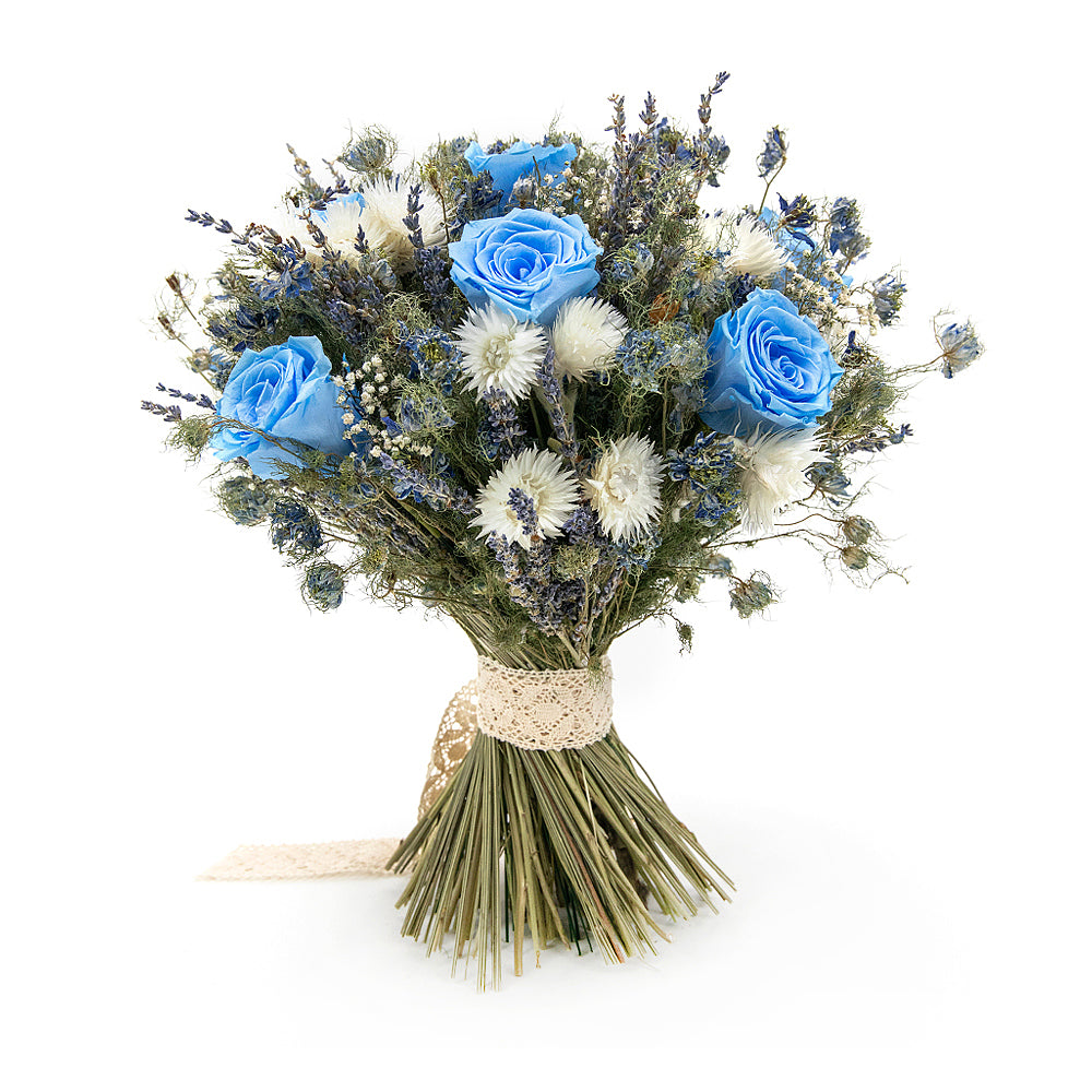 Sušená kytica z jemných modrých In Eterno večných ruží ozdobená sušenou gypsomilou, levanduľou, dekoračnými trávami a slamienkami.