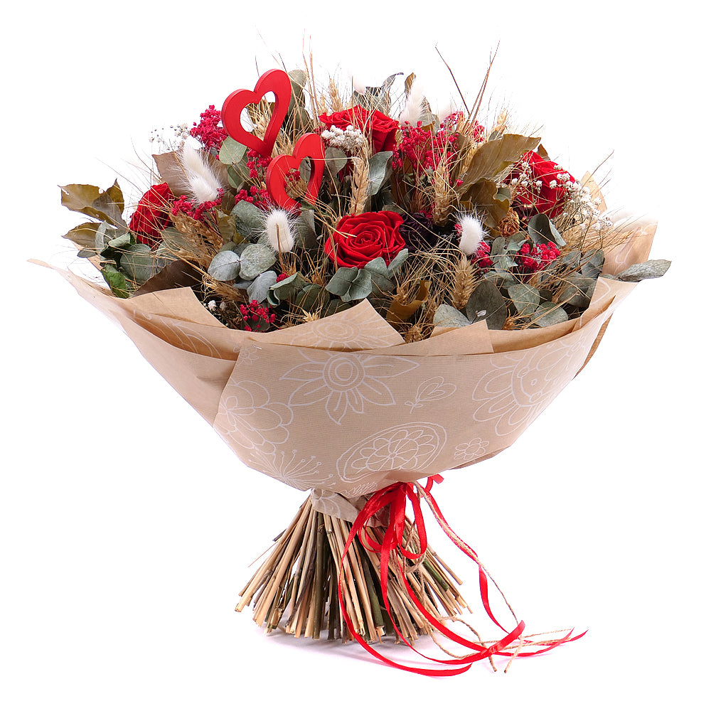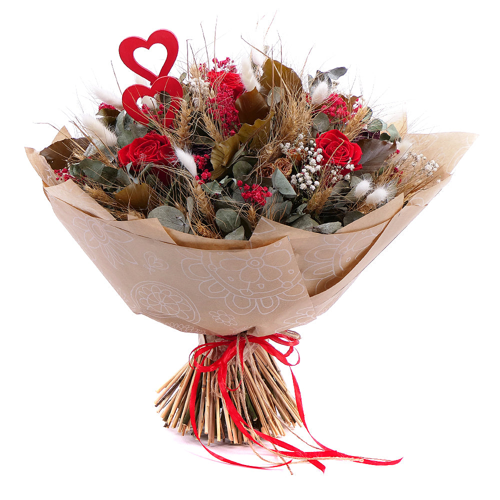 Irigo sušená kytice preparované růže Monalisa red srdíčka