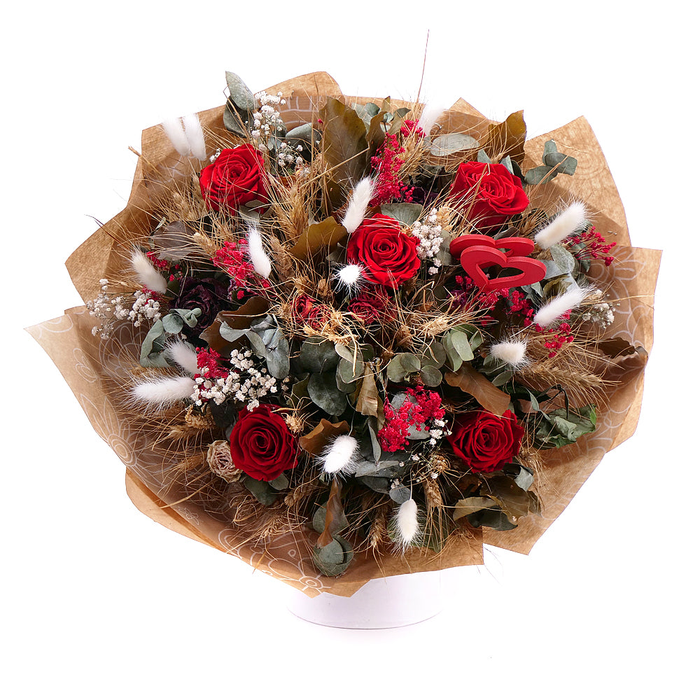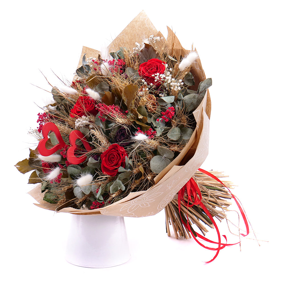 Elegantní sušená kytice z preparovaných In eterno růží červené barvy s přírodními doplňky a dekoračním papírem se staténovou stuhou.