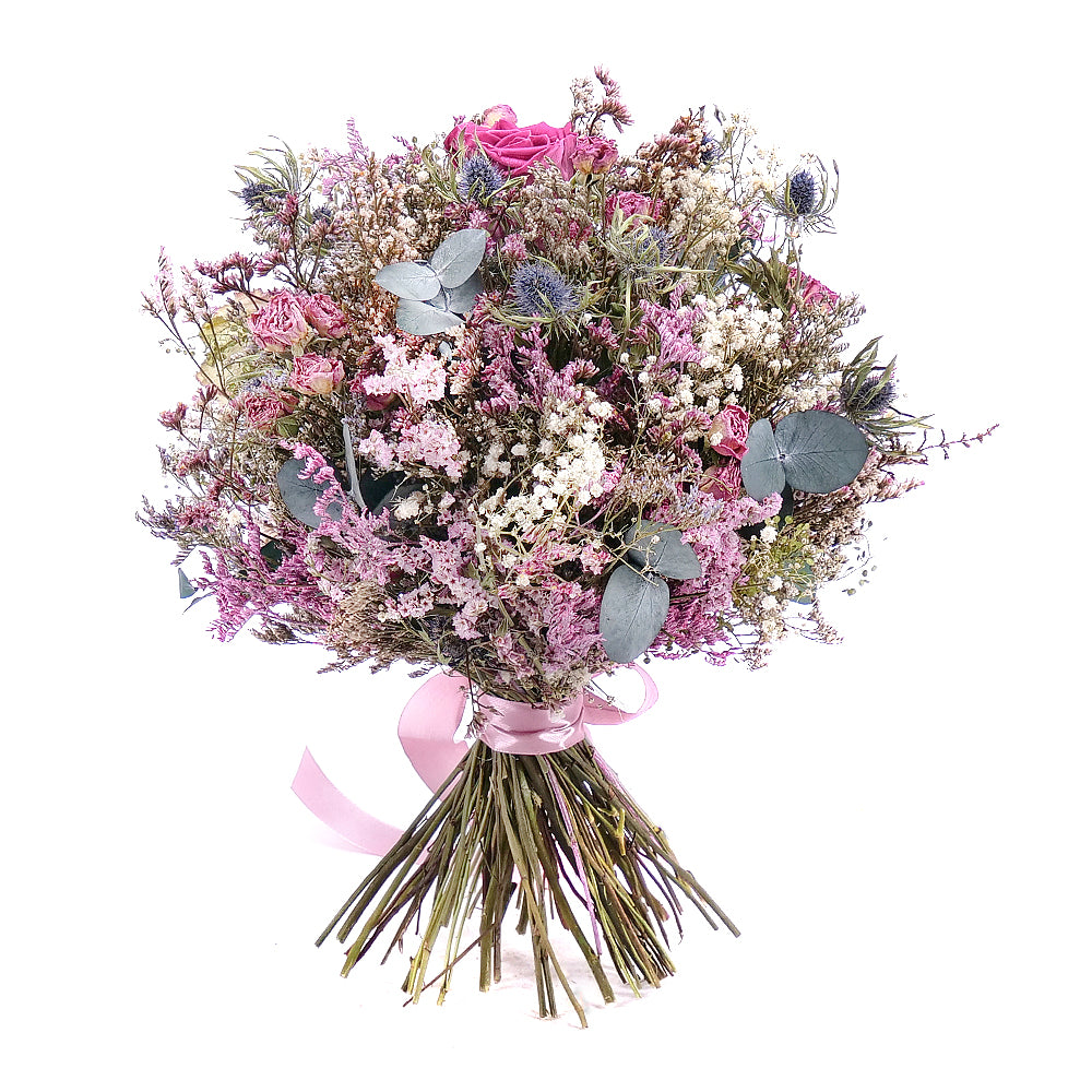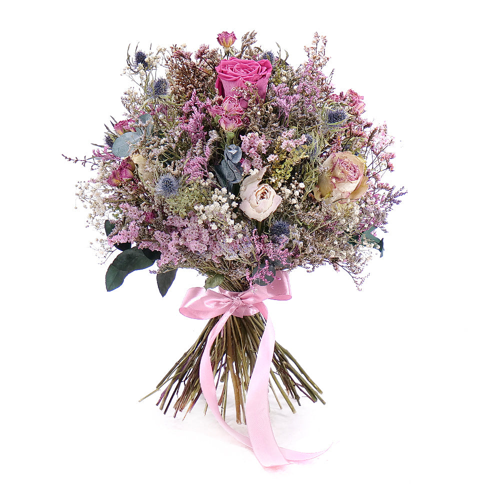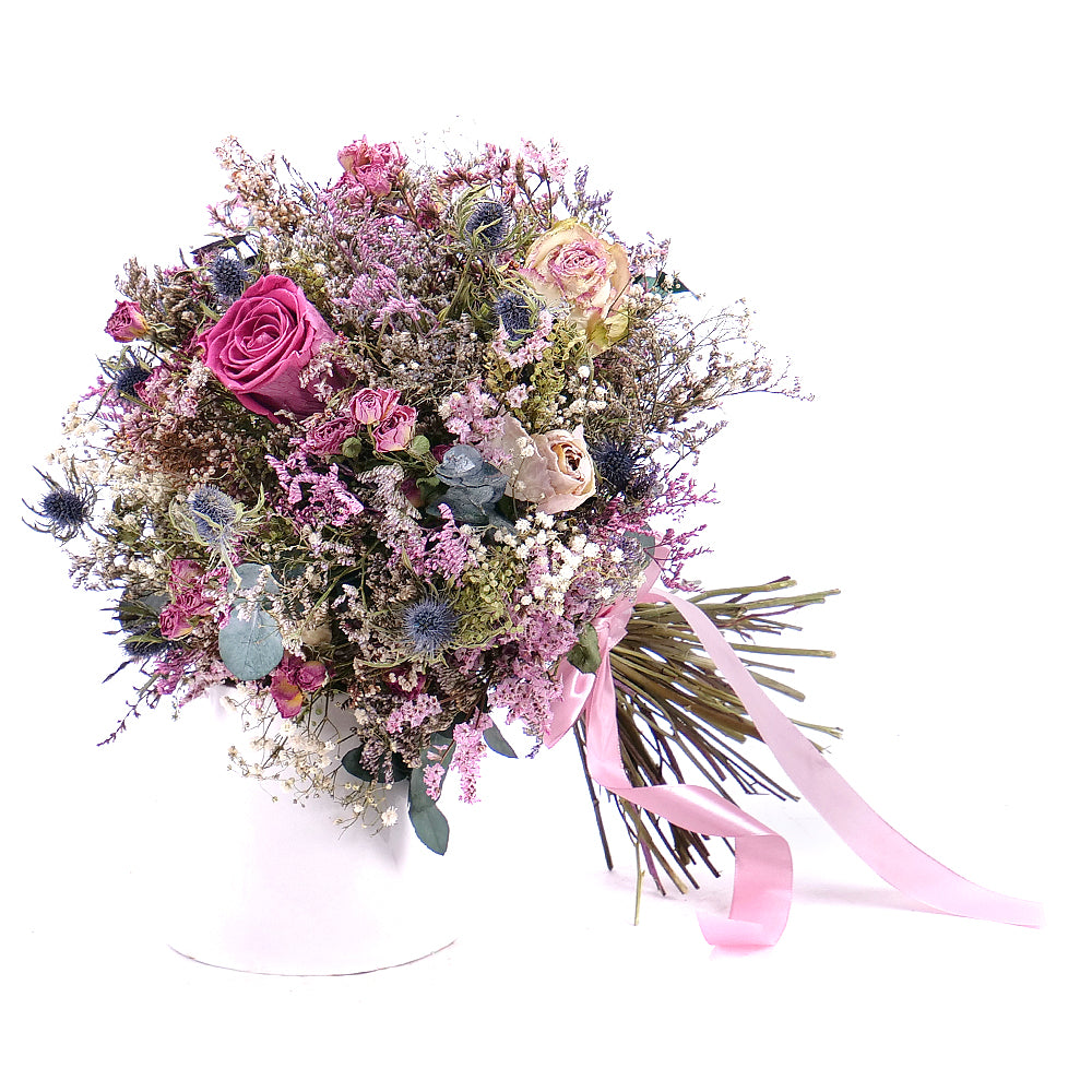 Exkuzivní sušená kytice vínové barvy se sušenými, přírodními doplňky květin a materiálů aranžovaná s In eterno věčnou preparovanou růží. Kytice je doplněna saténovou stuhou.