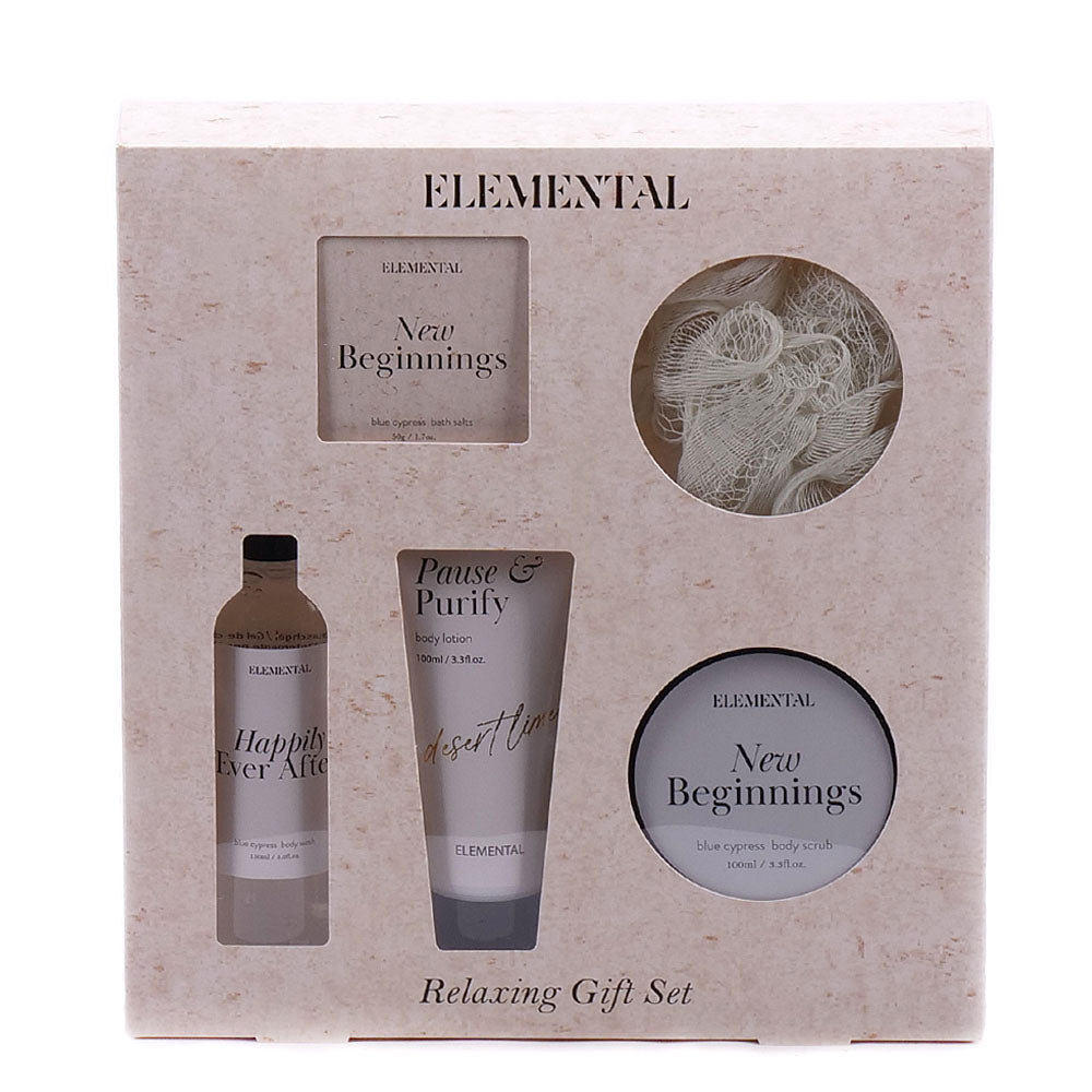 Darčekový relaxačný set, ktorý obsahuje: soľ do kúpeľa 1 ks, hubku na umývanie - 1 ks, telový píling - 1 ks, telové mlieko - 1 ks, telové mydlo - 1 ks.