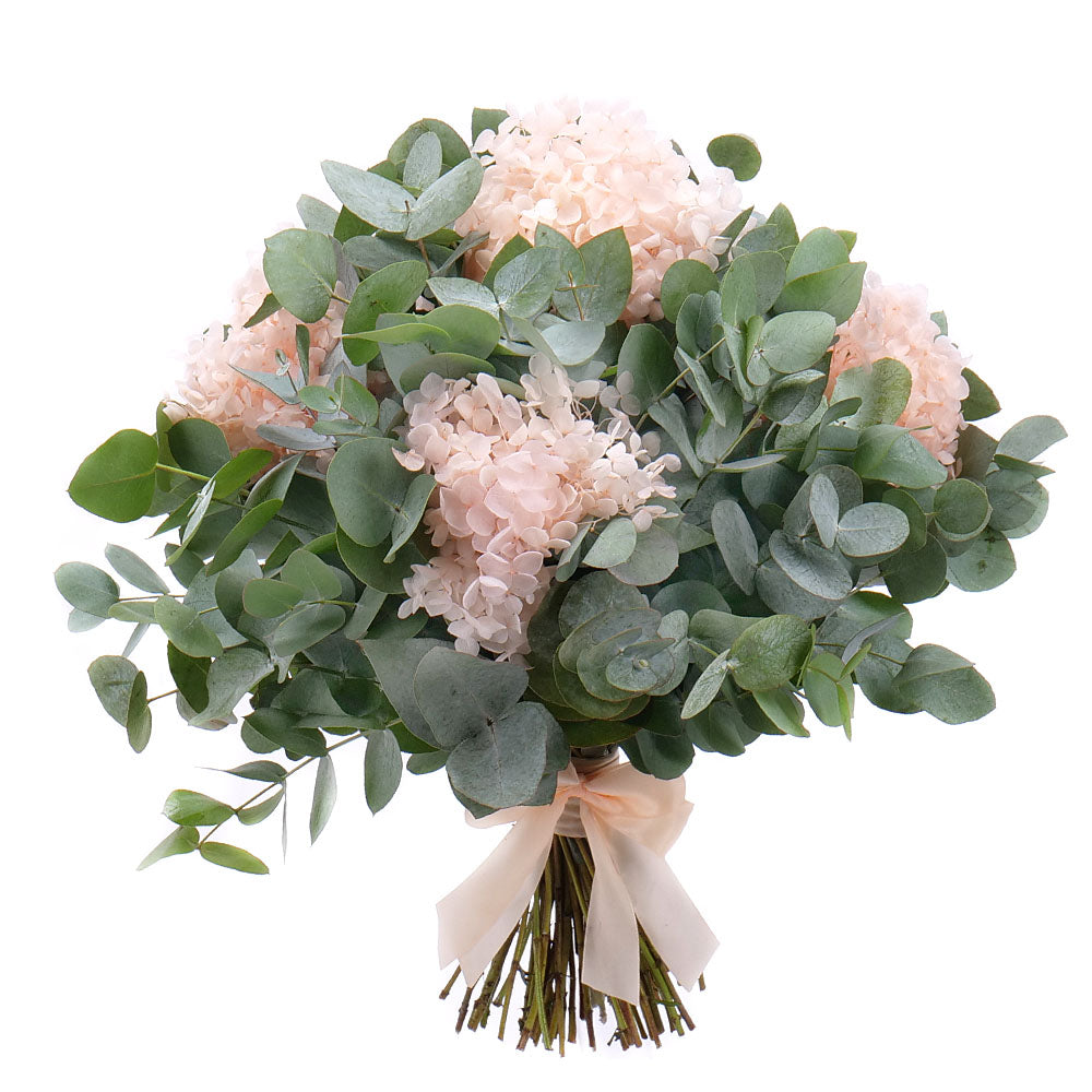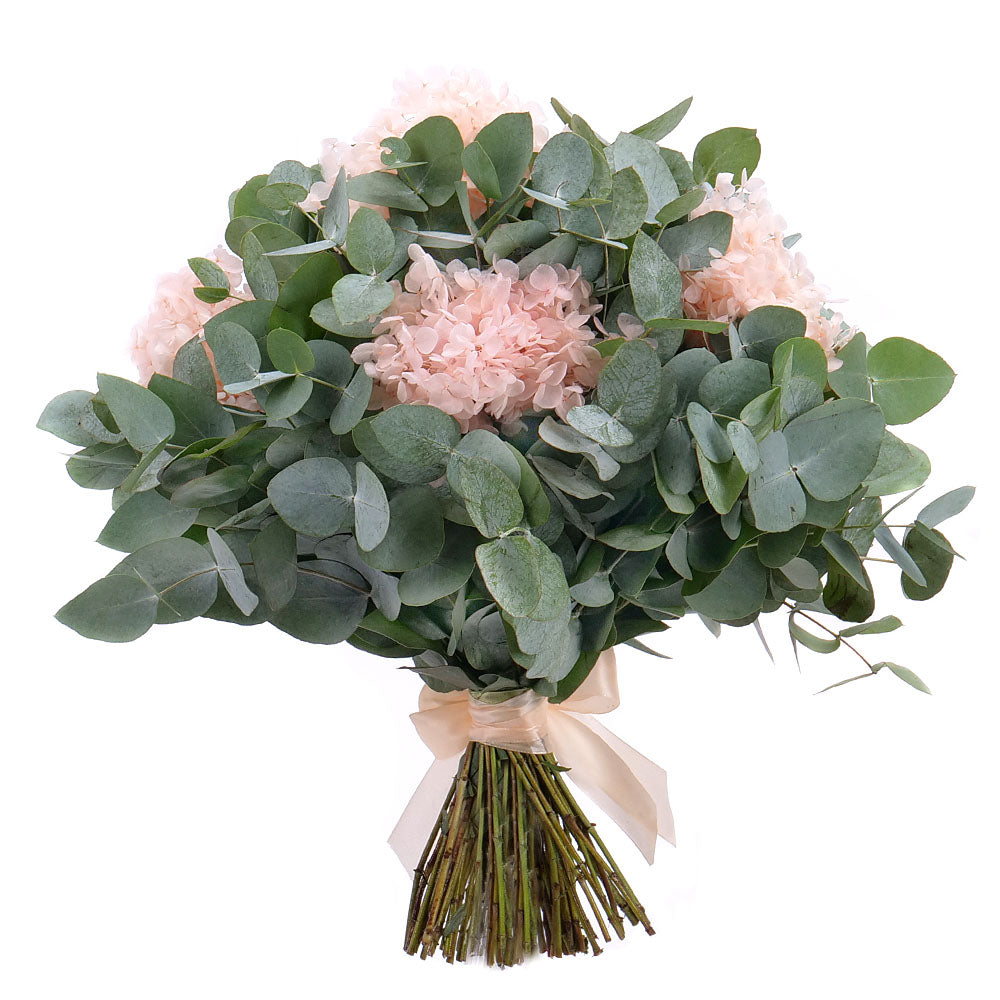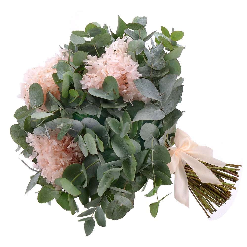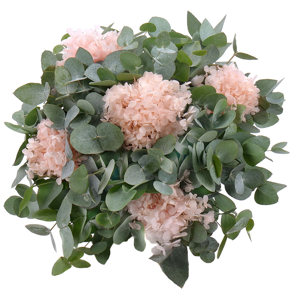 Živá kytica spája sviežu zeleň eukalyptu s jemnosťou preparovanej hortenzie v nežnom marhuľovom odtieni. Kombinácia prírodnej ľahkosti a tlmených farieb pôsobí harmonicky a nadčasovo. Marhuľová hortenzia prináša do kytice teplý, sofistikovaný akcent, zati