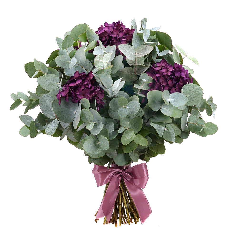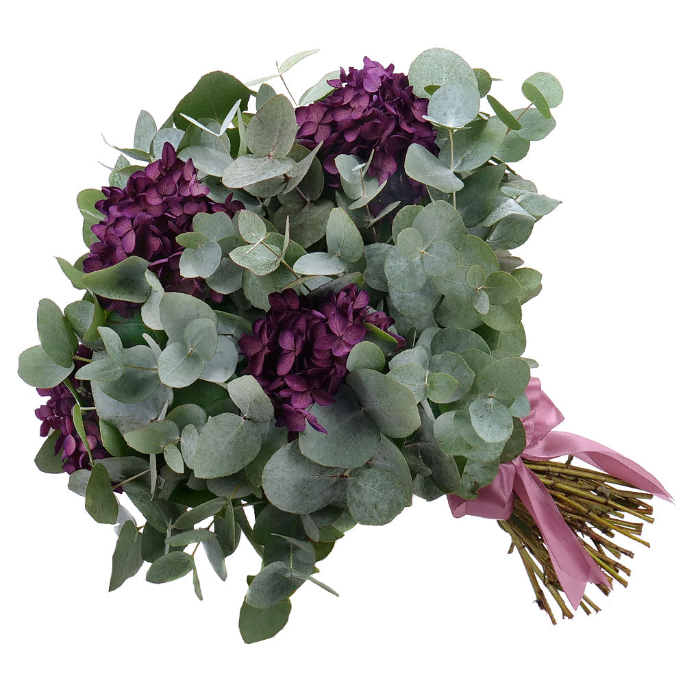 Výrazná kytica spája sviežosť živého eukalyptu s tajomnou krásou preparovanej hortenzie v tmavofialovom odtieni. Hortenzia pôsobí hlboko, zmyselne a noblesne, zatiaľ čo eukalyptus vnáša do celku jemnosť a prirodzený pohyb. Saténová stuha dodáva kytici fin