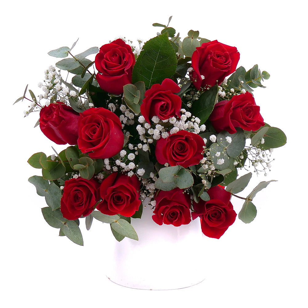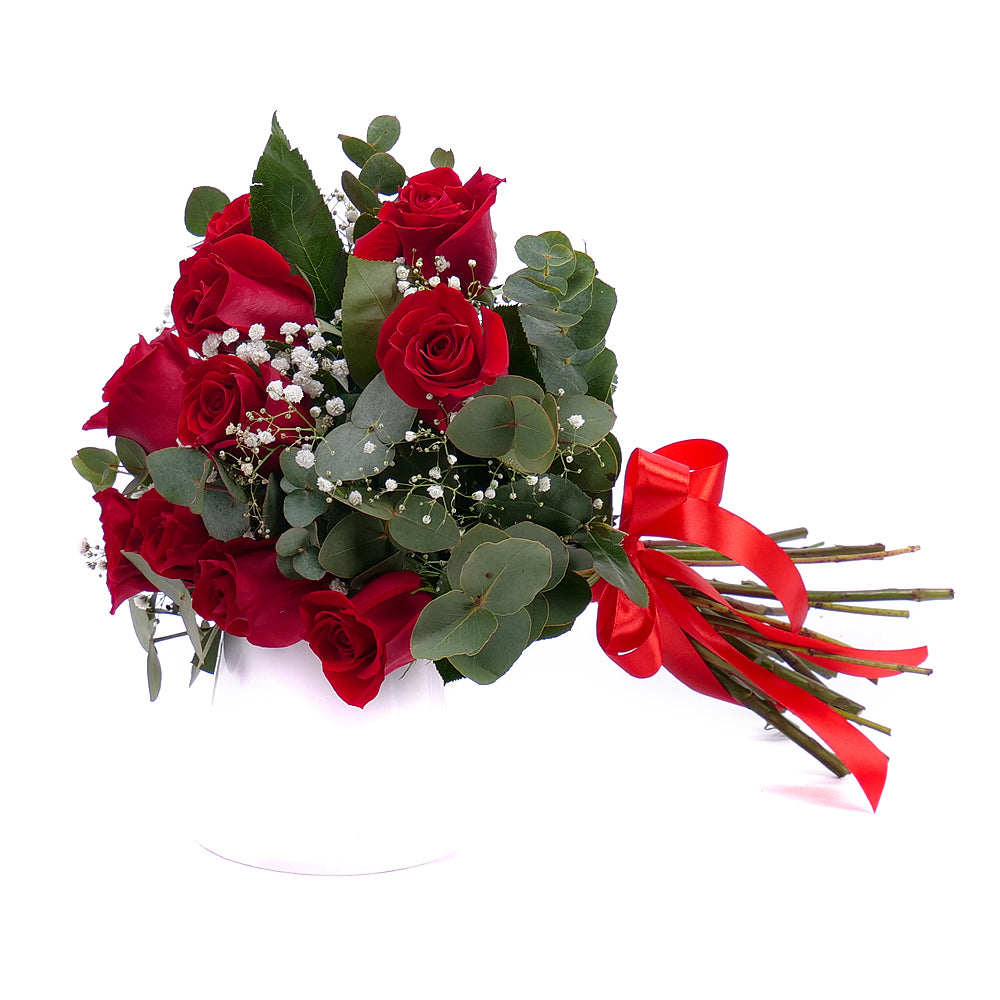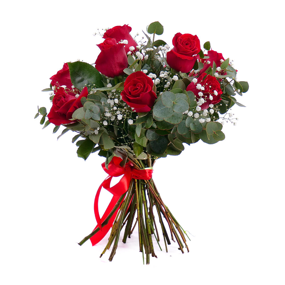 Kytice červených růží s eukalyptem doplněná červenou saténovou stuhou. Vhodný dárek pro každou příležitost. Přečtěte si více