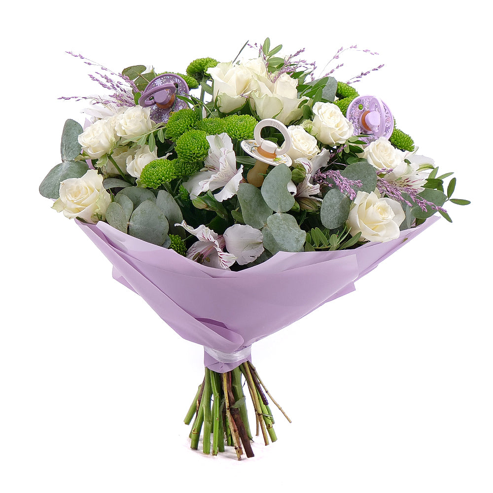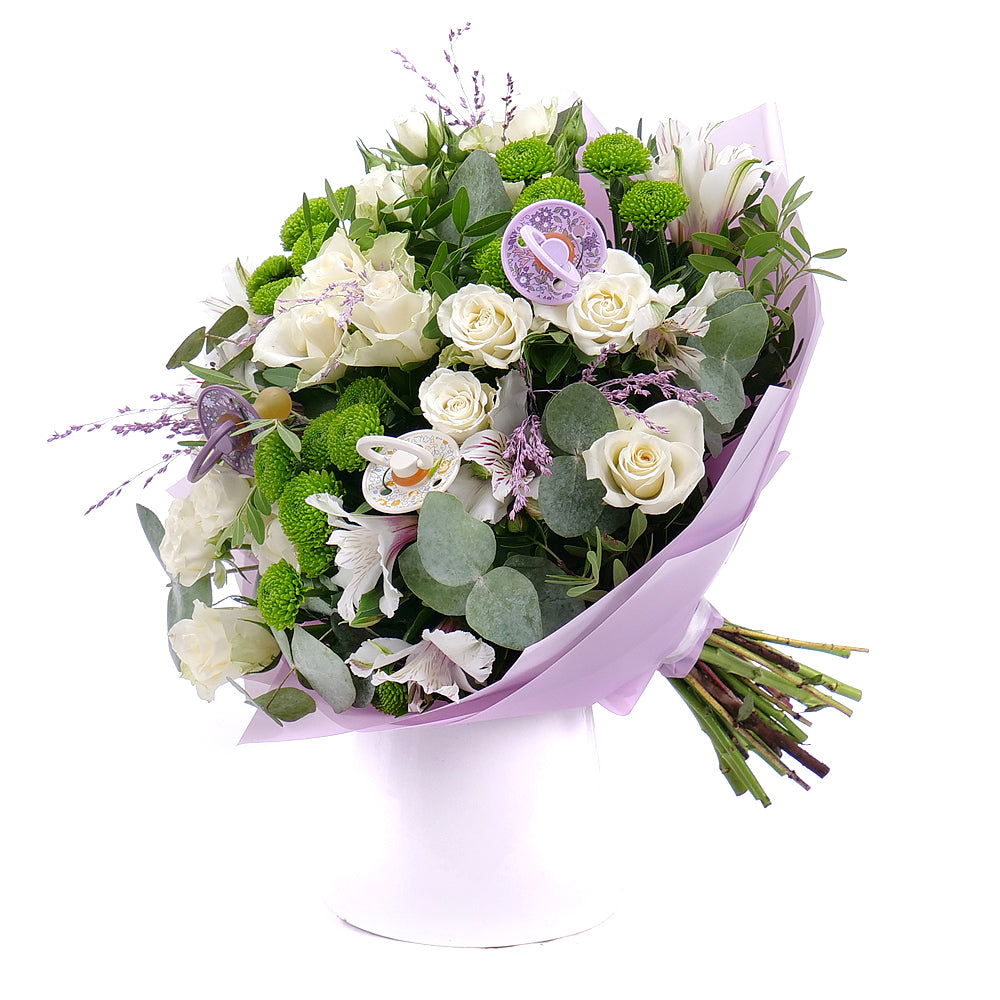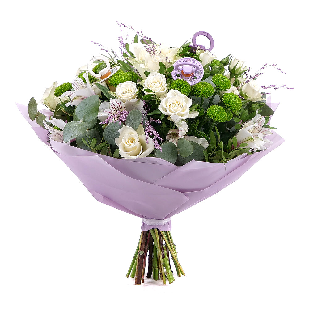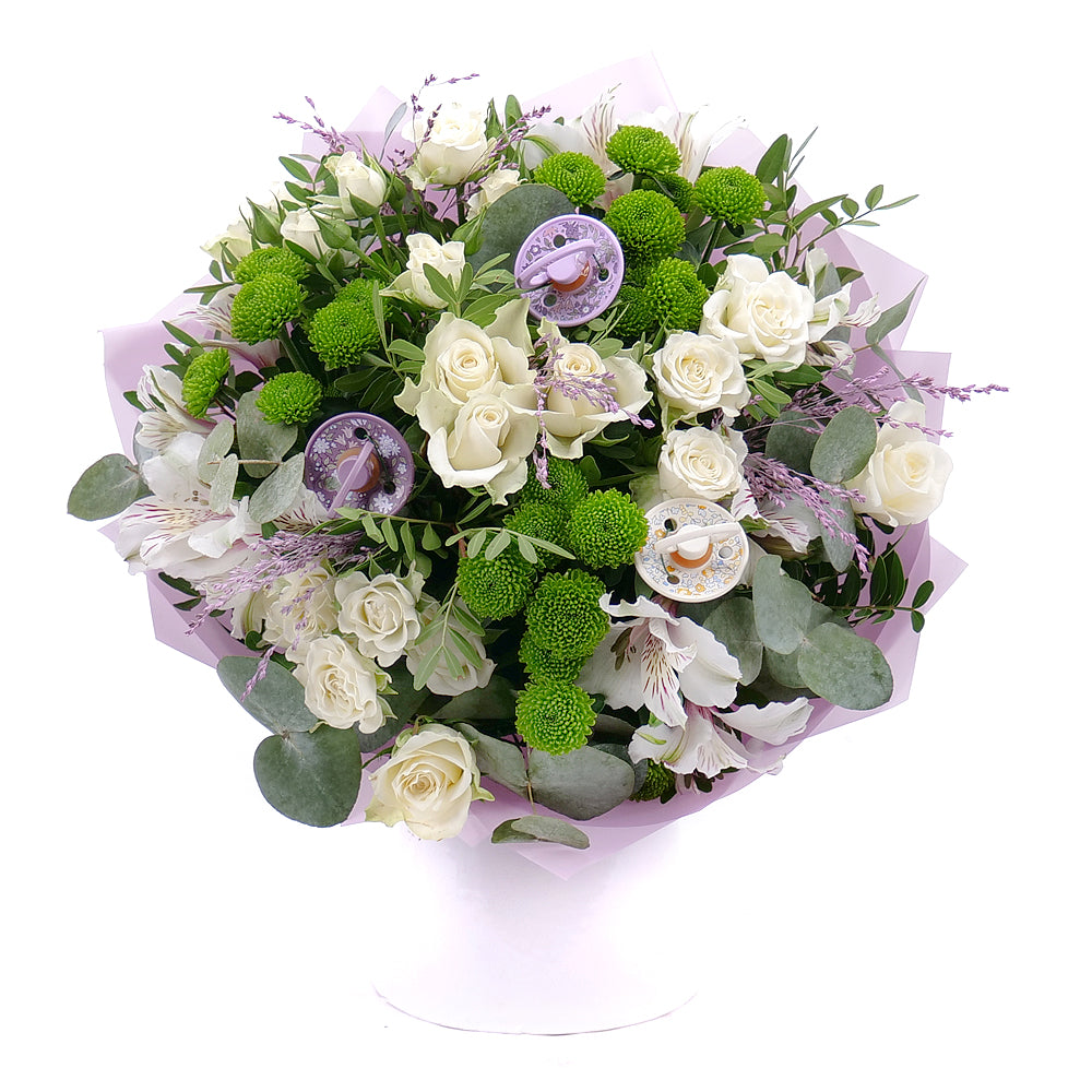 Stylová kytice z míchaných květin doplněná dudlíky BIBS - 3 ks, s dekorační zelení a ozdobným papírem. Kytice je vhodná pro darování ke svátku pro všechny malé oslavenkyně.