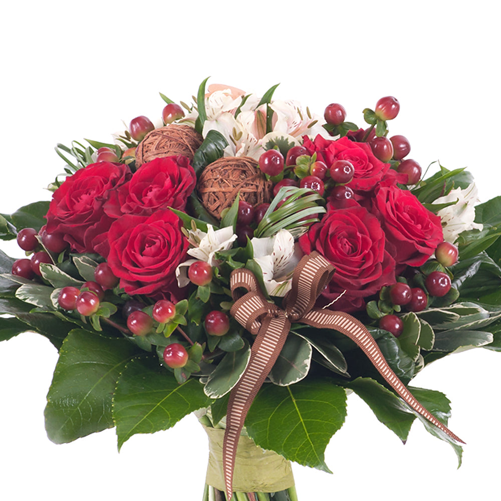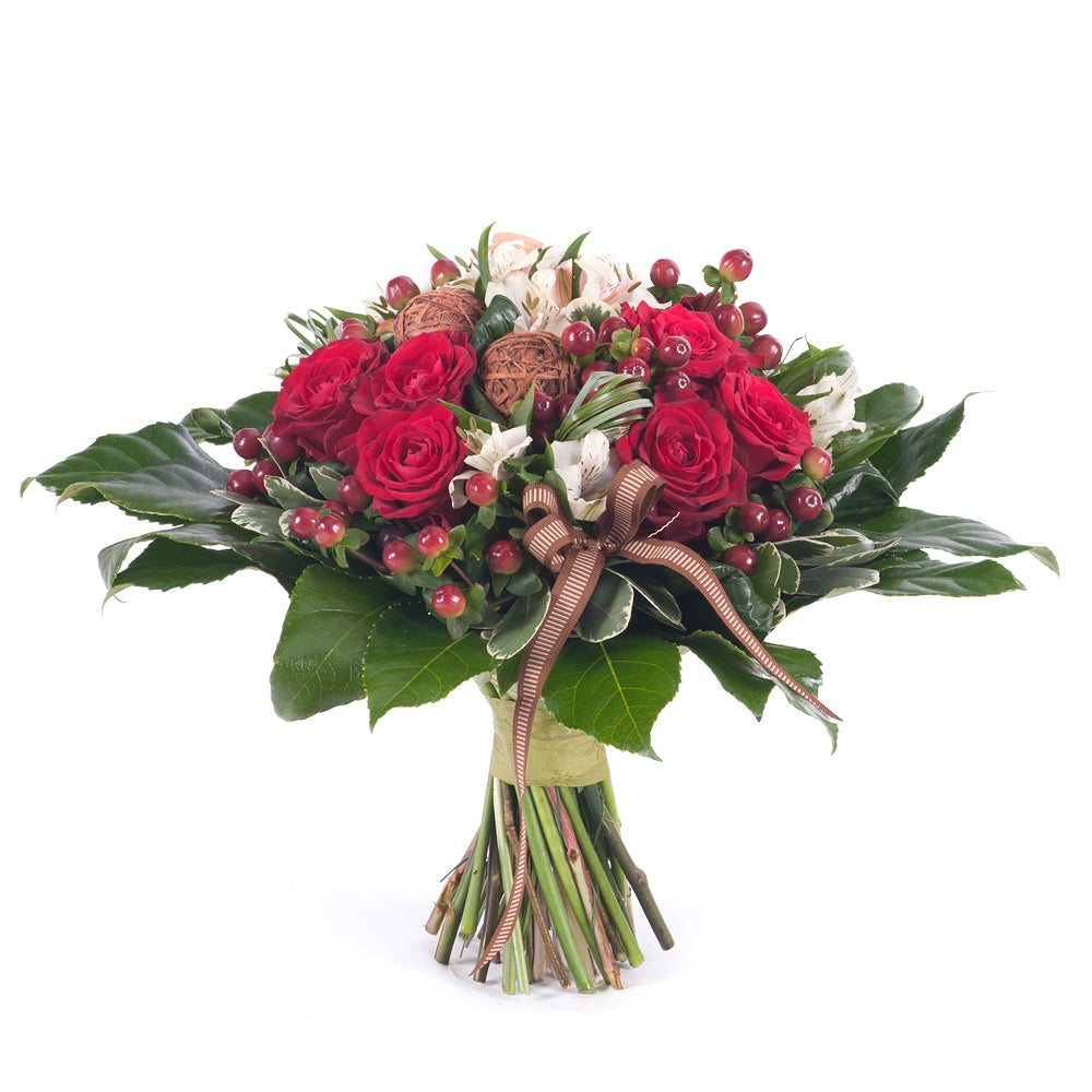 Kytice pro pána s rudými růžemi, alstromeriemi, hypericem, doplněná dekorační zelení je vhodným dárkem pro všechny muže.