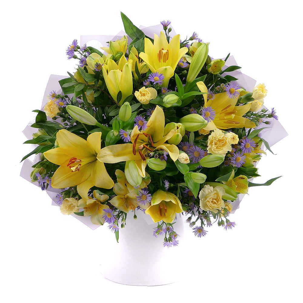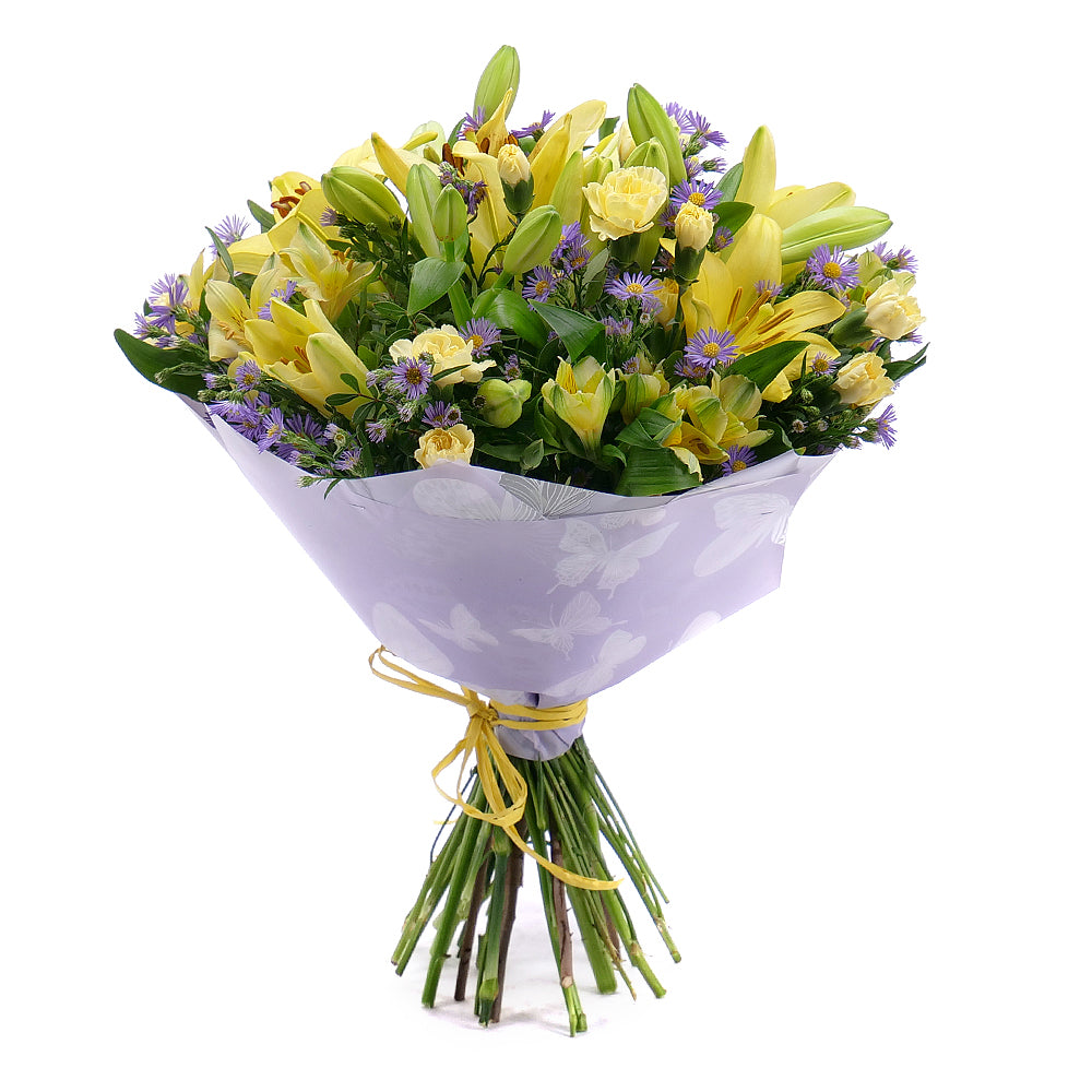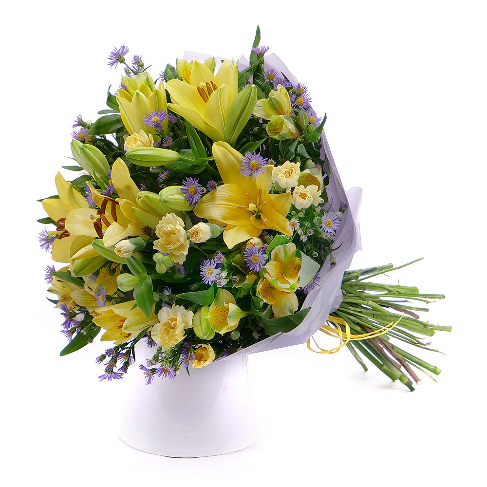 Kytice žlutých lilií doplněná dekorativní zelení z alstromerií a lučních květin zabalená do ozdobného papíru.