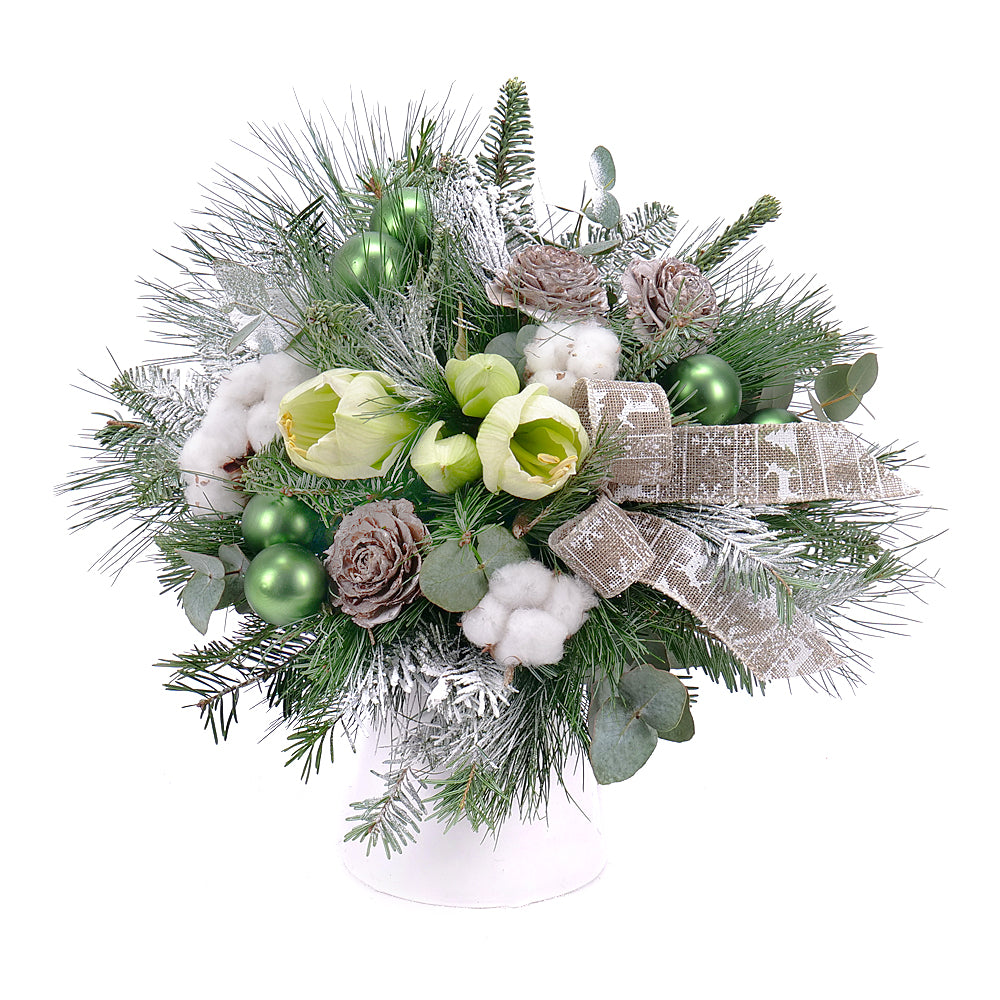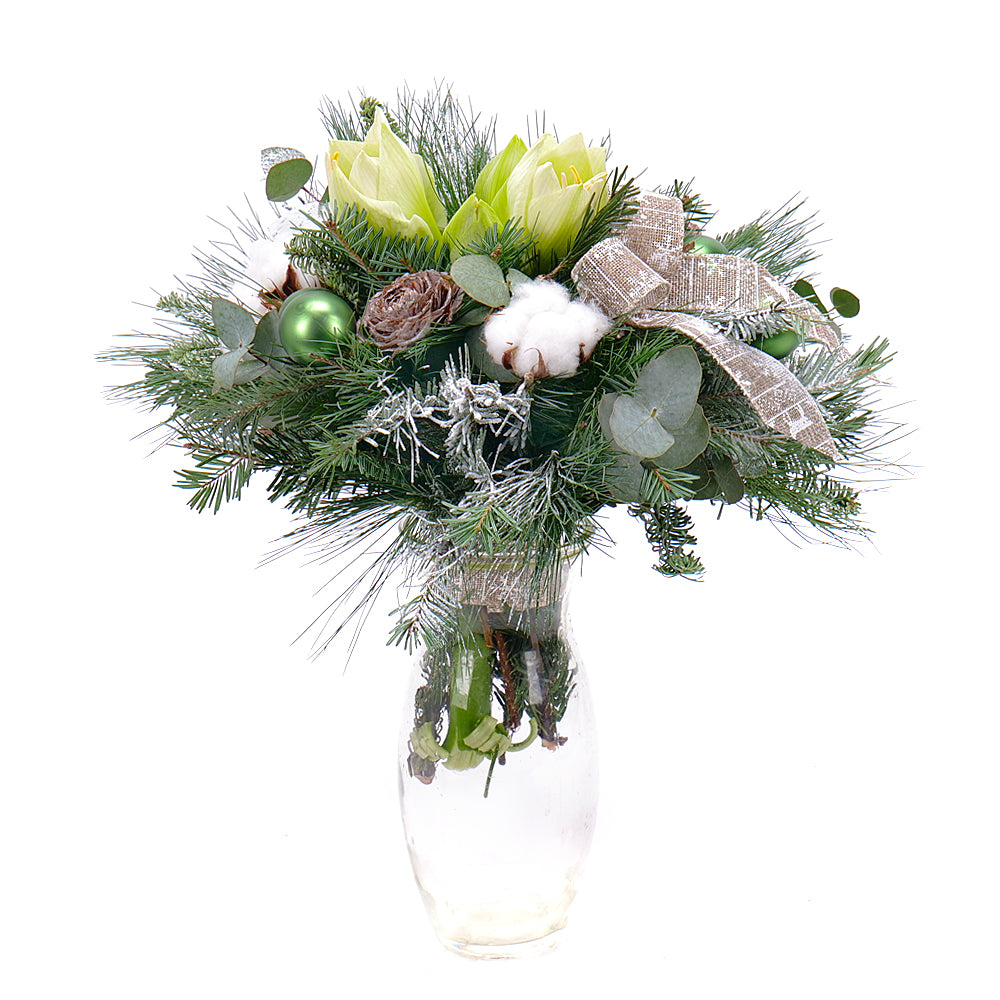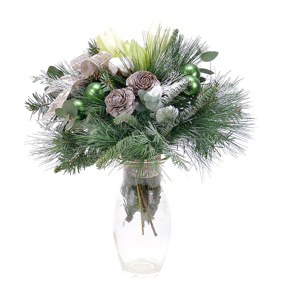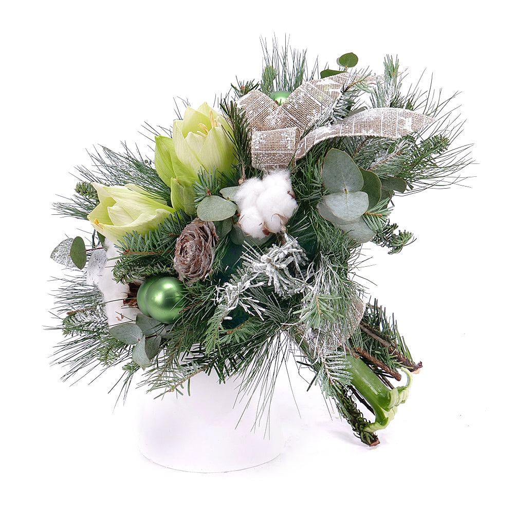 Vánoční kytice s elegantním bílým amarylisem je dokonalým ztělesněním sváteční jemnosti a noblesy. Bílé květy symbolizují čistotu a klid, přičemž jsou obklopeny svěžími větvičkami jehličnanů a stříbrným eukalyptem. Kytice je obohacena o vánoční ozdobné prvky, jako jsou drobné koblihy, vánoční koule a přírodní detaily, které připomínají kouzlo zimy. Tato kytice vnese do vašeho domova kouzlo zimních svátků a dokonale doladí slavnostní atmosféru.