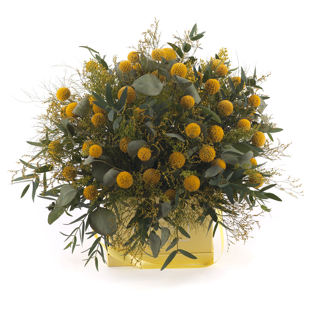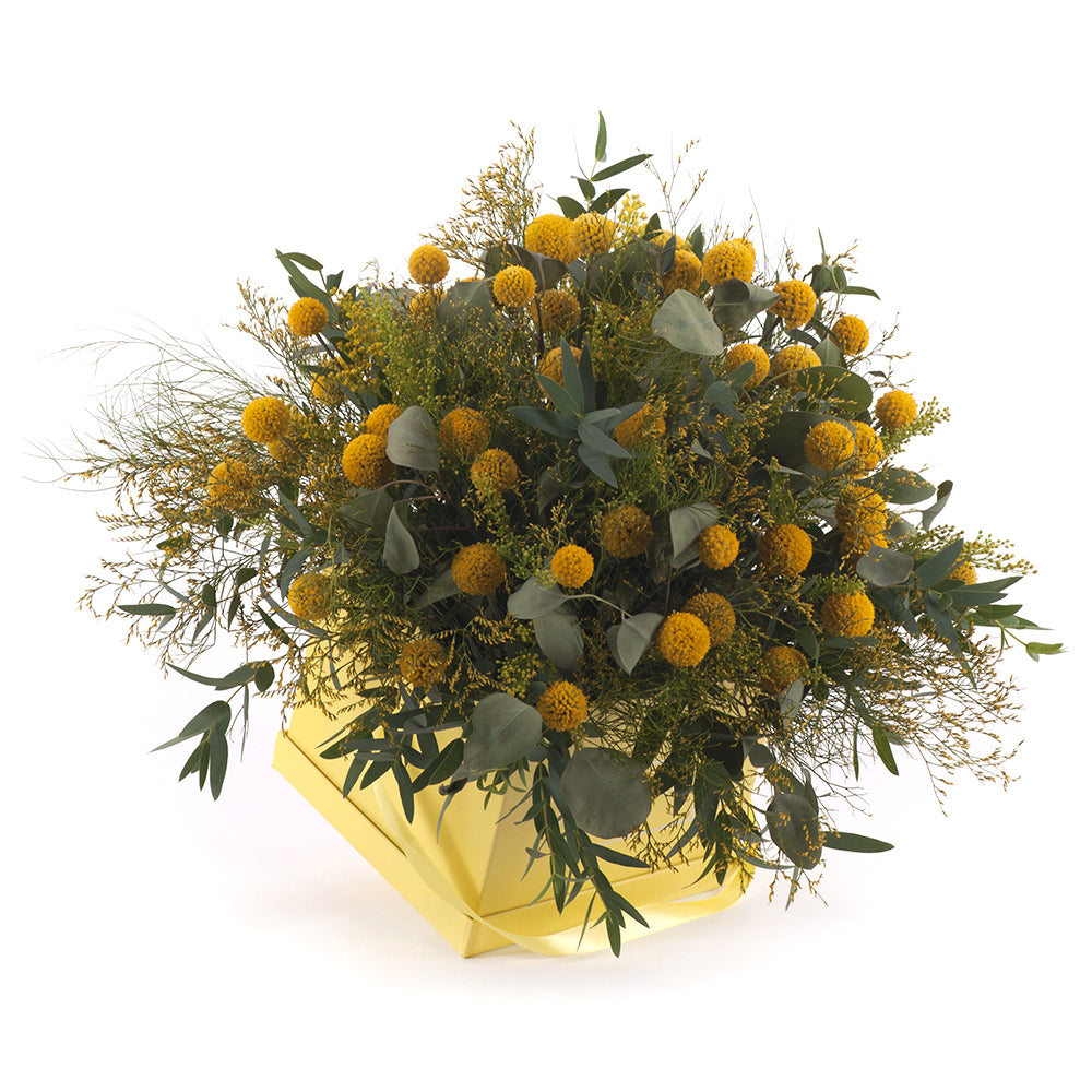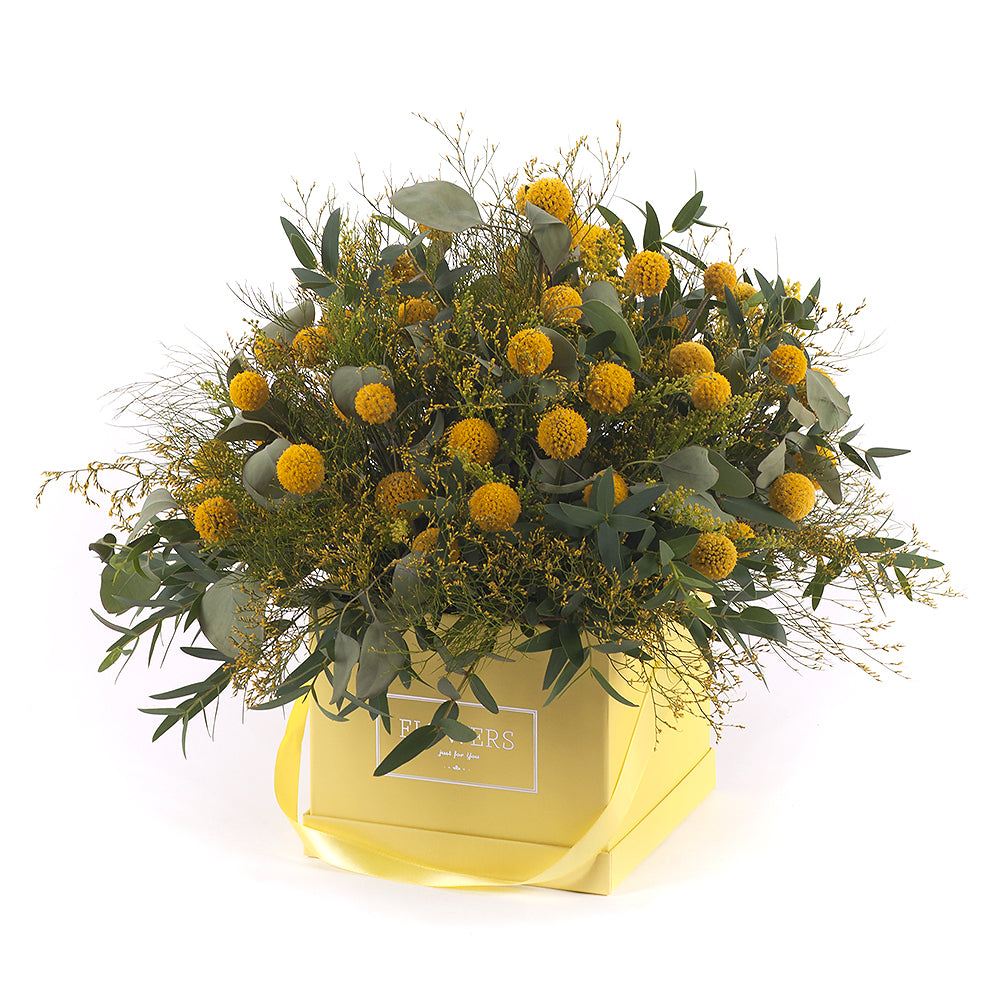 Svieži letný aranžmán z 50 craspédii a solidaga v žiarivom flower boxe.