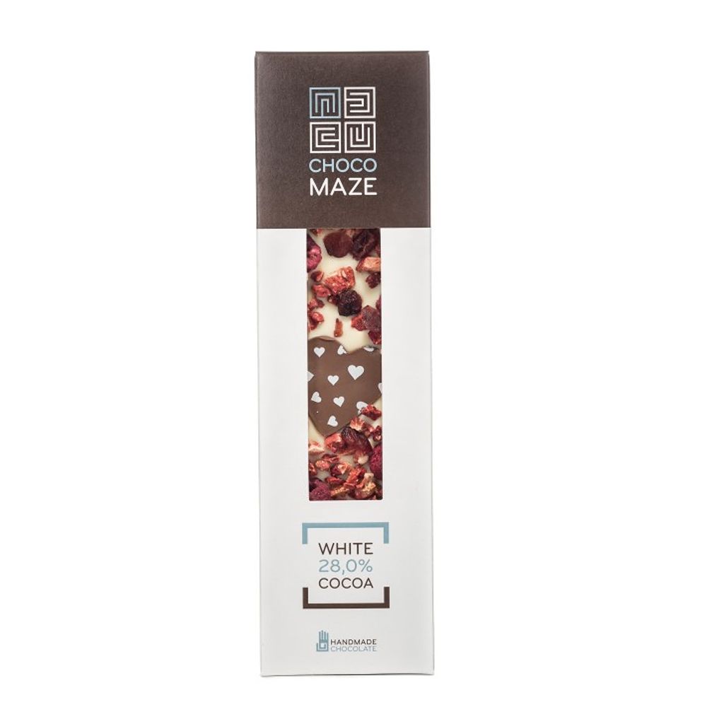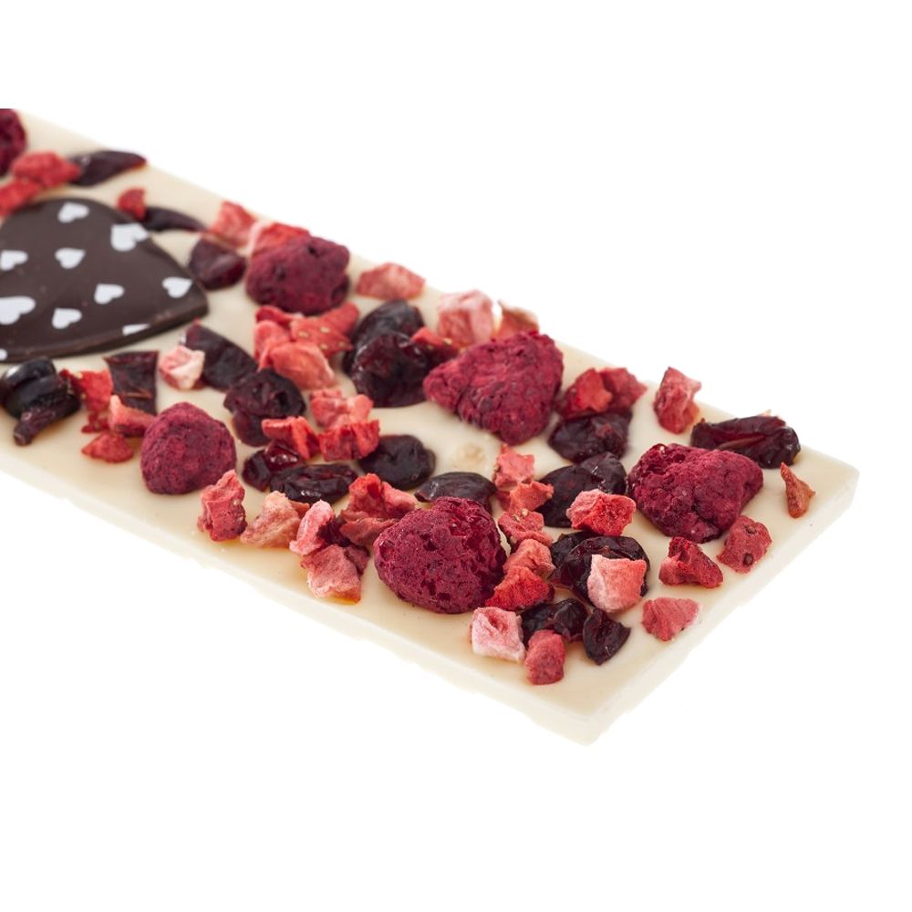 Čokoláda láska bílá je lahodnou bílou čokoládou posypanou malinami, jahodami a brusinkami z čokoládovny Chocomaze.