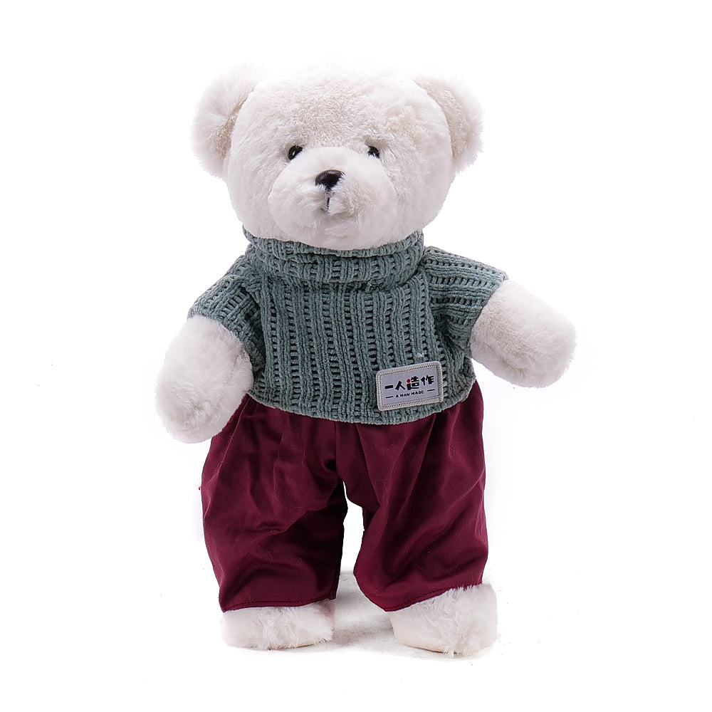 Bílý plyšový medvídek v oblečení.