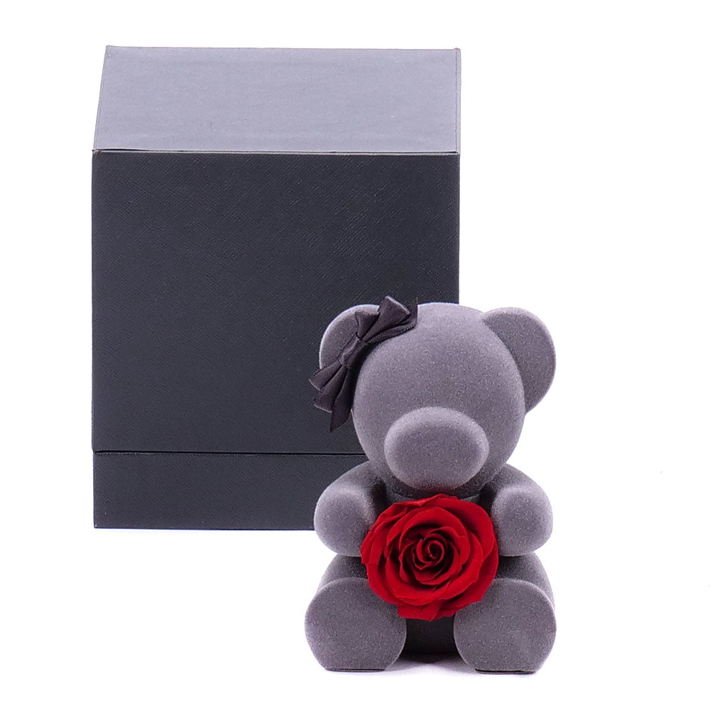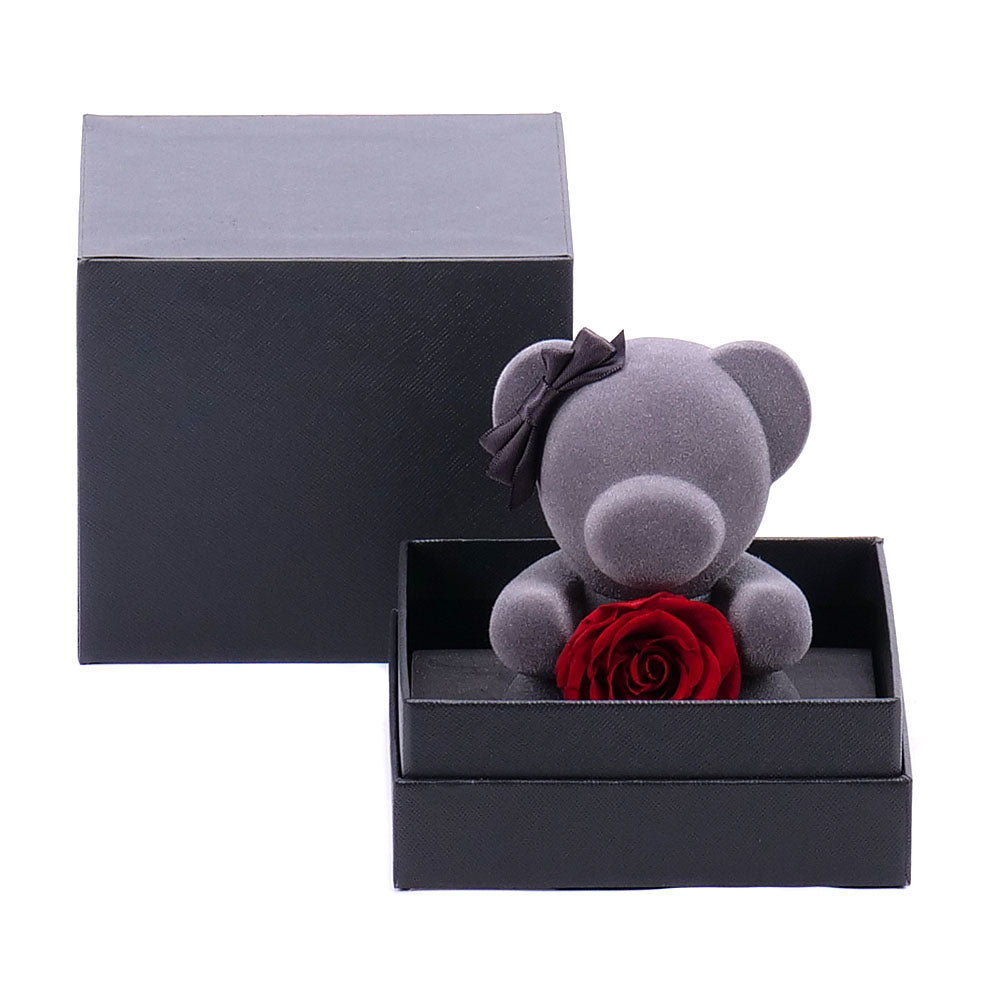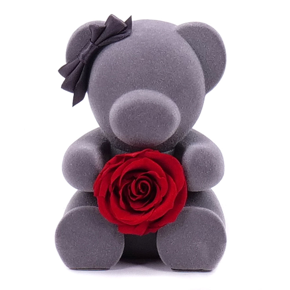Elegantní dekorační medvídek s preparovanou In eterno rudou růží v dárkovém balení. Tento výjimečný doplněk je ideálním dárkem na Valentýna, výročí, narozeniny nebo jako dekorace, která rozzáří každý interiér. Spojení luxusu, trvanlivosti a emoce – dárek, který zanechá hluboký dojem.
