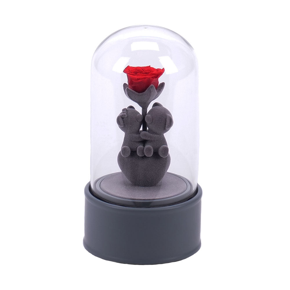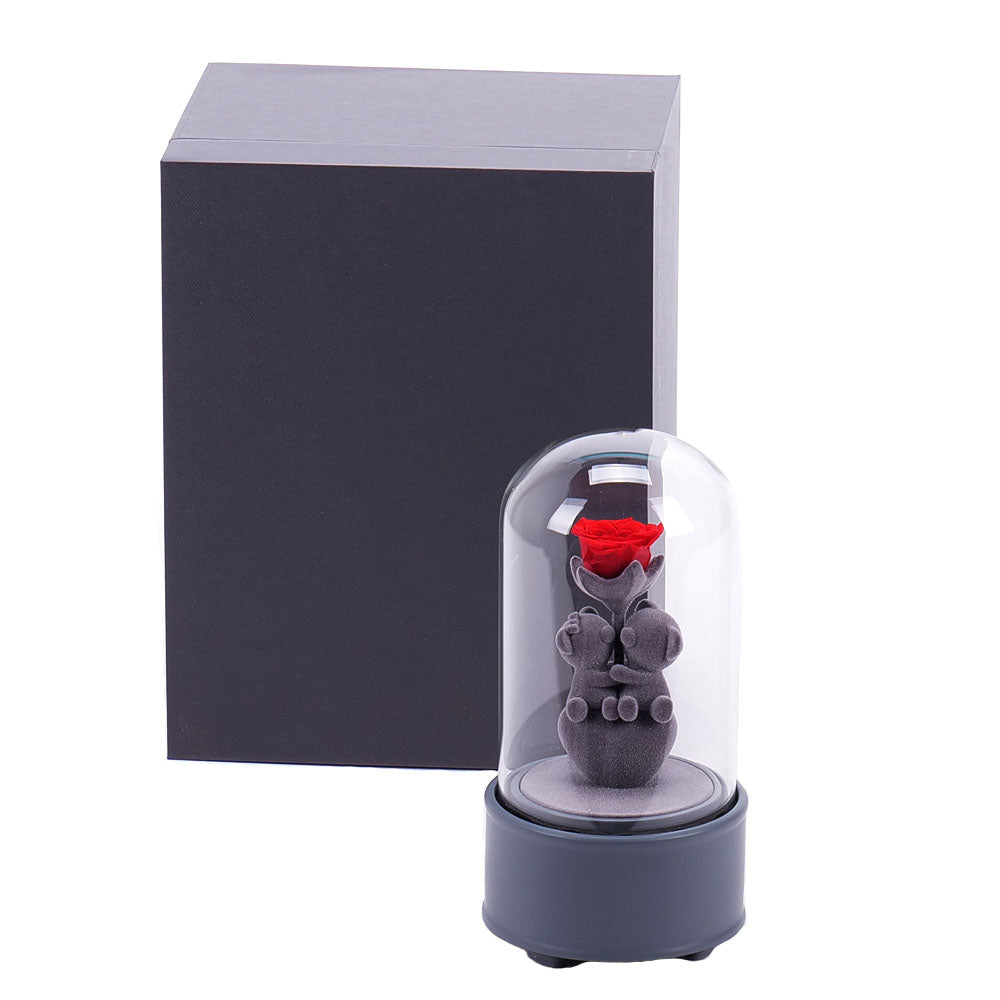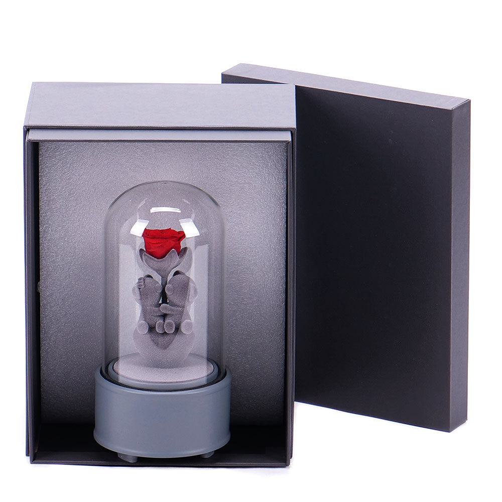 Dekoračná elegantná hracia skrinka s In eterno červenou ružou a medvedíkmi. Po natiahnutí sa skrinka točí a hrá príjemnú melódiu. Súčasťou je elegantné balenie v šedom boxe.
