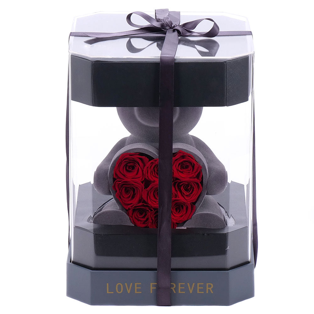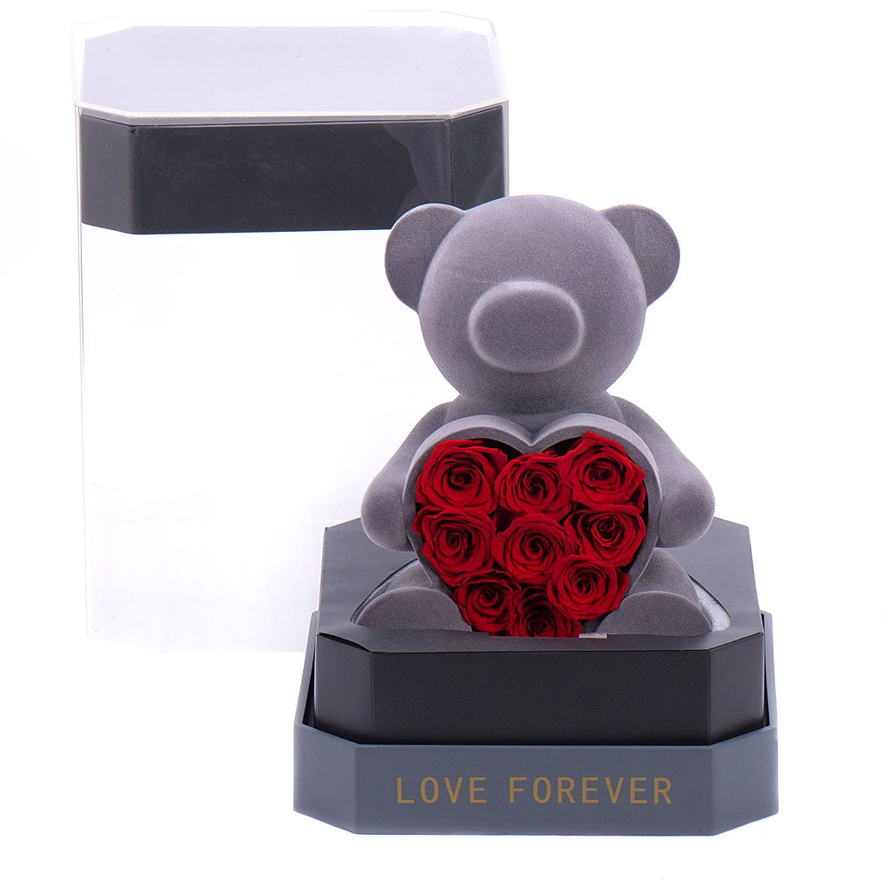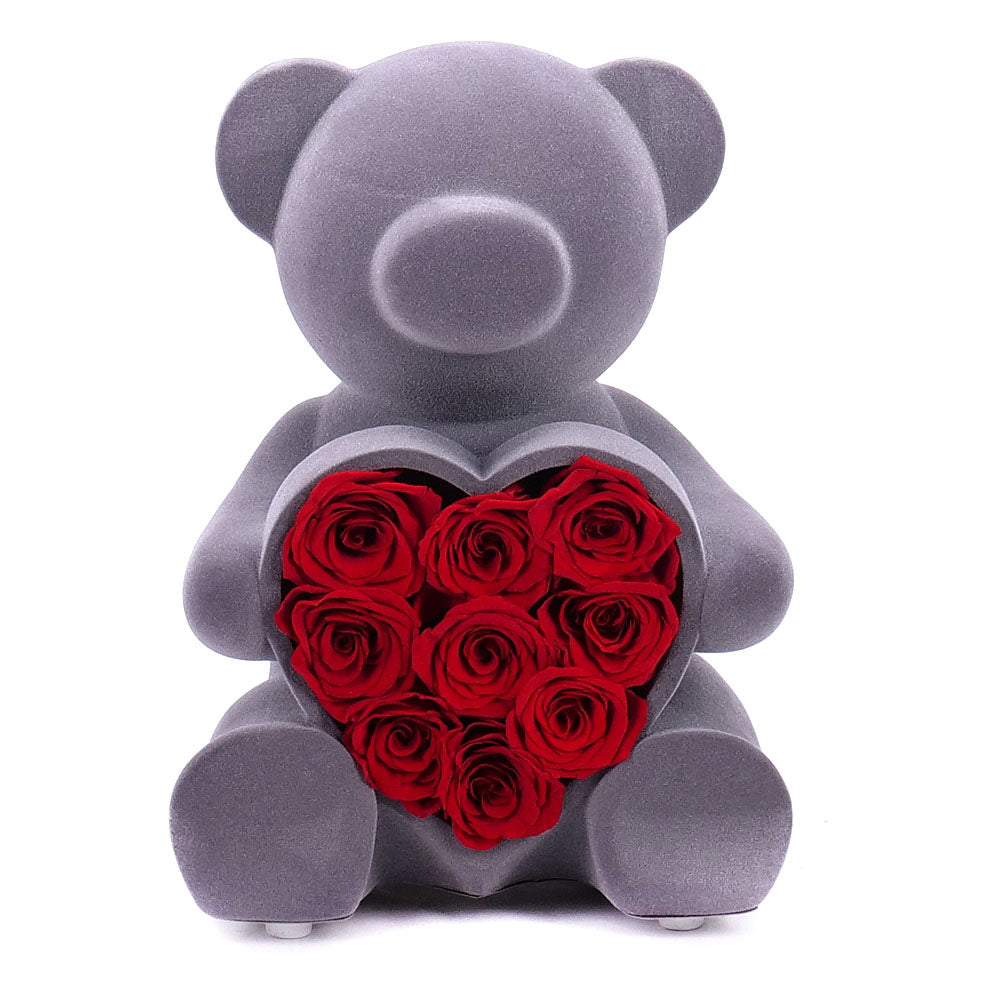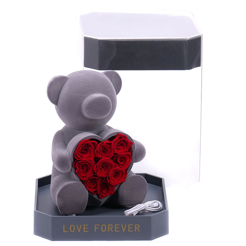 Exkluzívny macko s večnými In eterno ružami v darčekovom balení. Súčasťou je LED osvetlenie a možnosť pripojenia bluetooth. Na SD kartu, ktorá nie je súčasťou balenia je možné nahrať odkaz.