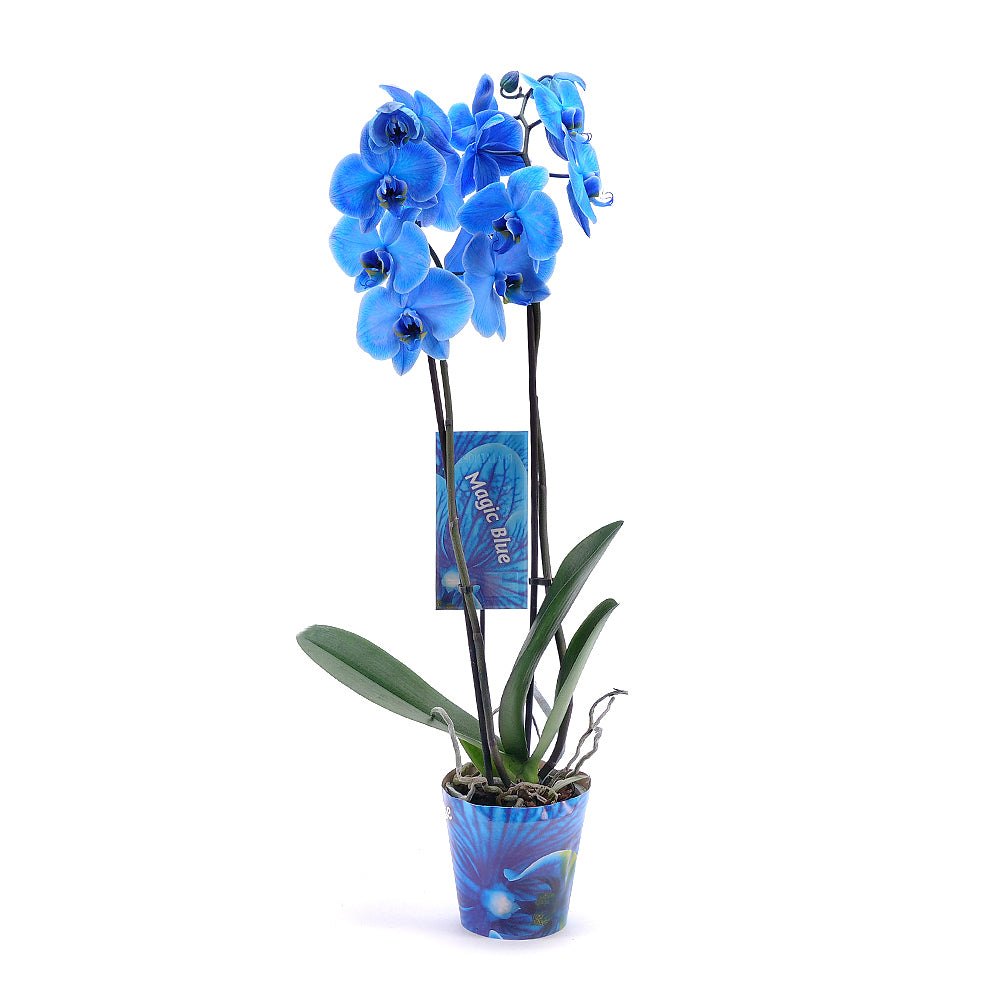 Orchidej se prodává v květináči s dekoračním modrým papírem. Barva květů bylo dosaženo barvicím procesem. Není přirozeně modrá.