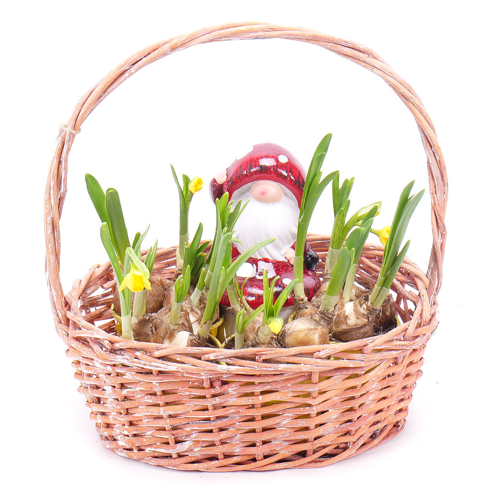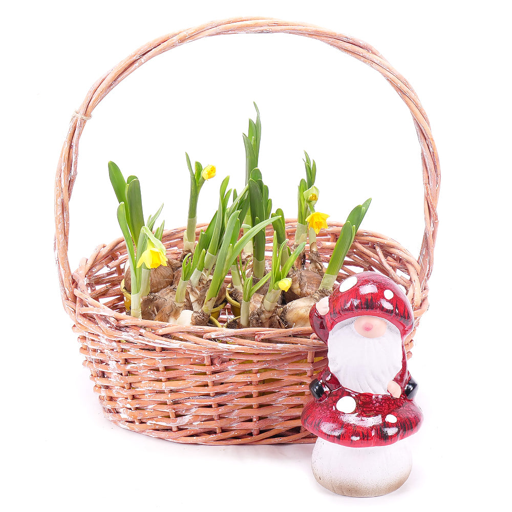 Narcisy patří mezi nejznámější cibuloviny. Do zahrady je vysazujeme na podzim, aby se zakořenily. Kvetou od poloviny března až do května. Vyznačují se pěkným žlutým květem a symbolizují přicházející jaro. Set je složen: proutěný košík - 1 ks, keramický trpaslík - 1 ks, hrnkový živý narcis - 4 ks.