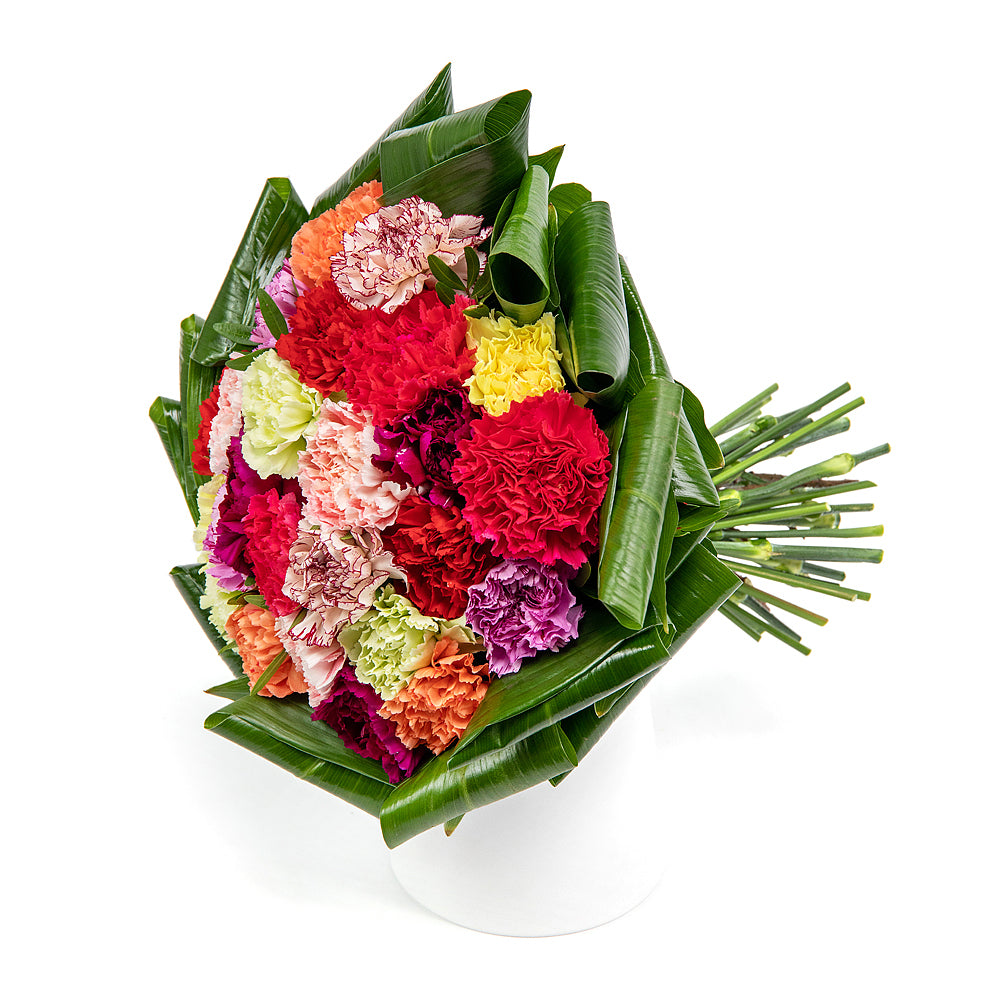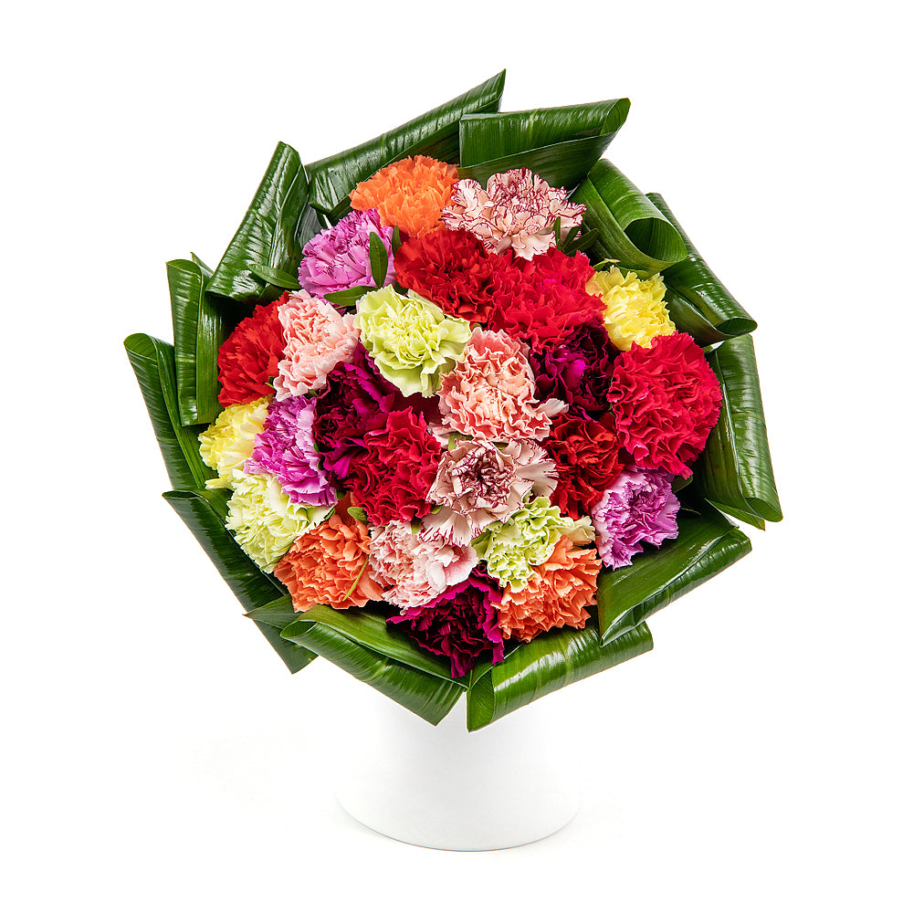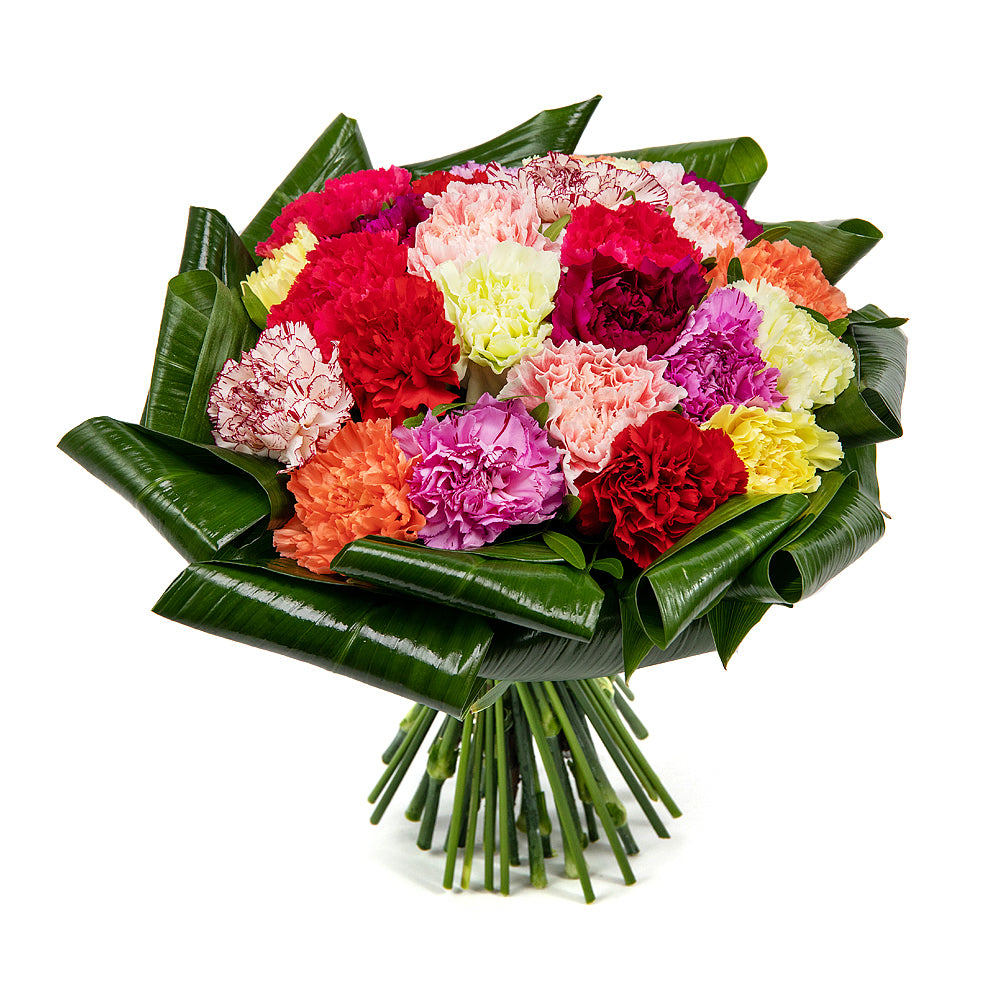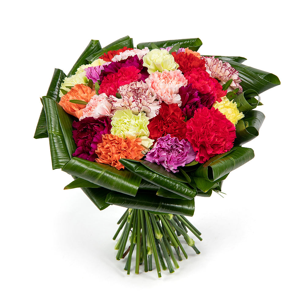 Kytice aranžovaná z barevných karafiátů a dekorační zeleně.