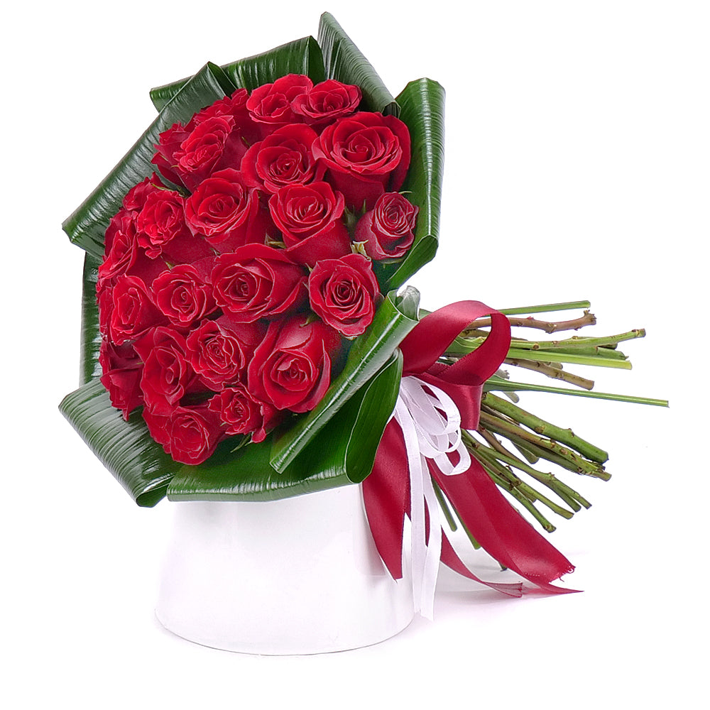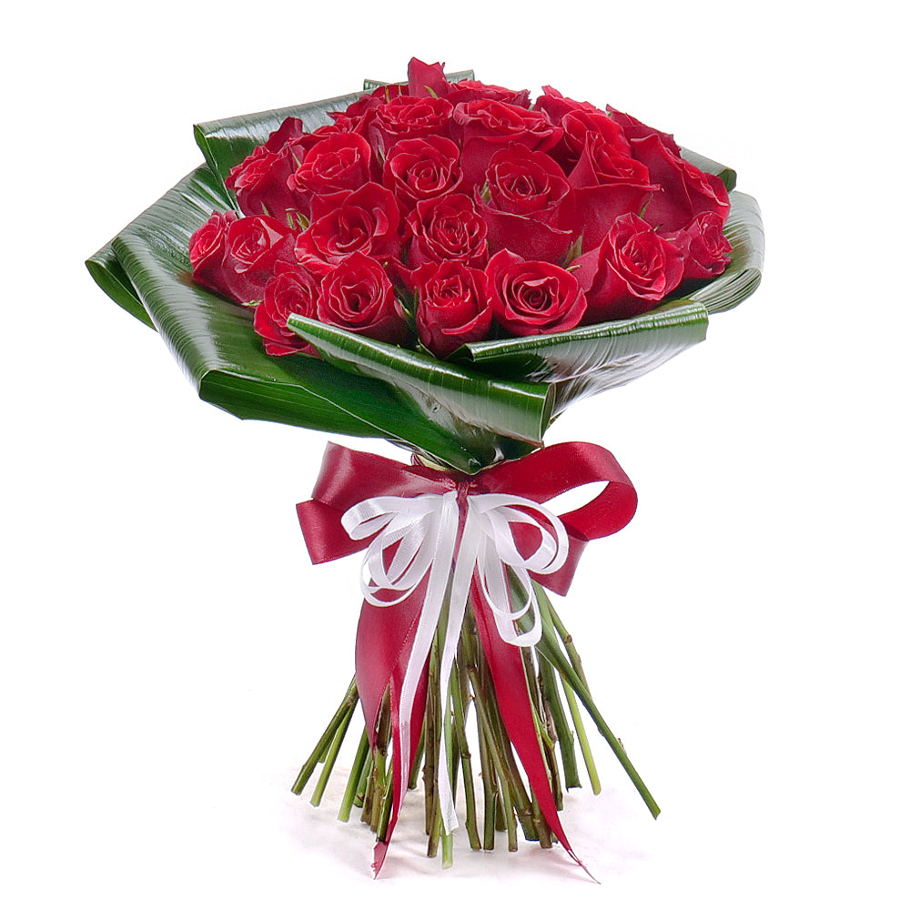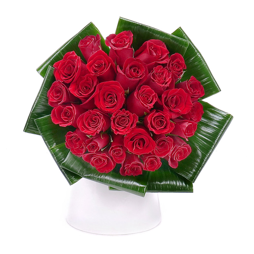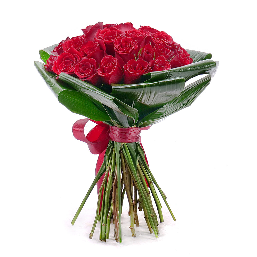 Elegantní kulatá kytice z rudých růží s dekorační zelení. Kytice, která zpříjemní den všem milovníkům rudých růží.