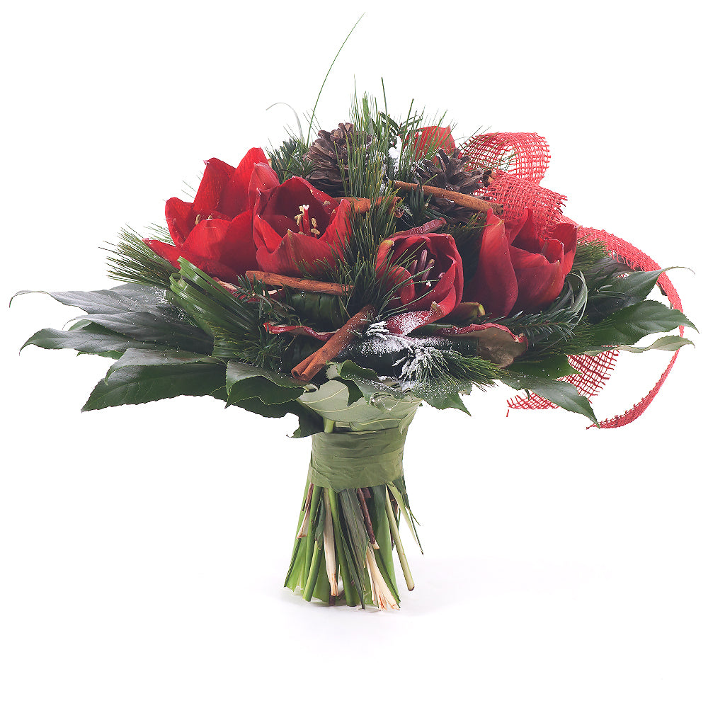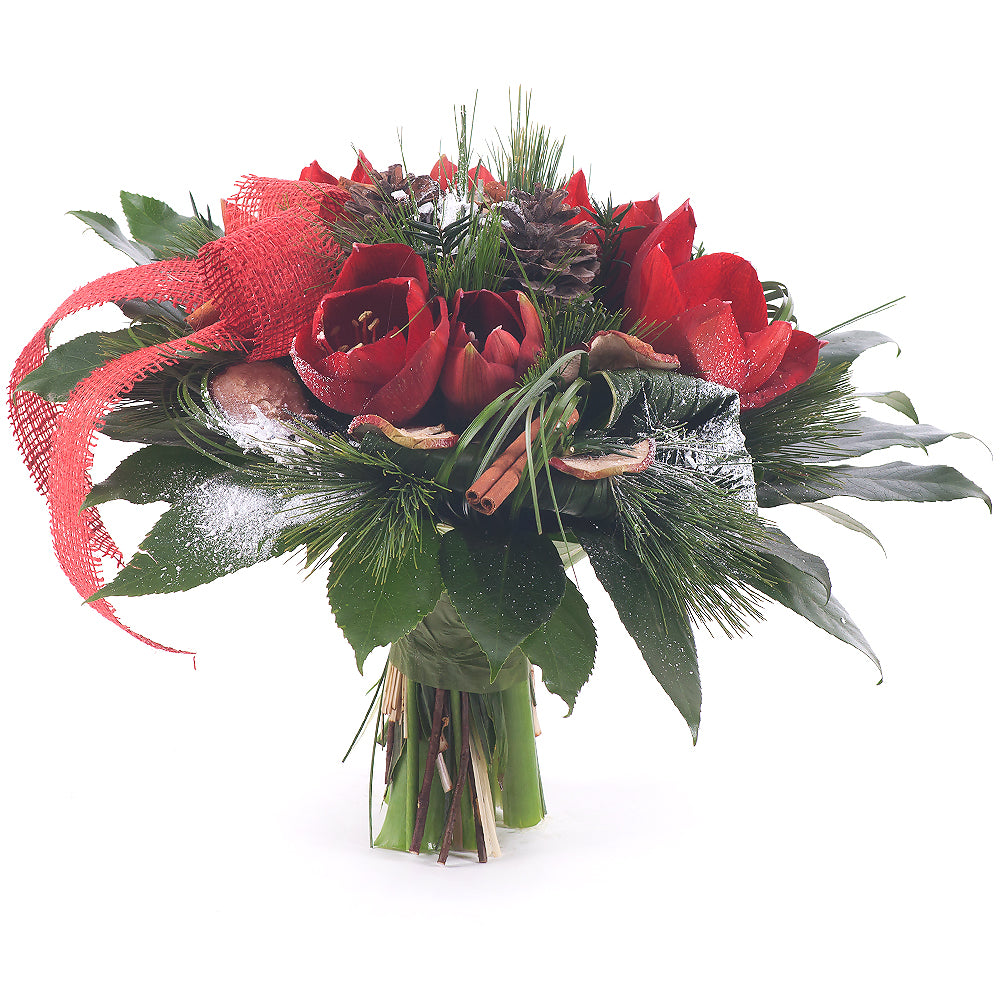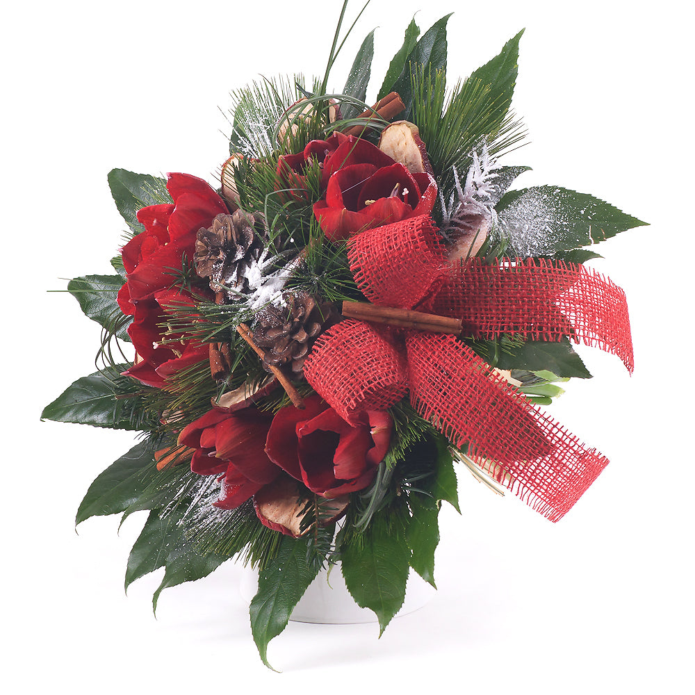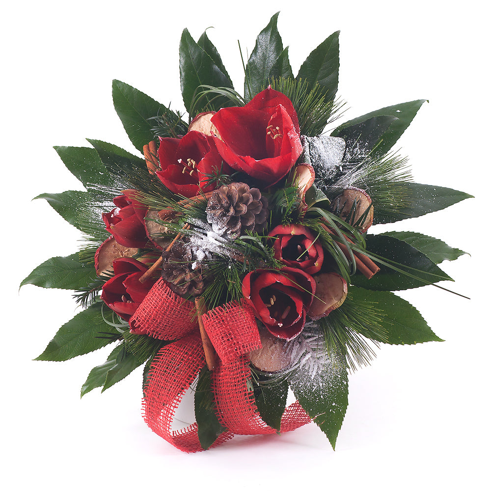 Okrúhla kytica z ružových amarylisov s okrasnou zeleňou a vianočnými dekoráciami.SloženíŠkorica kusová - 7 ks Amarylis červený rez - 3... Přečtěte si více