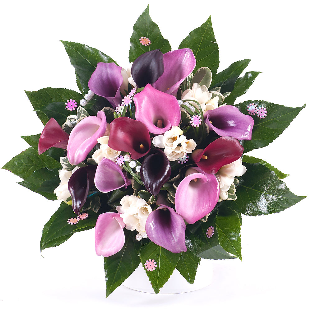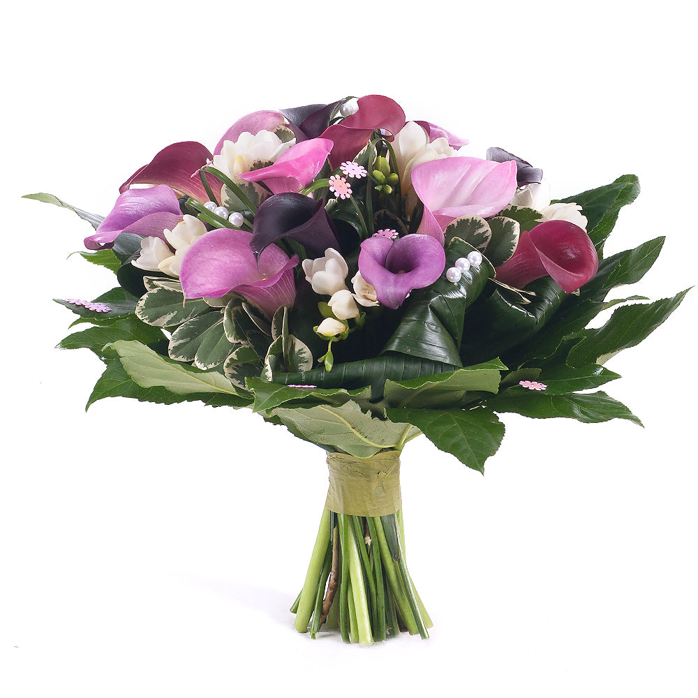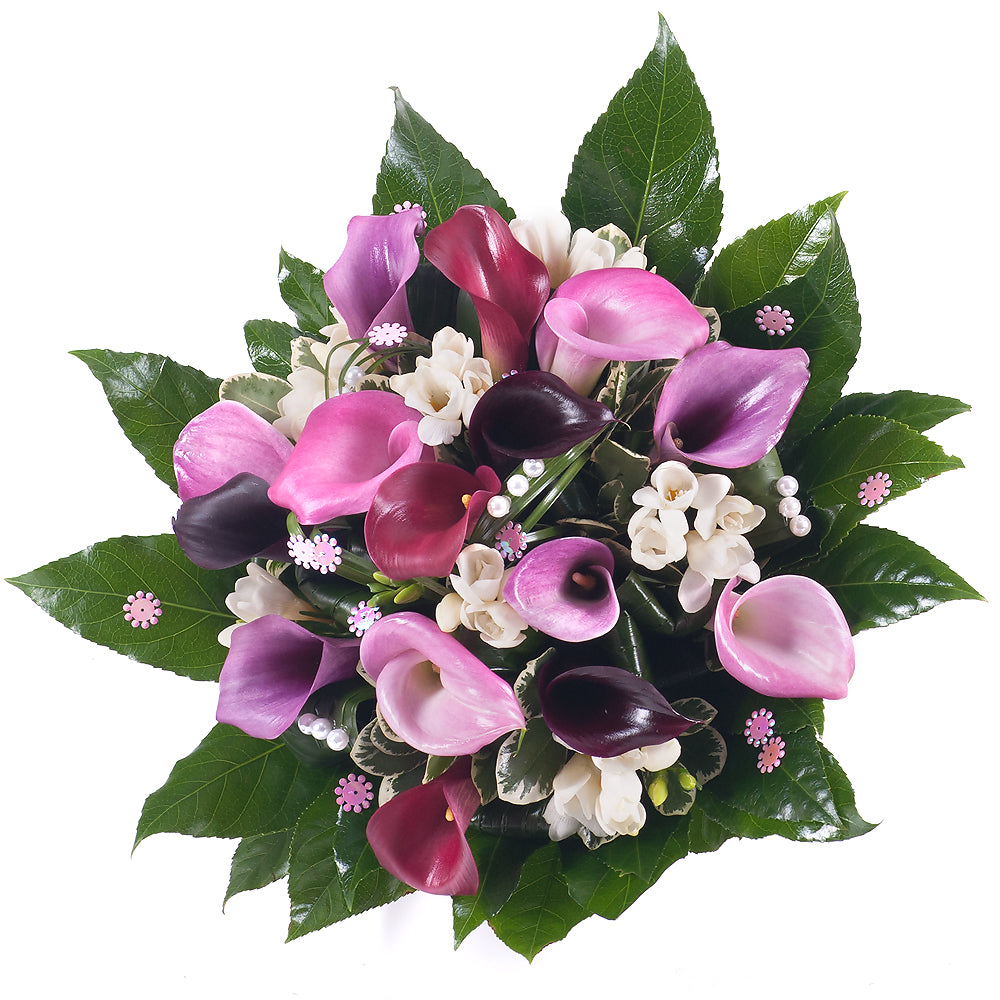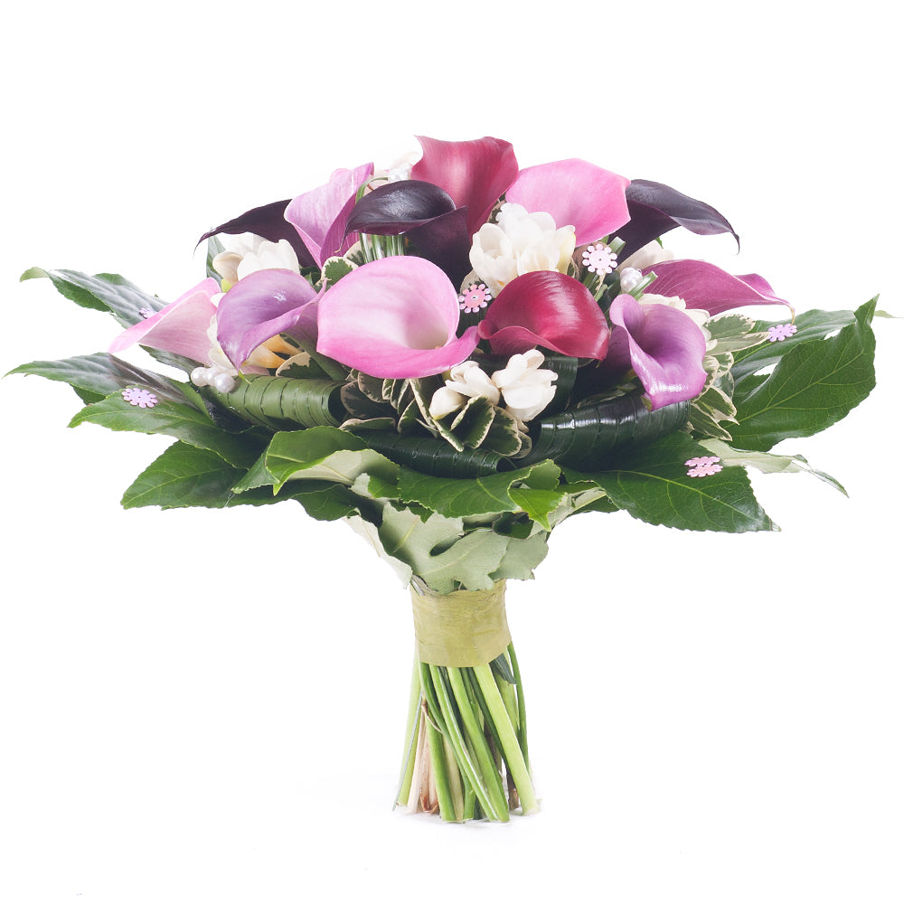 Fialová kytica z kál v rôznych odtieňoch od tmavo fialovej až po jemne ružovú. Kaly sú zjemnené sviežimi kvietkami bielych frézií s decentným zdobením dekoračnou zeleňou a ozdobnými perlami.