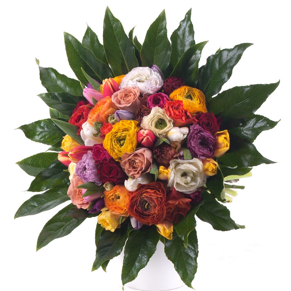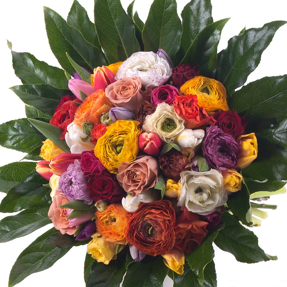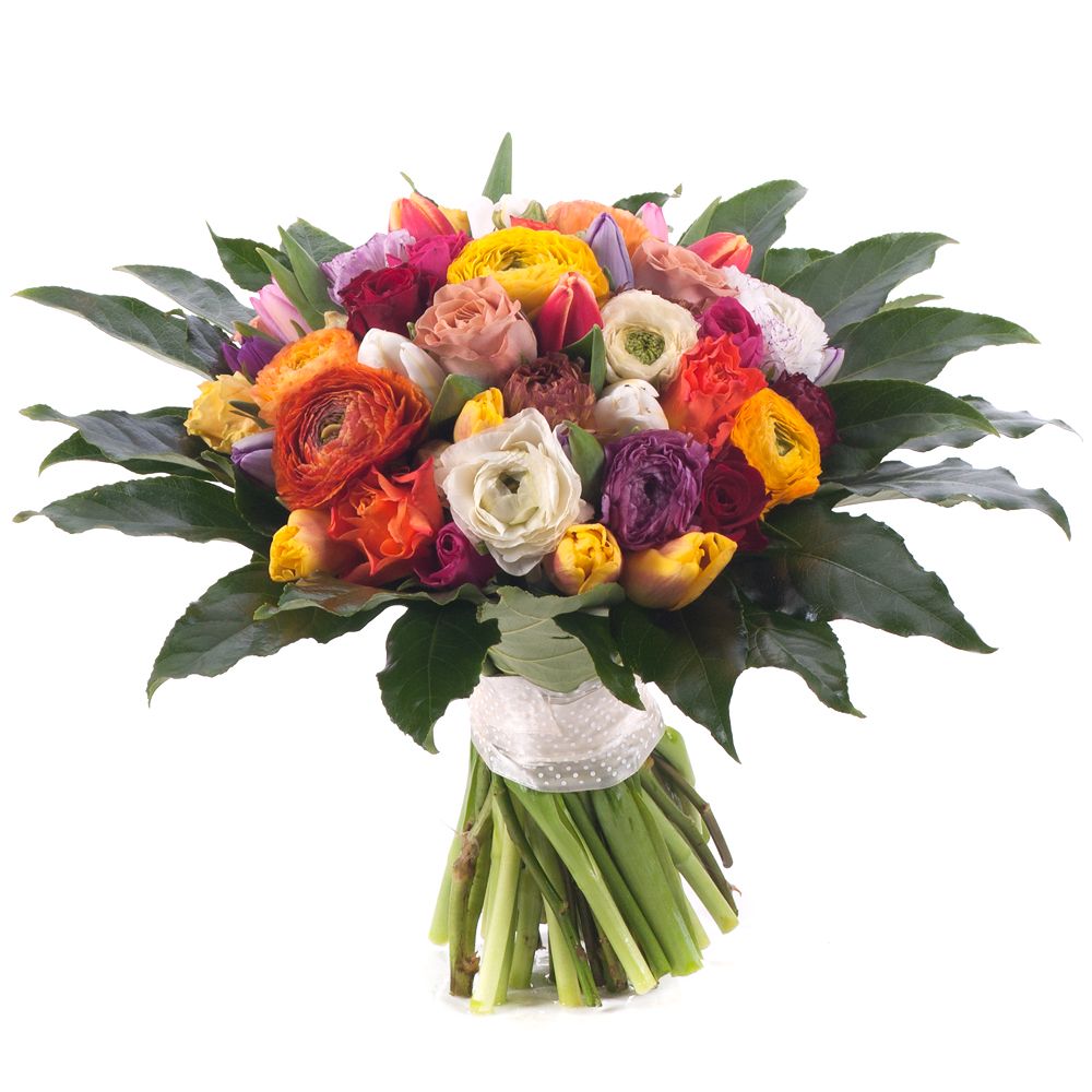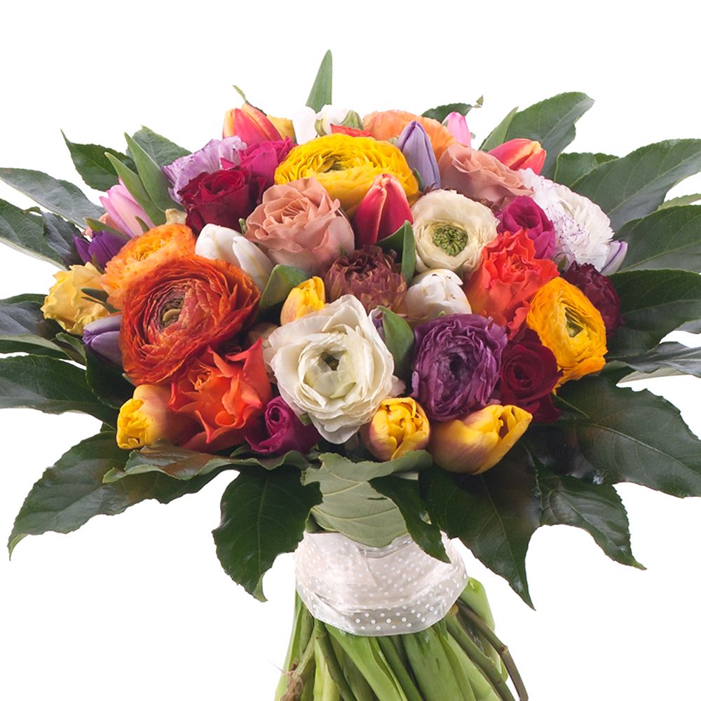 Kytica je aranžovaná z kombinácie farebných ranunculusov, tulipánov a ruží. Je doplnená dekoračnou zeleňou a bielou stuhou. Veselá a svieža kytica vhodná pre potešenie Vašich blízkych, priateľov počas bežných dní, ale aj na oslavu výnimočných dní ako sú n
