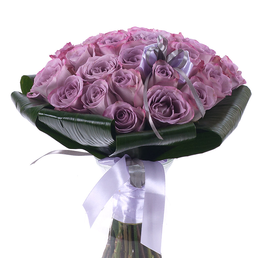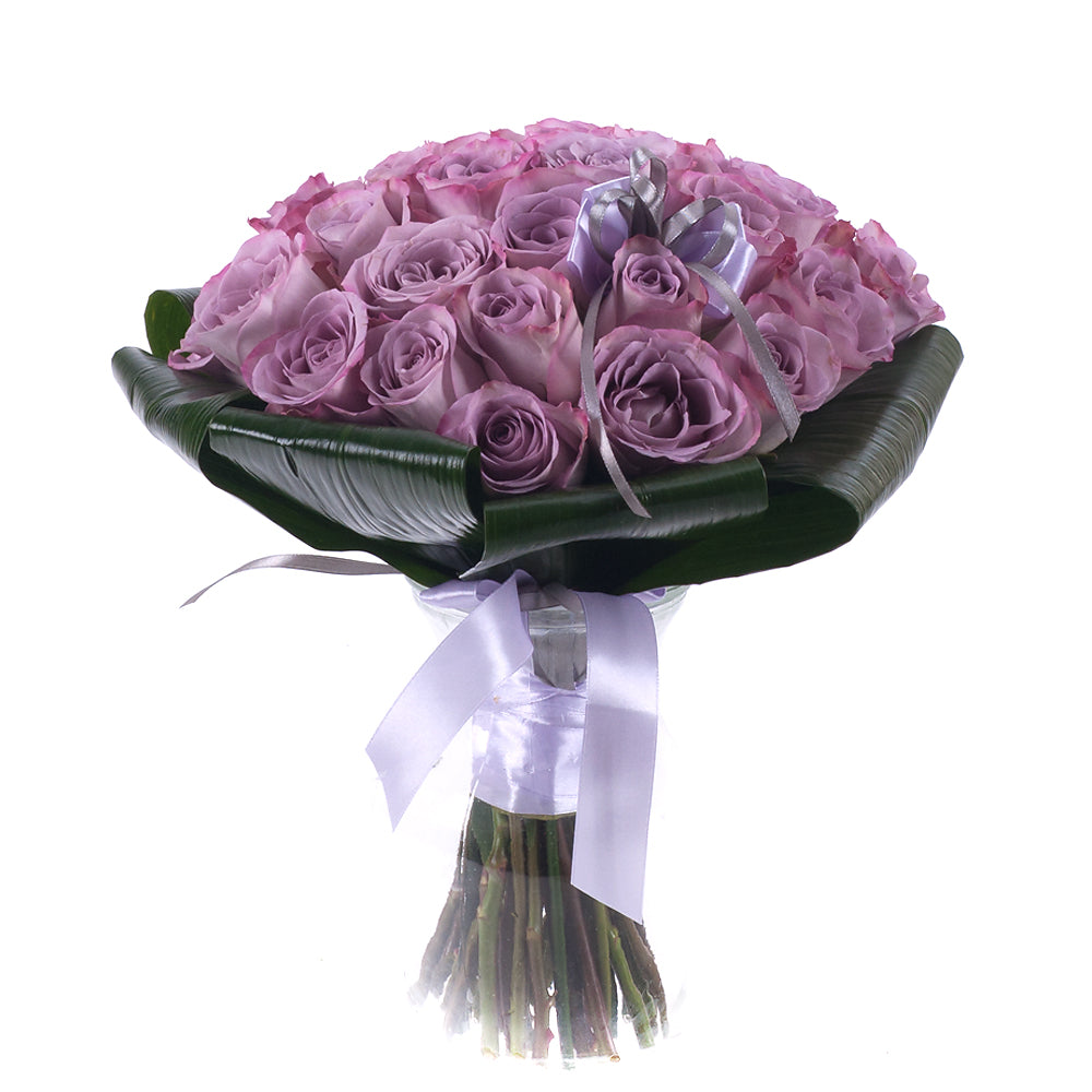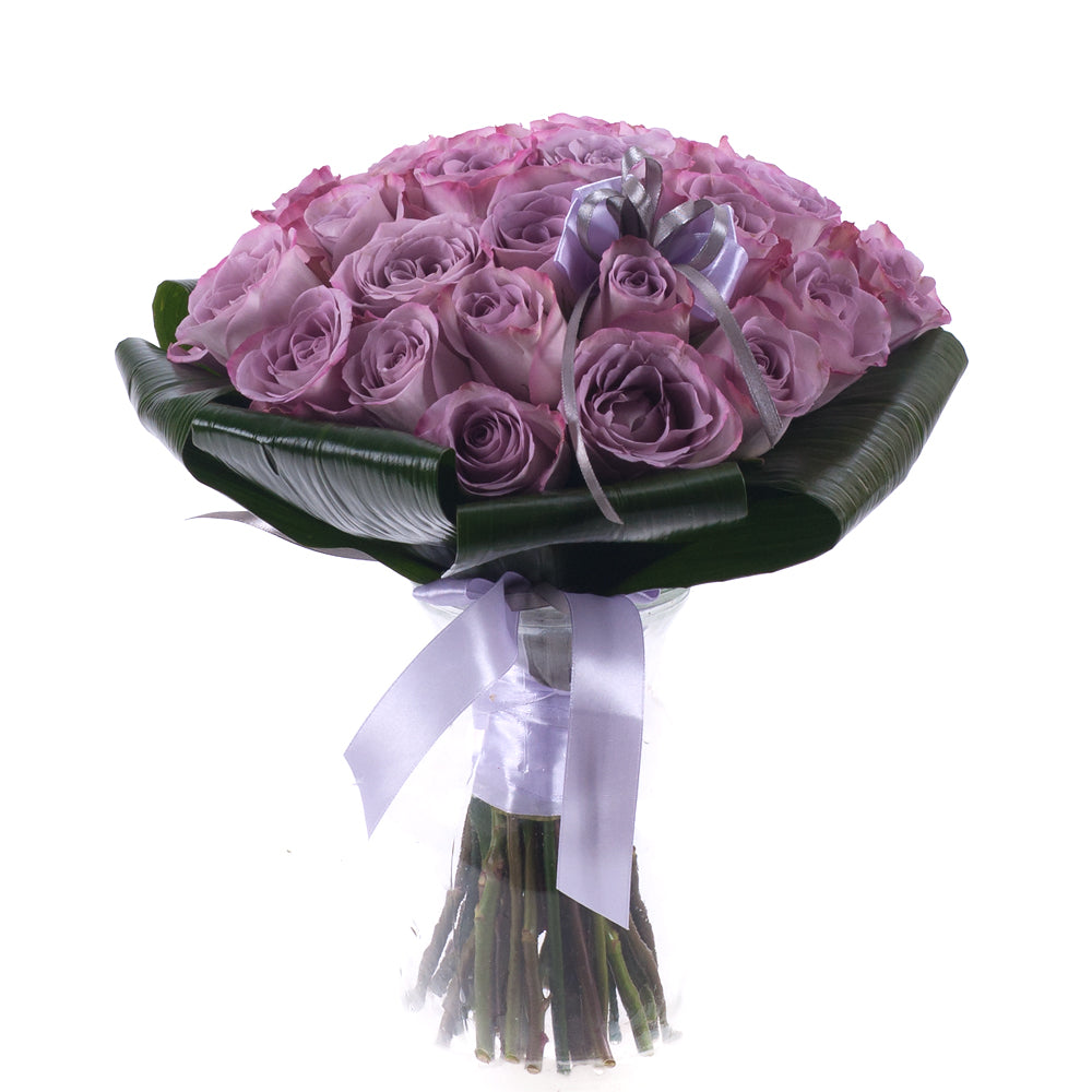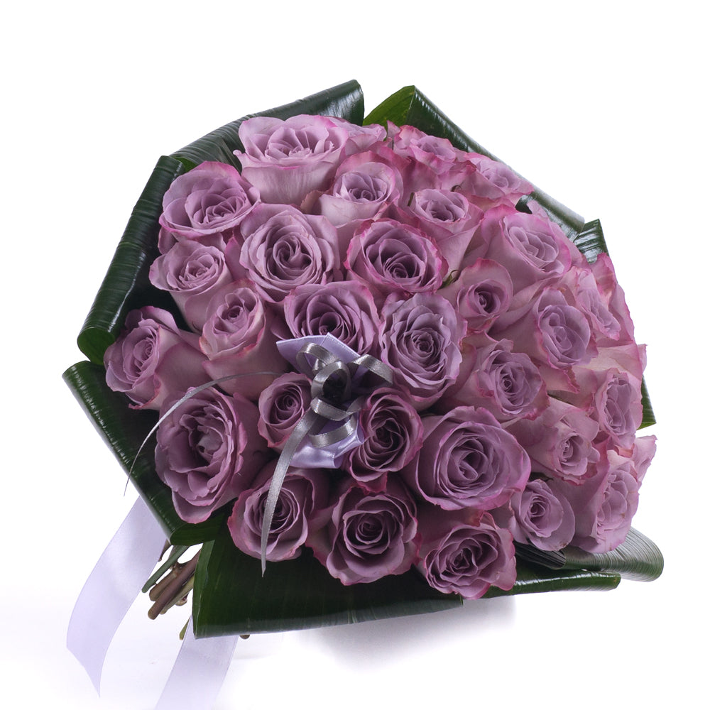 Elegantná okrúhla kytica z 35 fialových ruží s dekoračnou zeleňou.