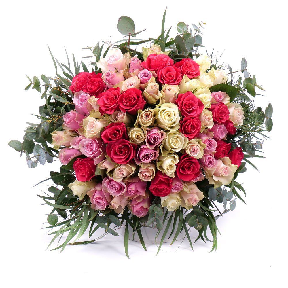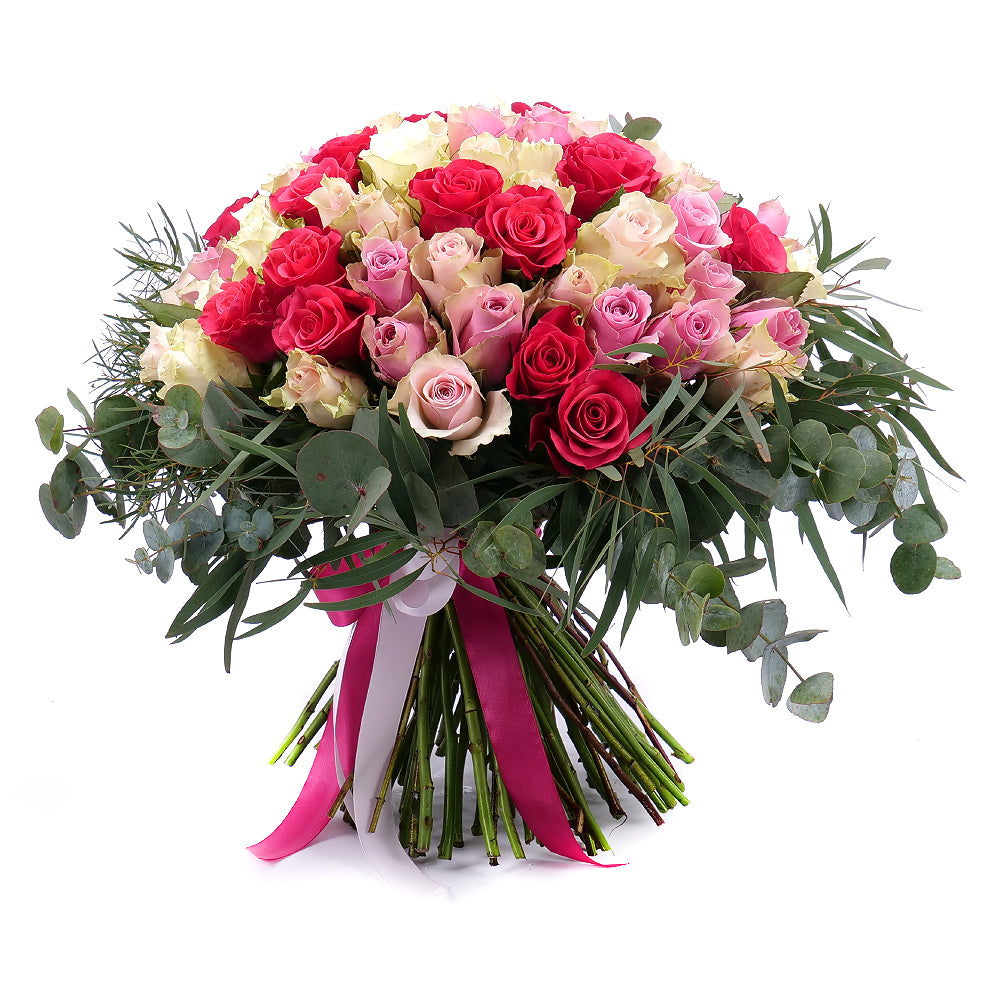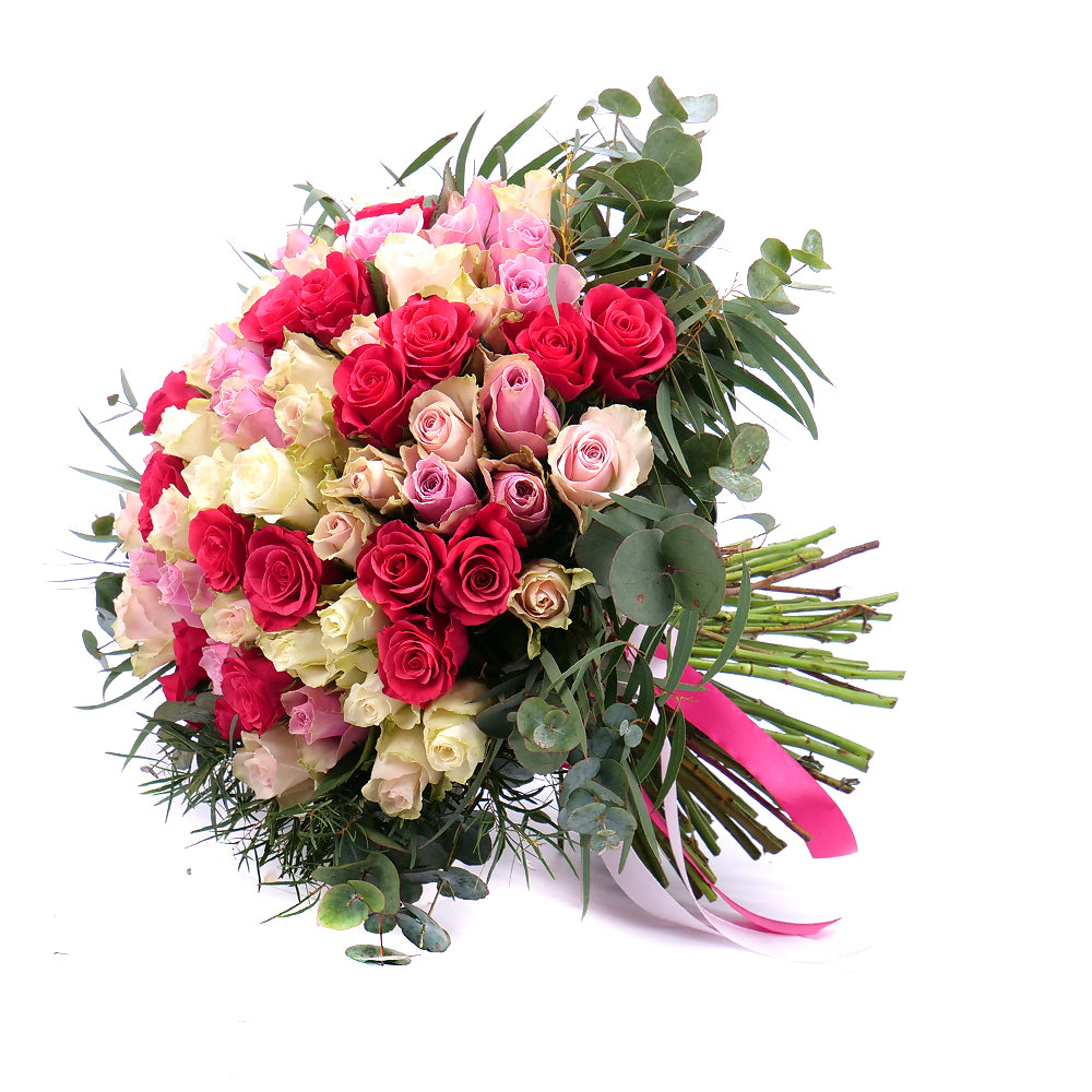Exkluzivní kytice ze 70 ks růžových růží různých odstínů, doplněná dekorační zelení a saténovou stuhou.