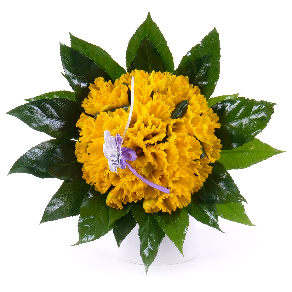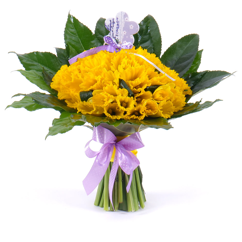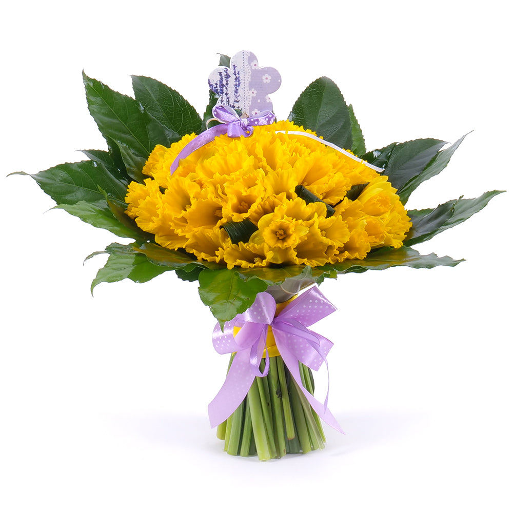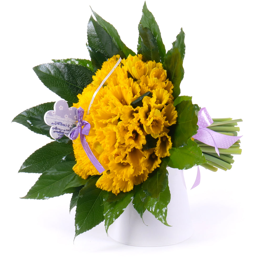 Slnečná, veselá kytica aranžovaná z narcisov, ktoré sú doplnené dekoračnou zeleňou. Obľúbená kytica vhodná na každú príležitosť.