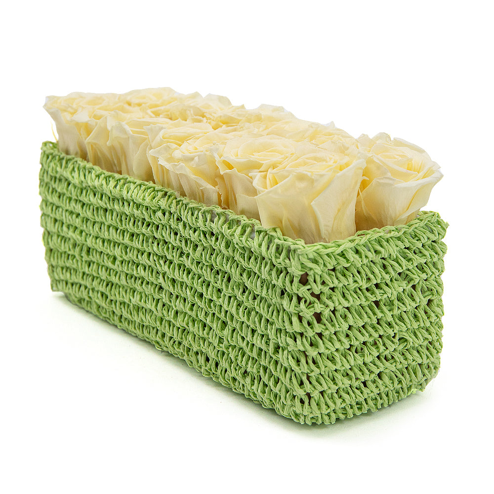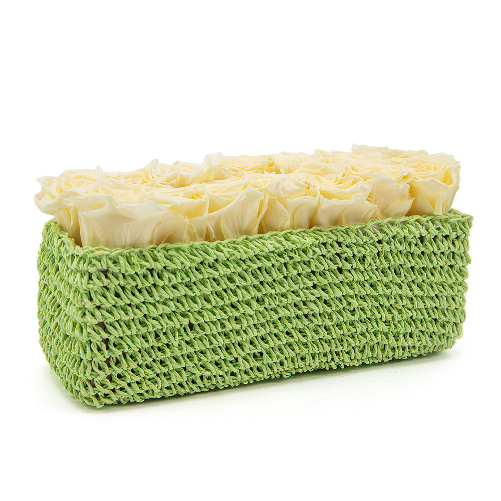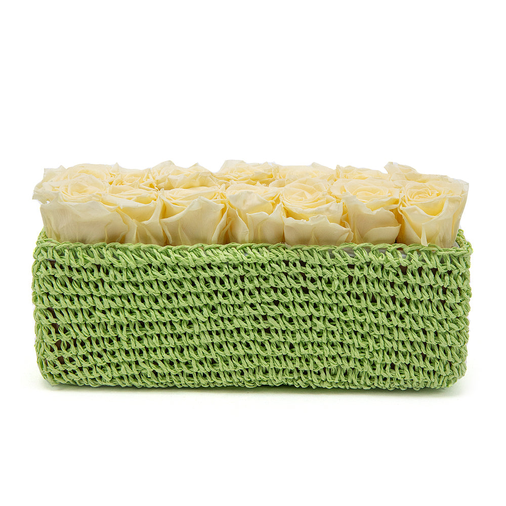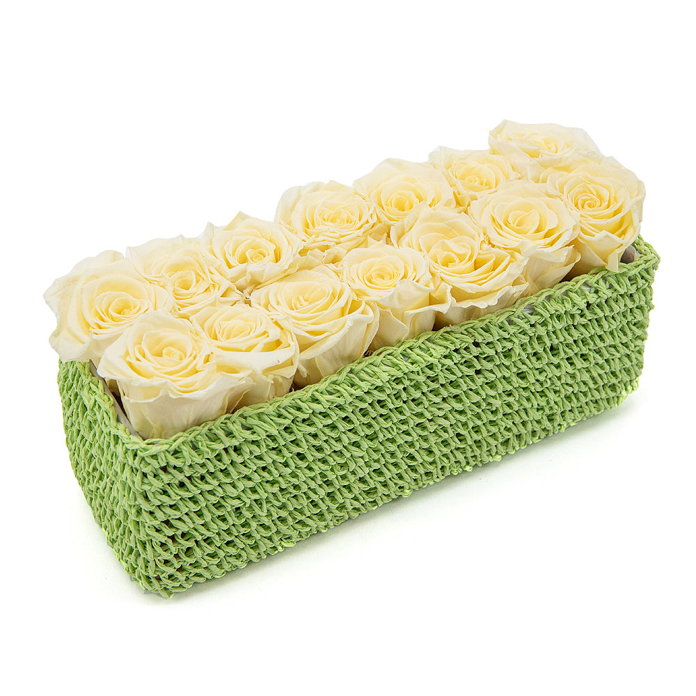 Exkluzivní růže In Eterno v krémové barvě v pletené krabičce.