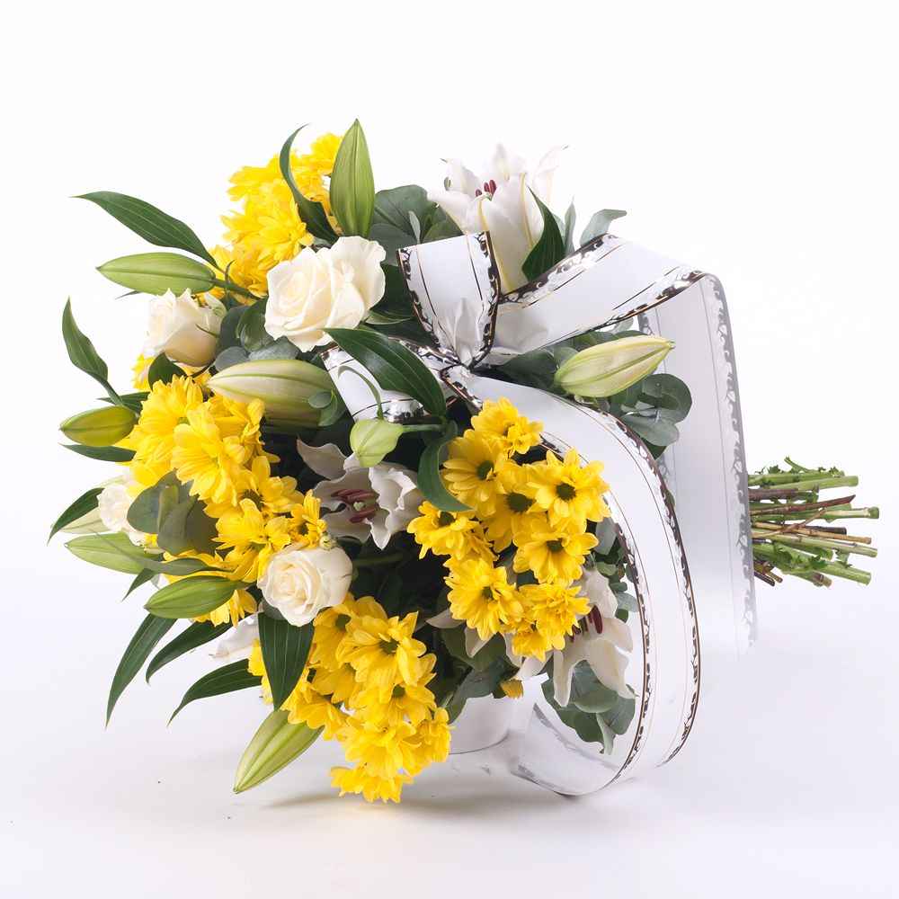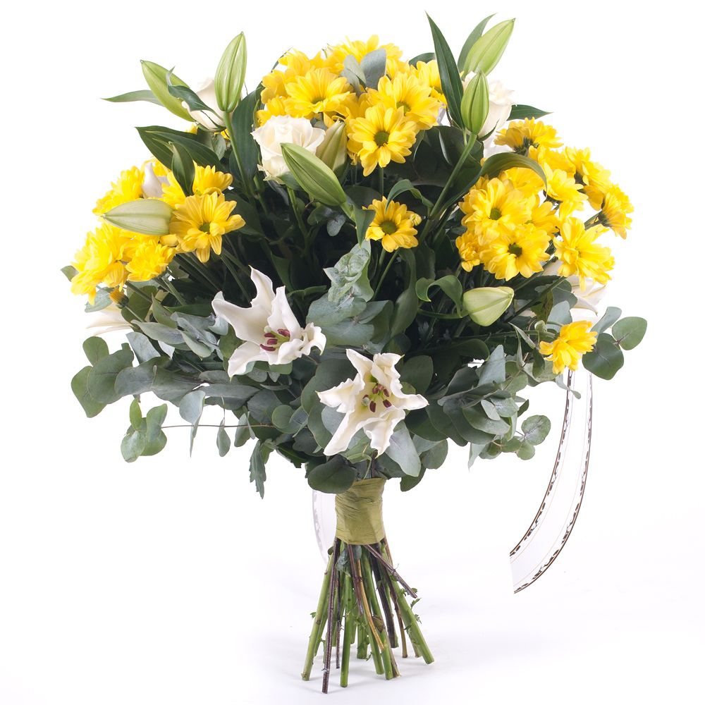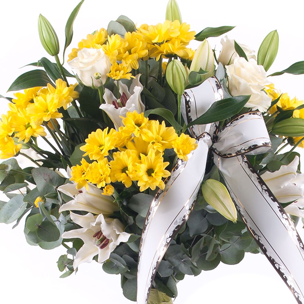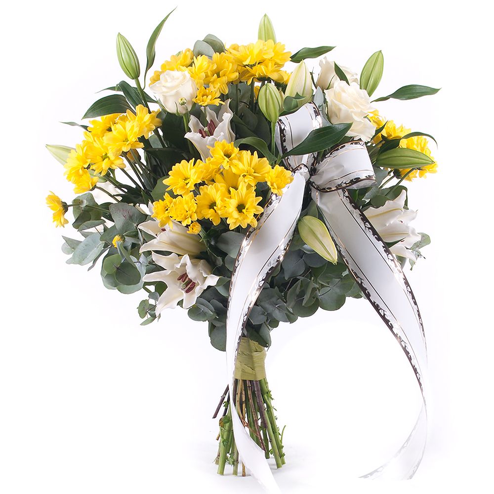 Uctíte si ty, kteří Vám chybí, elegantní smuteční kyticí aranžovanou z kombinace eukalyptu, máslových růží, bílých lilií a žlutých chryzantém.