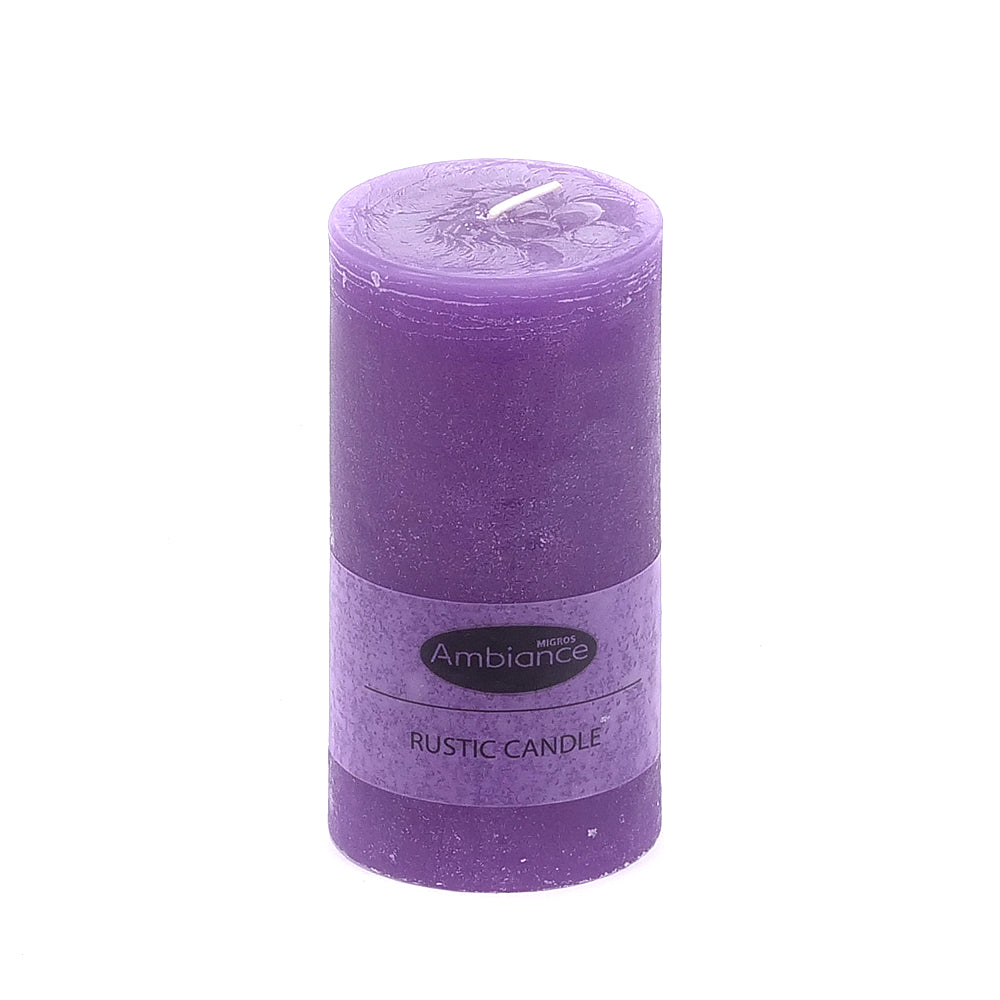 Dekorační svíčka fialové barvy ve tvaru válce.
