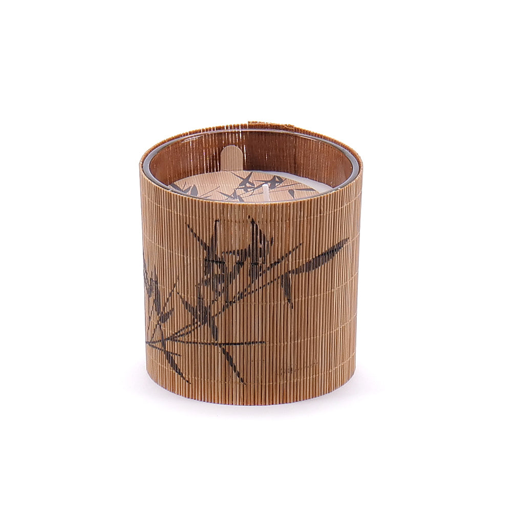 Svíčka ve skleněném obalu v dekoračním bambusovém obalu.