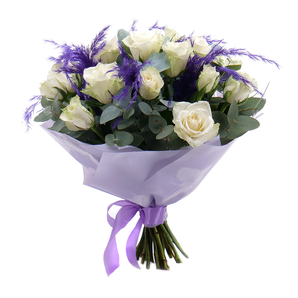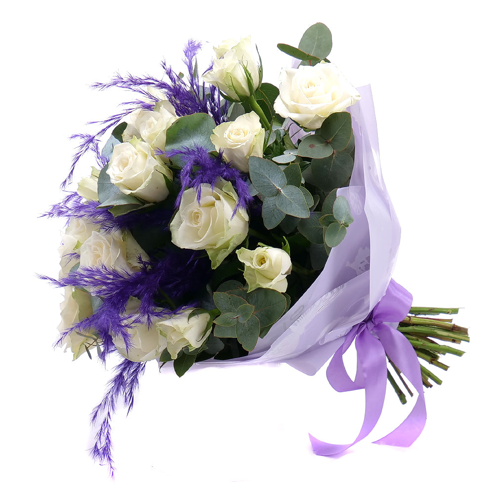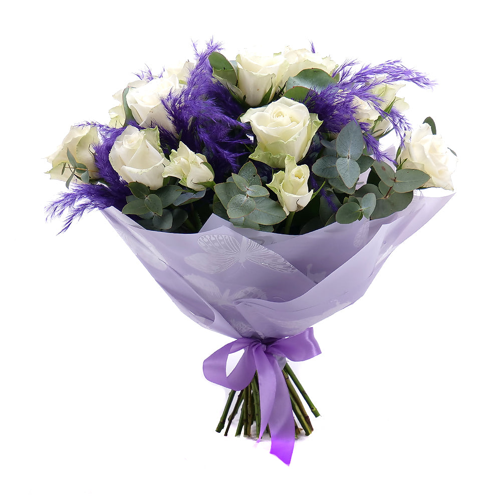 Elegantní kytice bílých růží v kombinaci s přírodními travinami a dekorativní zelení.