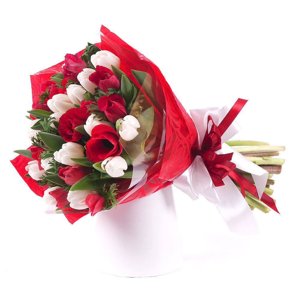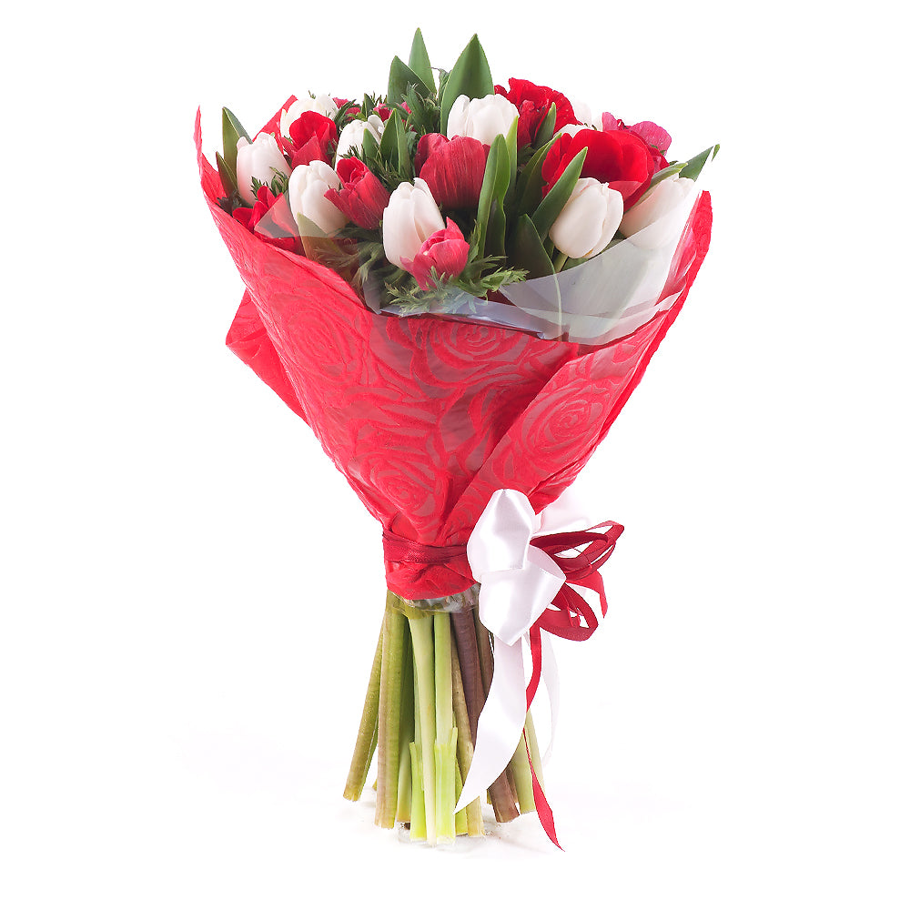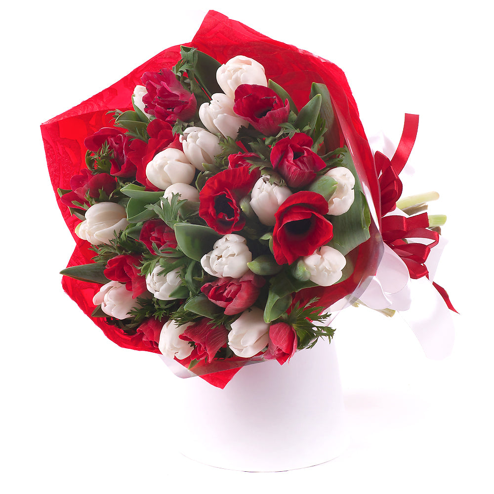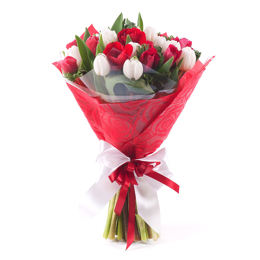 Kytica z 15 bielych tulipánov a 15 červených anemone v červenom obale so širokou saténovou stuhou.