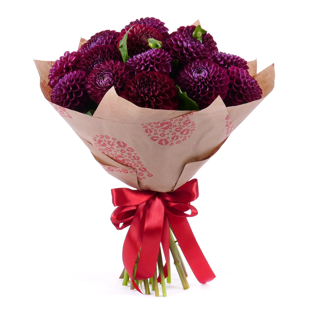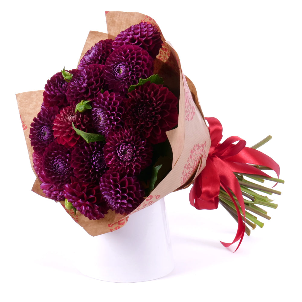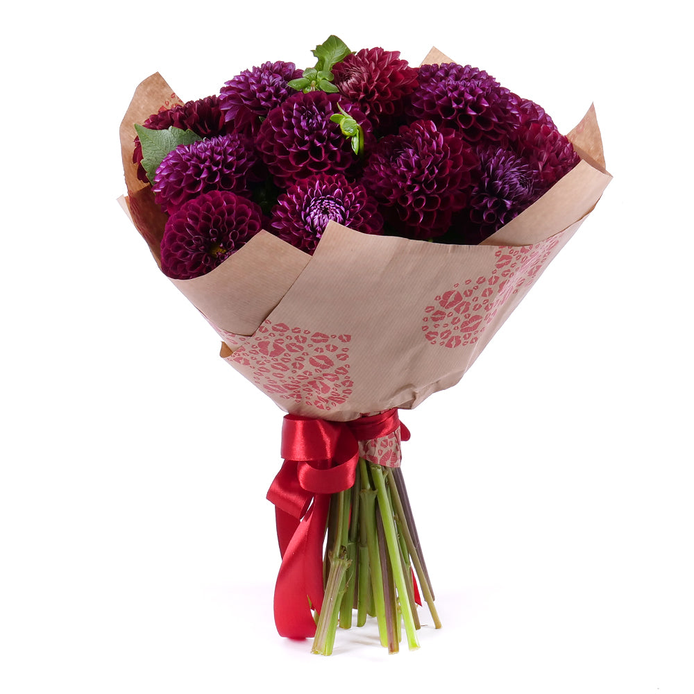 Veselá kytica aranžovaná z plných bordových dáhlií v ozdobnom papieri previazaná červenou stuhou.