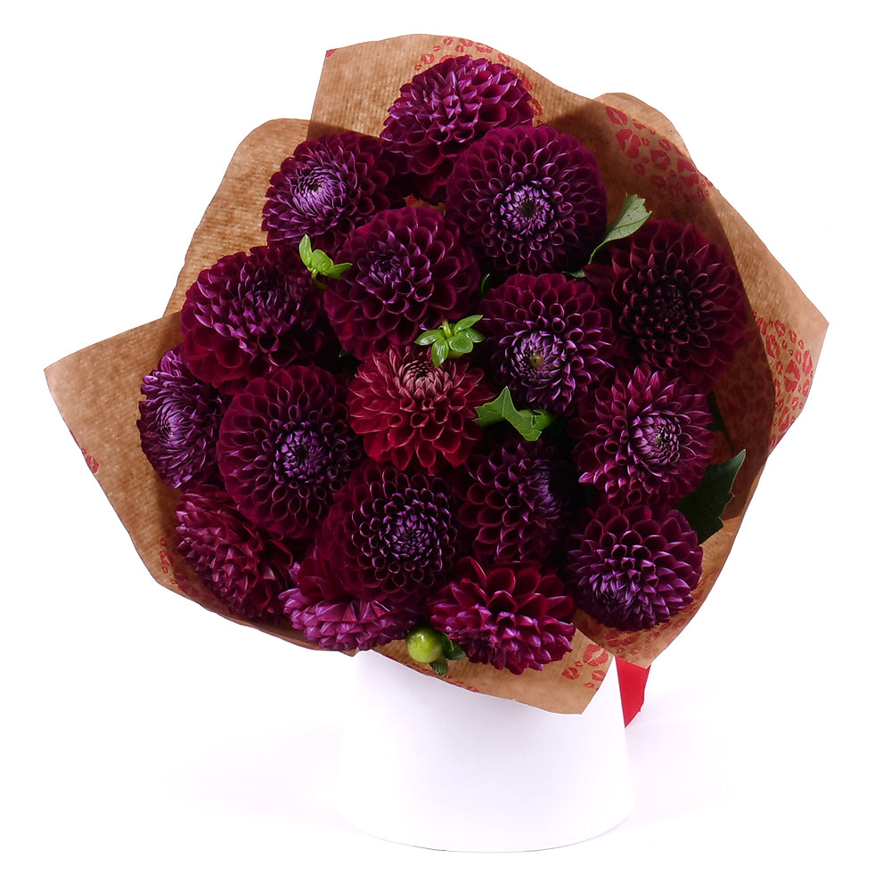 Veselá kytica aranžovaná z plných bordových dáhlií v ozdobnom papieri previazaná červenou stuhou. Přečtěte si více
