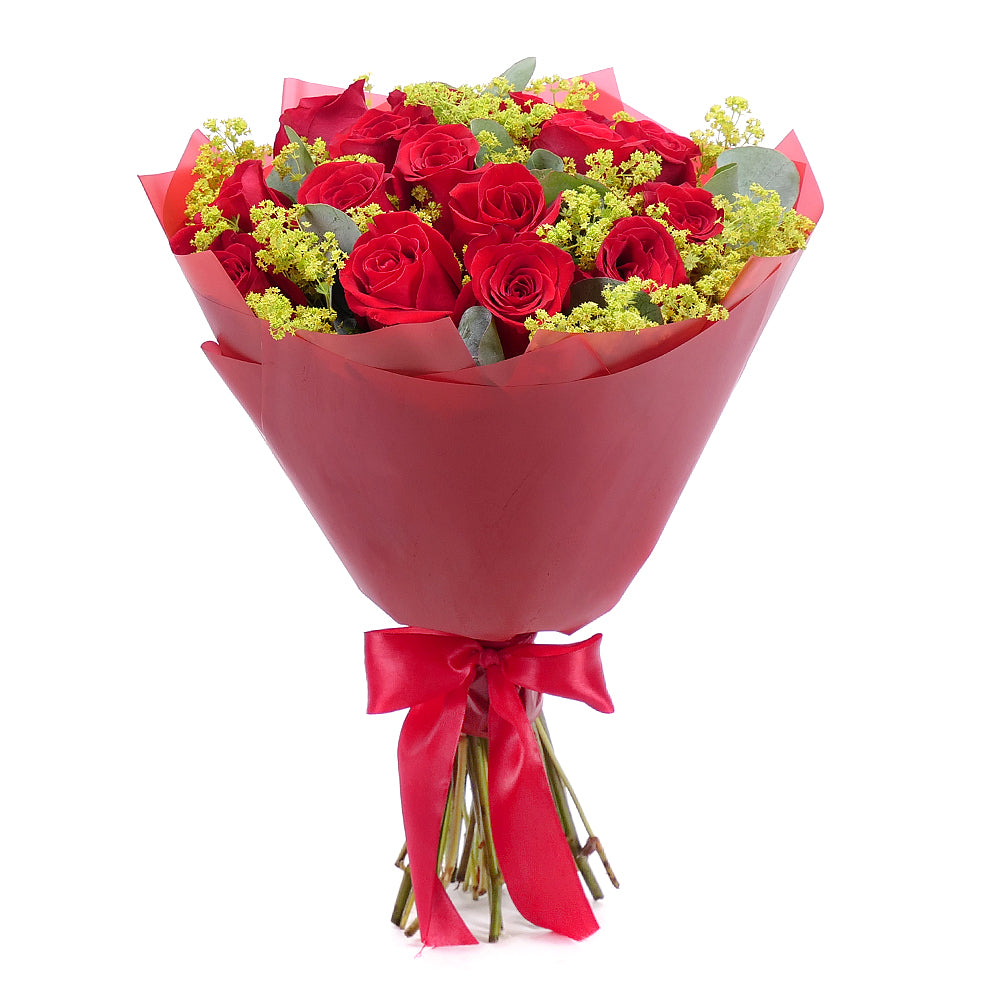 Stylová kytice z rudých růží doplněná dekorační zelení a ozdobným papírem se saténovou stuhou.
