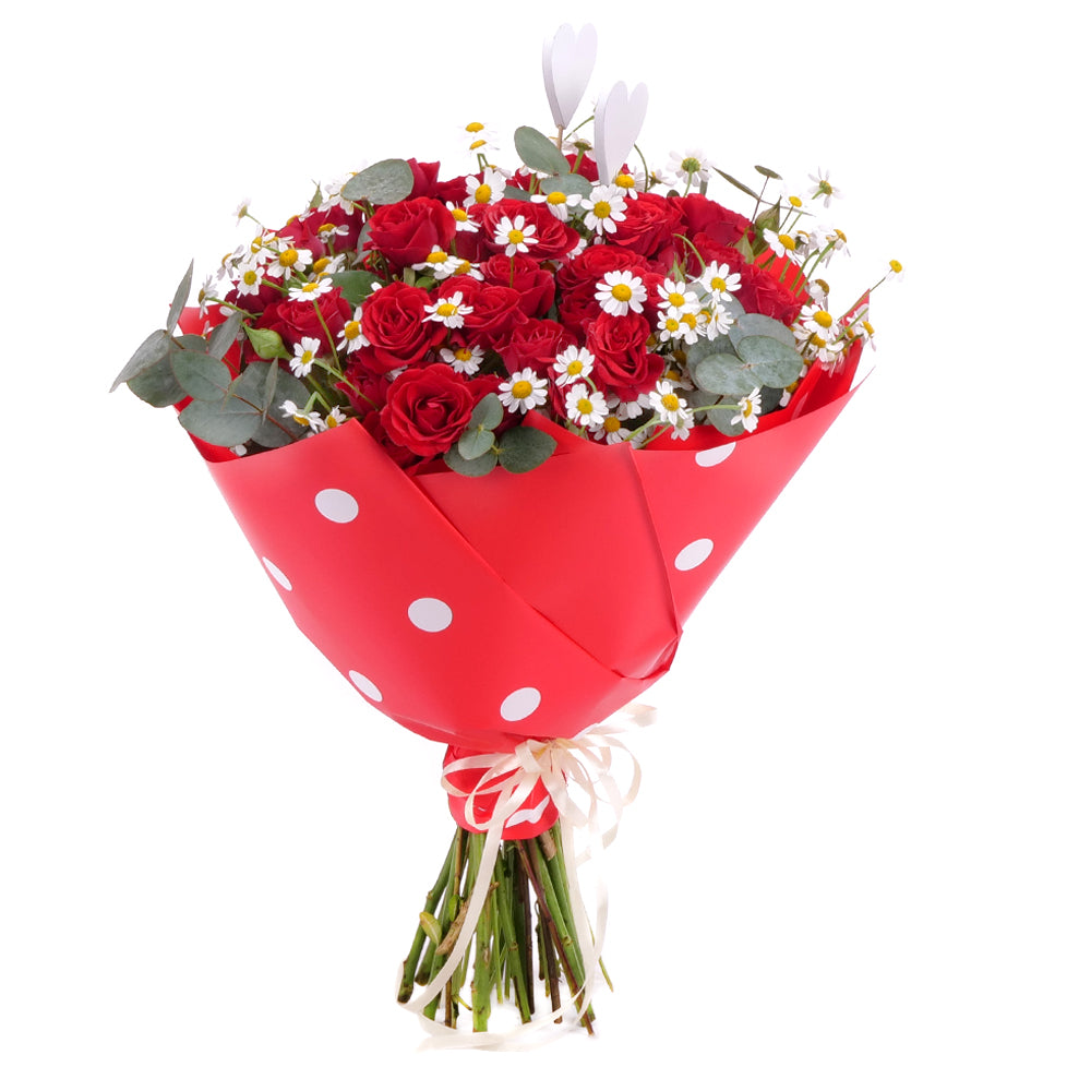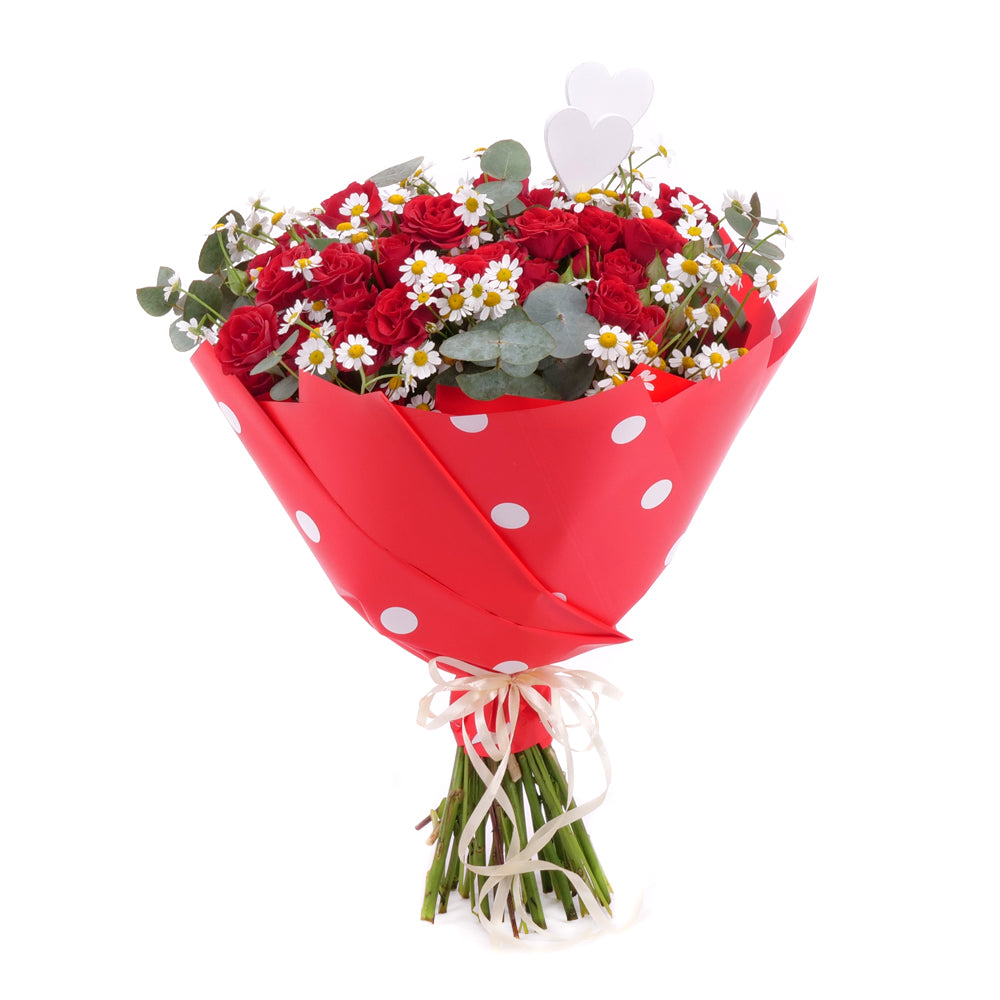 Kytice z červených trsových růží doplněná drobnými heřmánky a dekorační zelení eukaluptus. Součástí je dekorační papír a saténová stuha Přečtěte si více