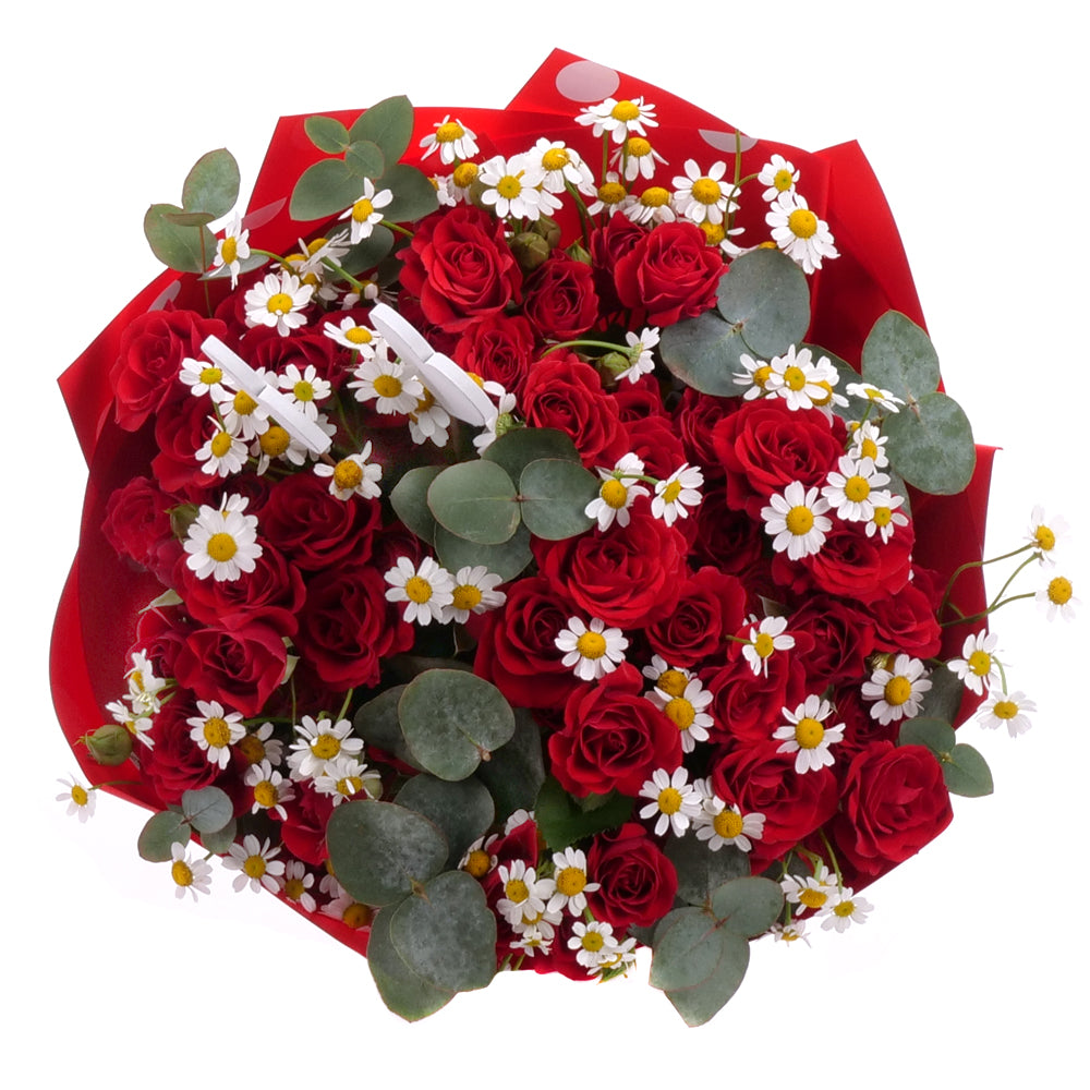 Sweet červené trsové růže, heřmánky a eukaluptus