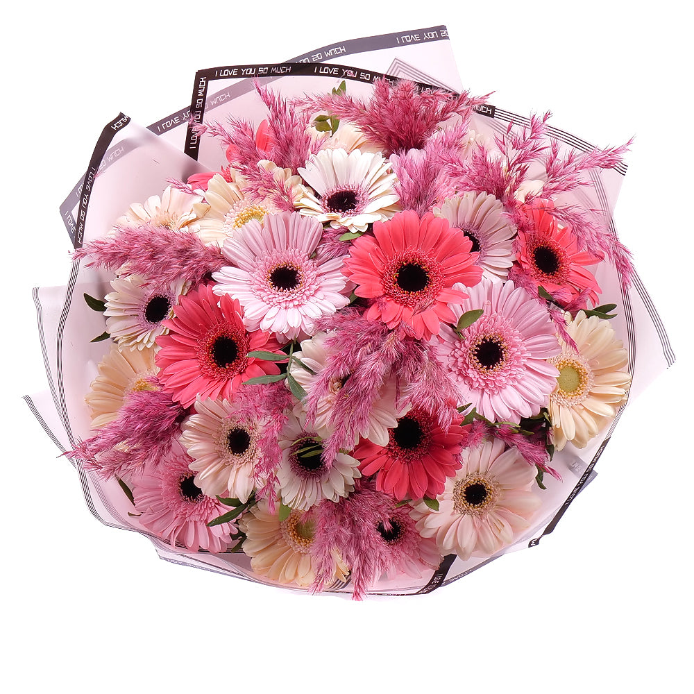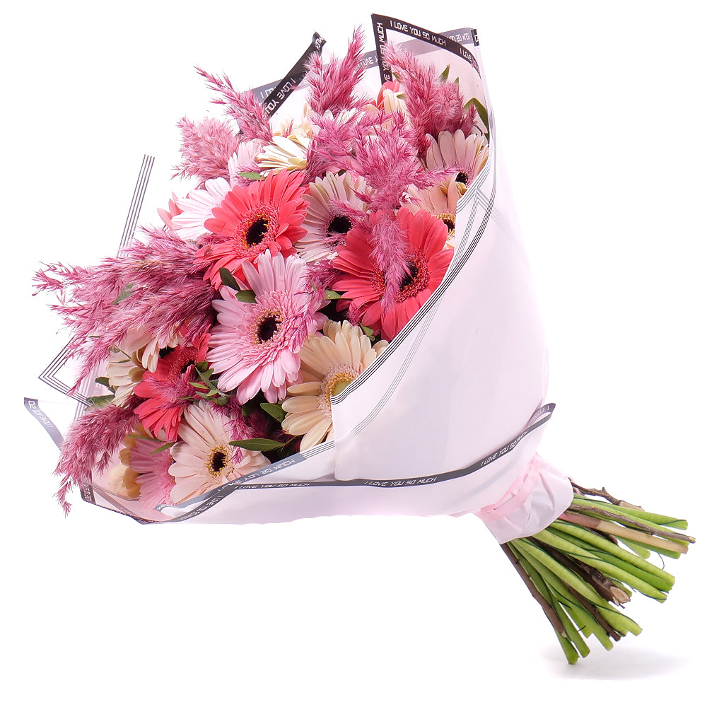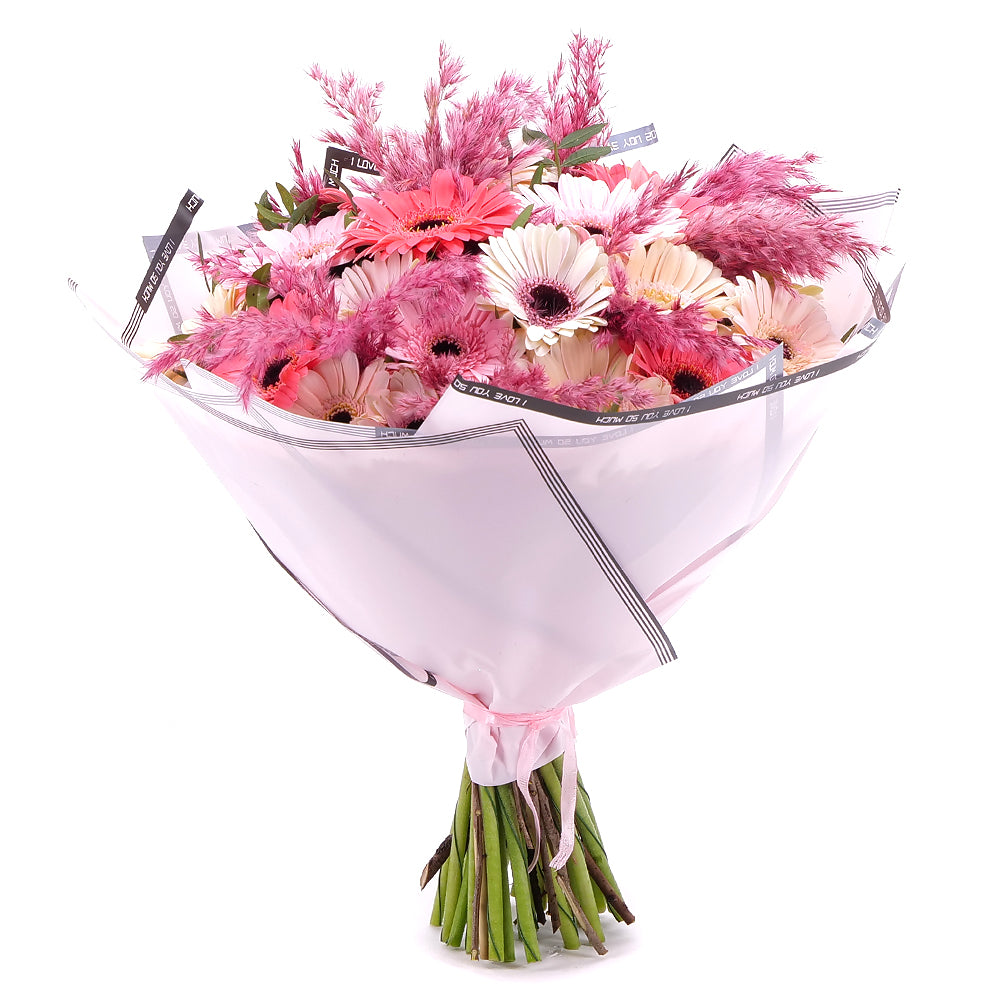 Kytice z gerber v různých odstínech růžové barvy, doplněná cortaderií, jemným papírem a stuhou. Přečtěte si více