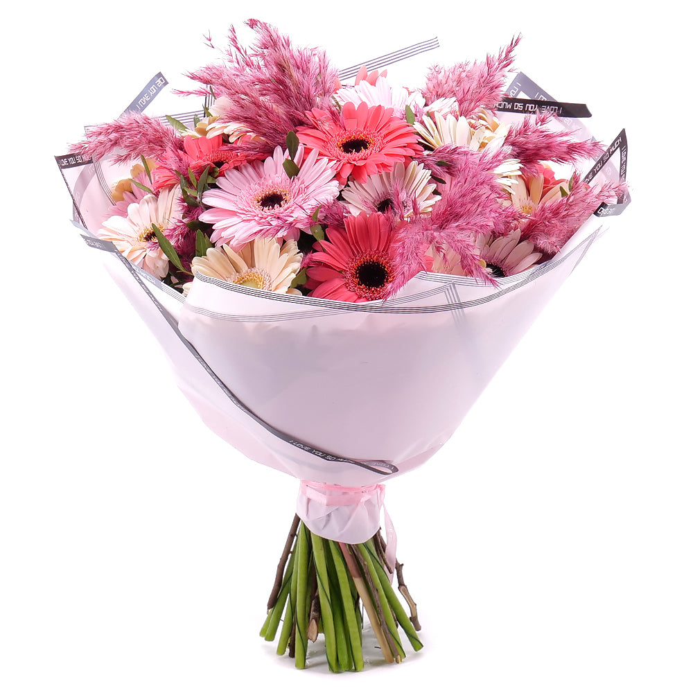 Kytice z gerber v různých odstínech růžové barvy, doplněná cortaderií, jemným papírem a stuhou.