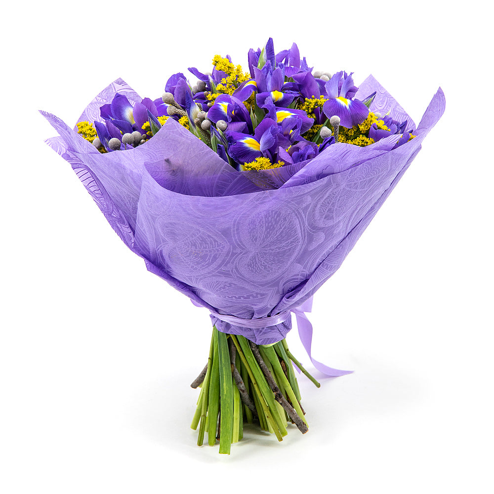 Kytica z irisov v kombinácii s dekoračnou zeleňou solidágo.