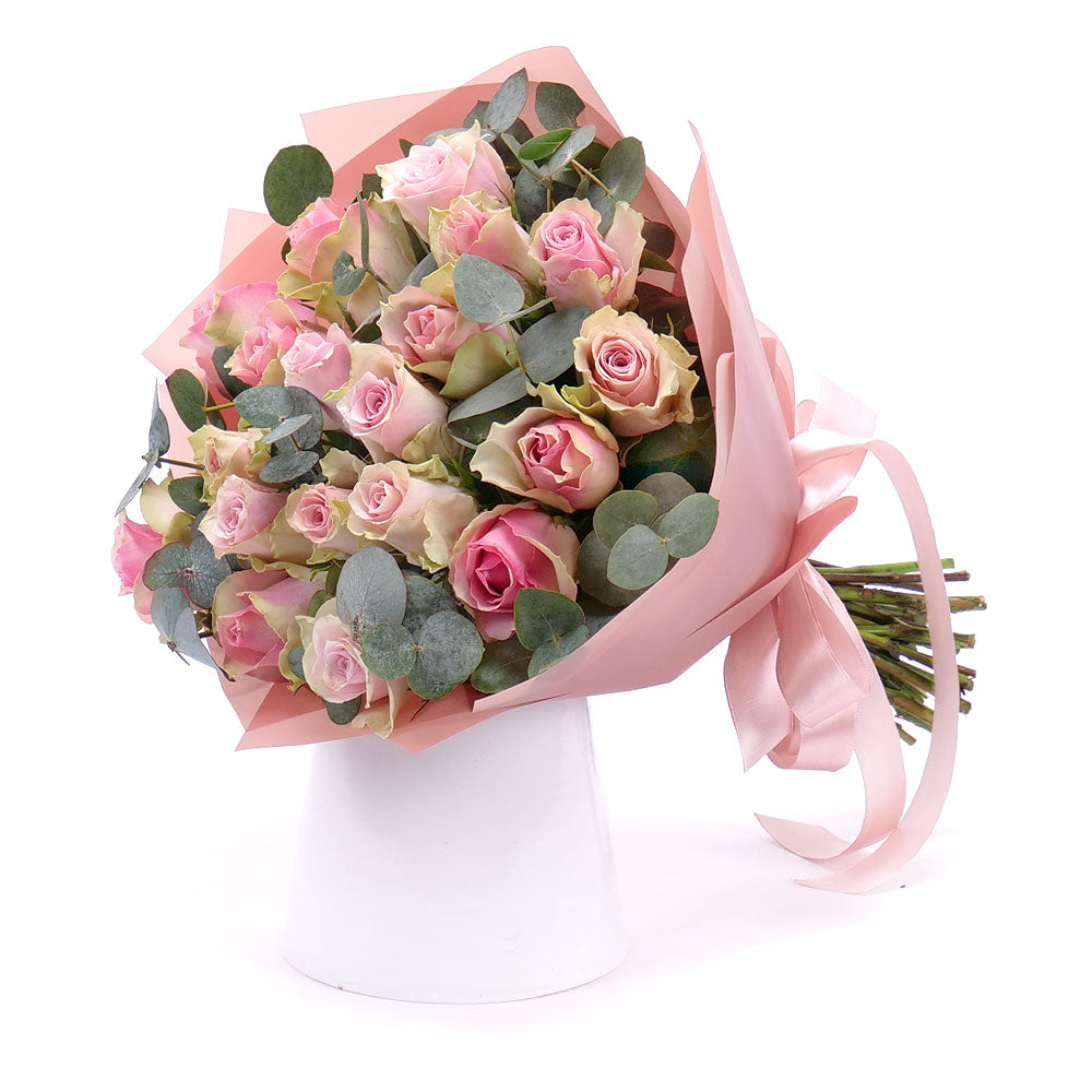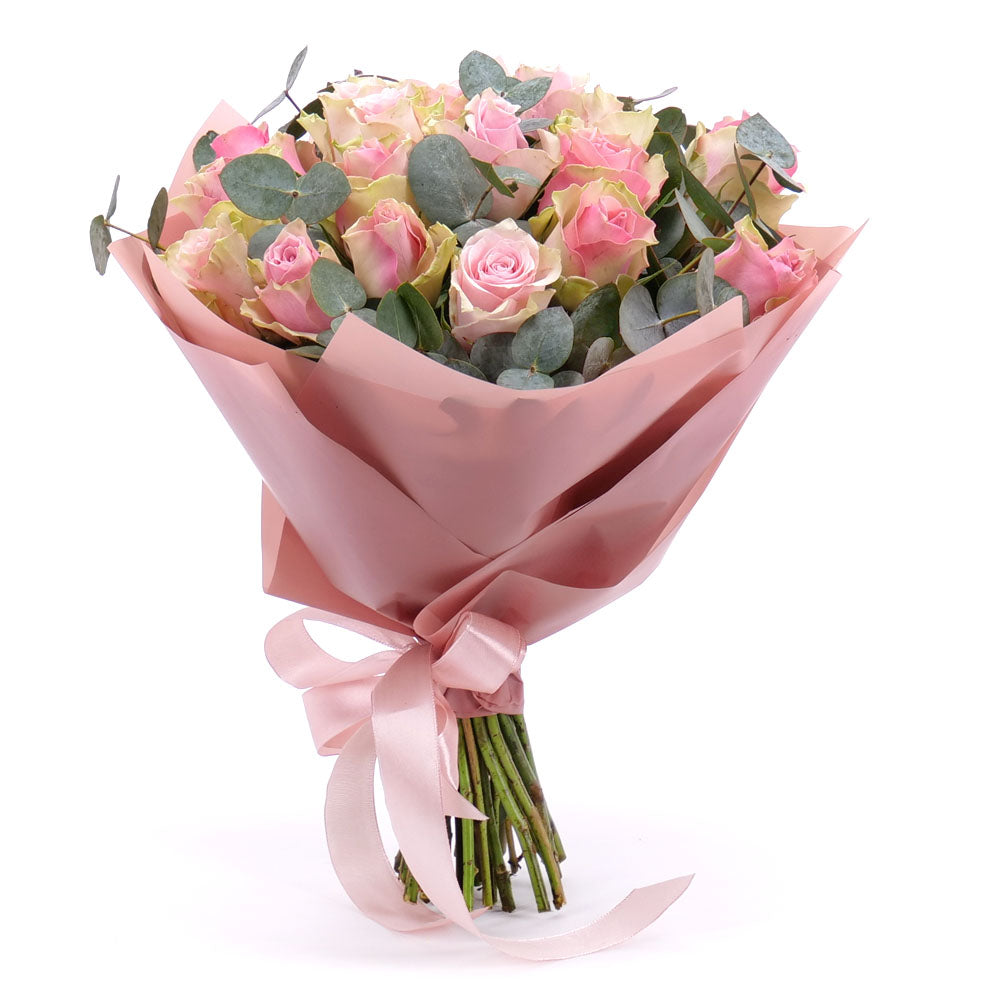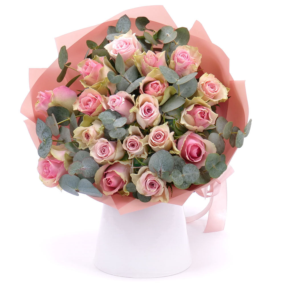 Kulatá kytice z 19 melírovaných růžových růží s eukalyptem v ozdobném papíře se saténovou stuhou.