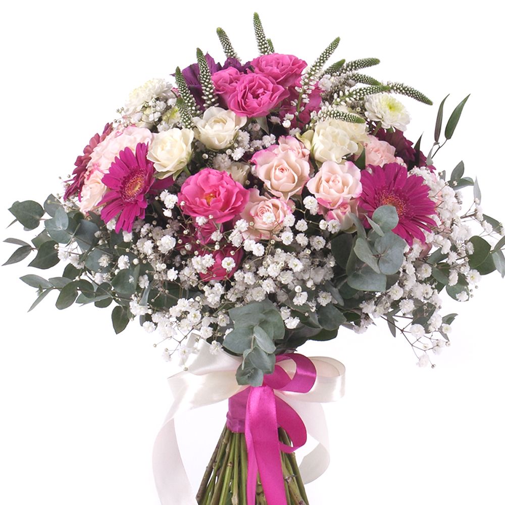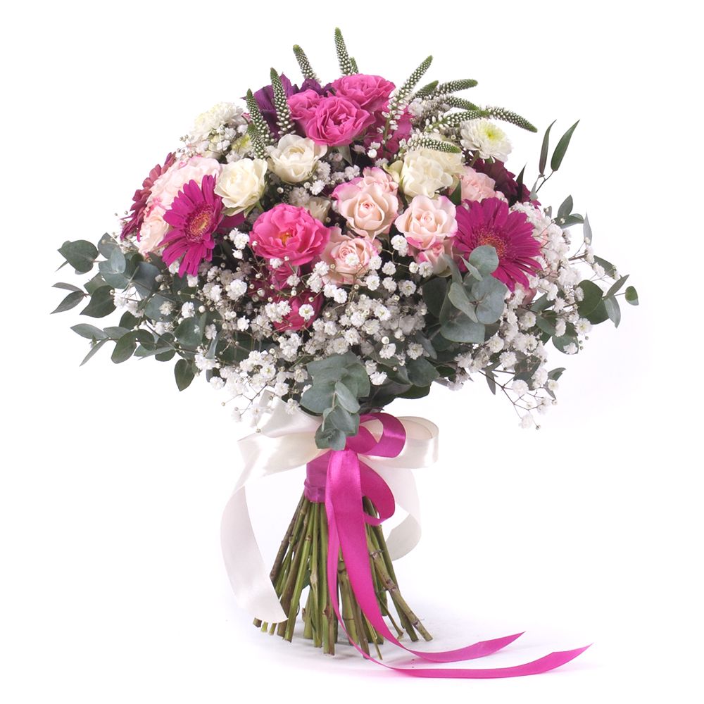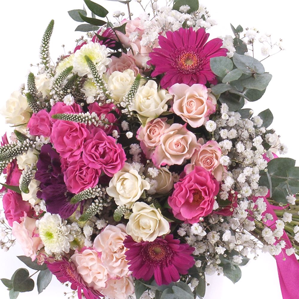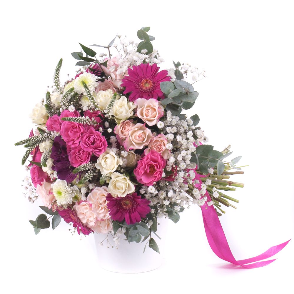 Darujte svým blízkým barevnou kytici z růžových a bílých růží, gerber, mini chryzantém, gypsophily a dekorativní zeleně. Moderní kytice vhodná pro všechny příležitosti.