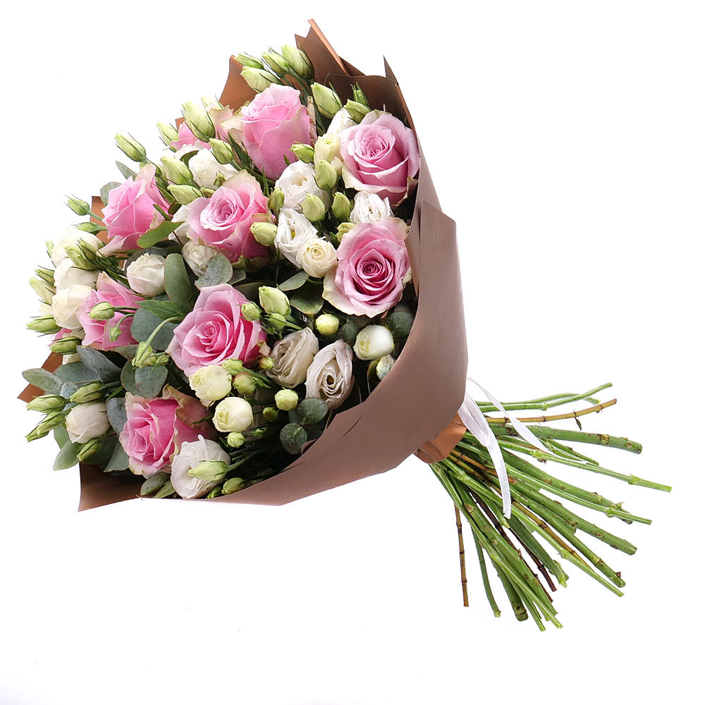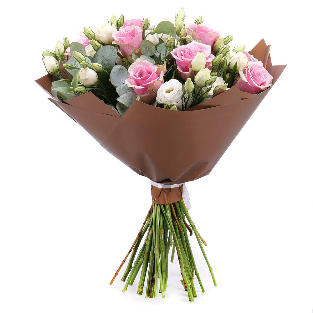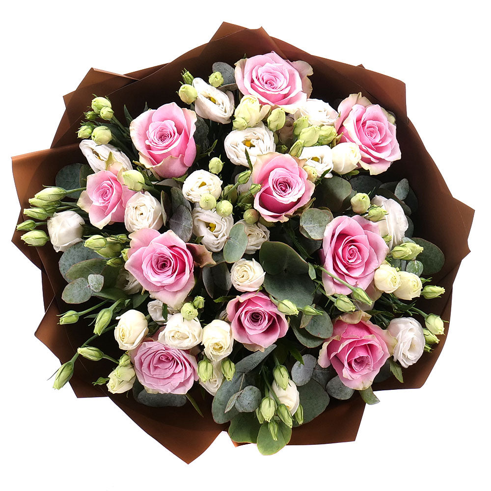 Kytice spojuje romantiku růžových růží s něžností bílých lisiantusů do dokonale vyváženého celku. Růže symbolizují lásku, úctu a něžnost, zatímco lisiantusy působí vzdušně a čistě, dodávajíc kytici svěží a elegantní nádech. Kytice je vázána s citem pro detail, doplněná dekorační zelení.