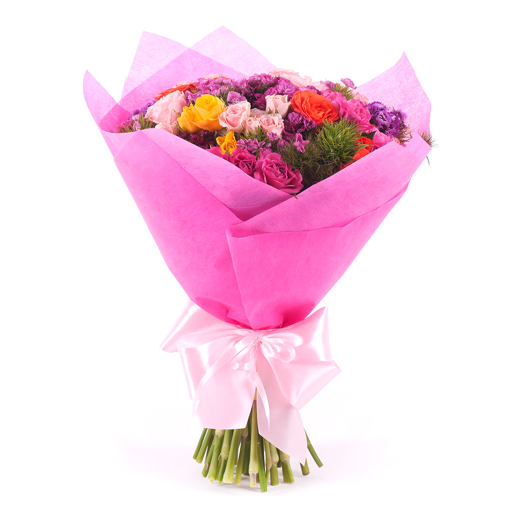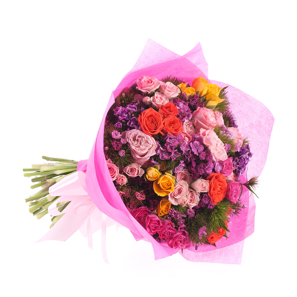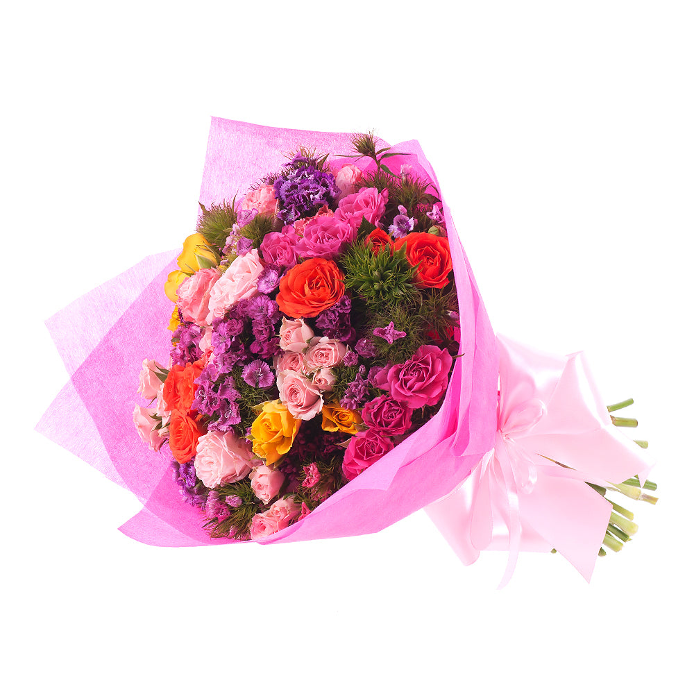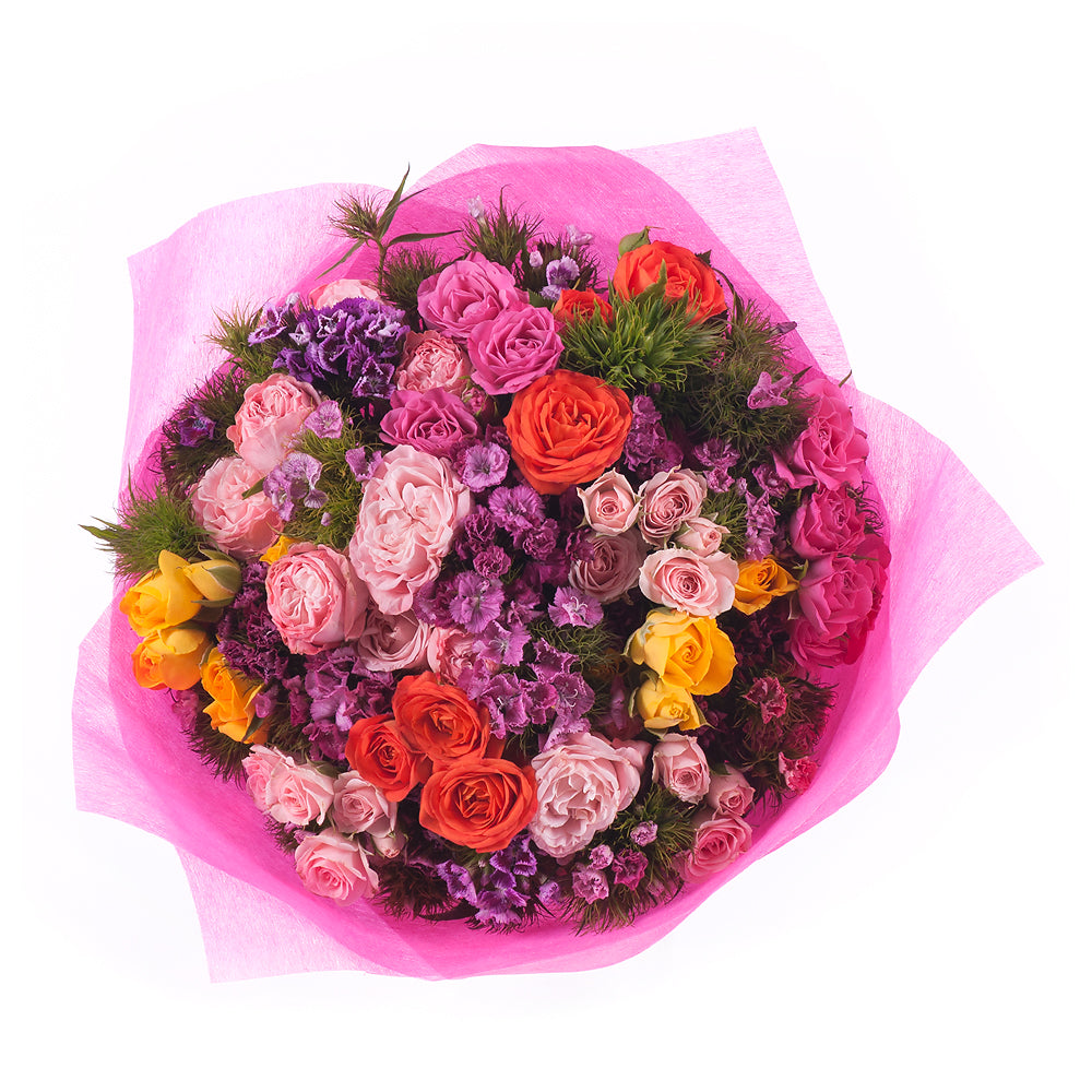 Svěží letní kytice aranžovaná s barevných trsových růží a hřebíčku.