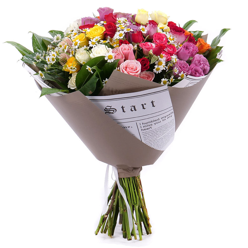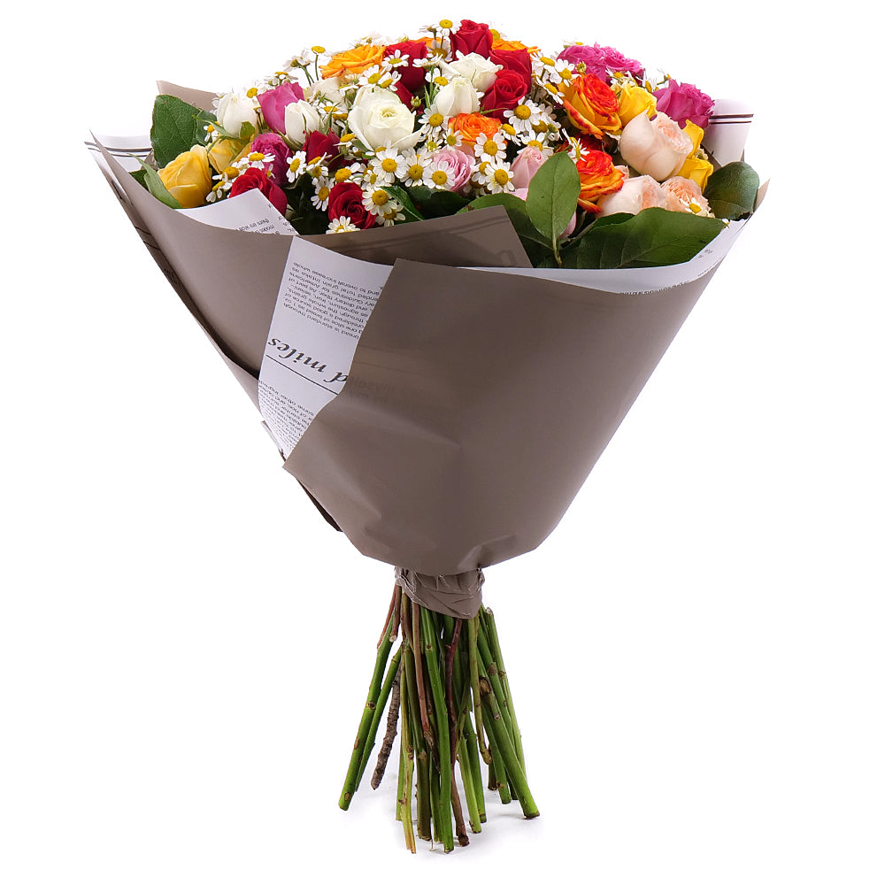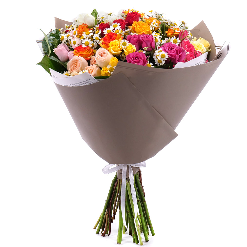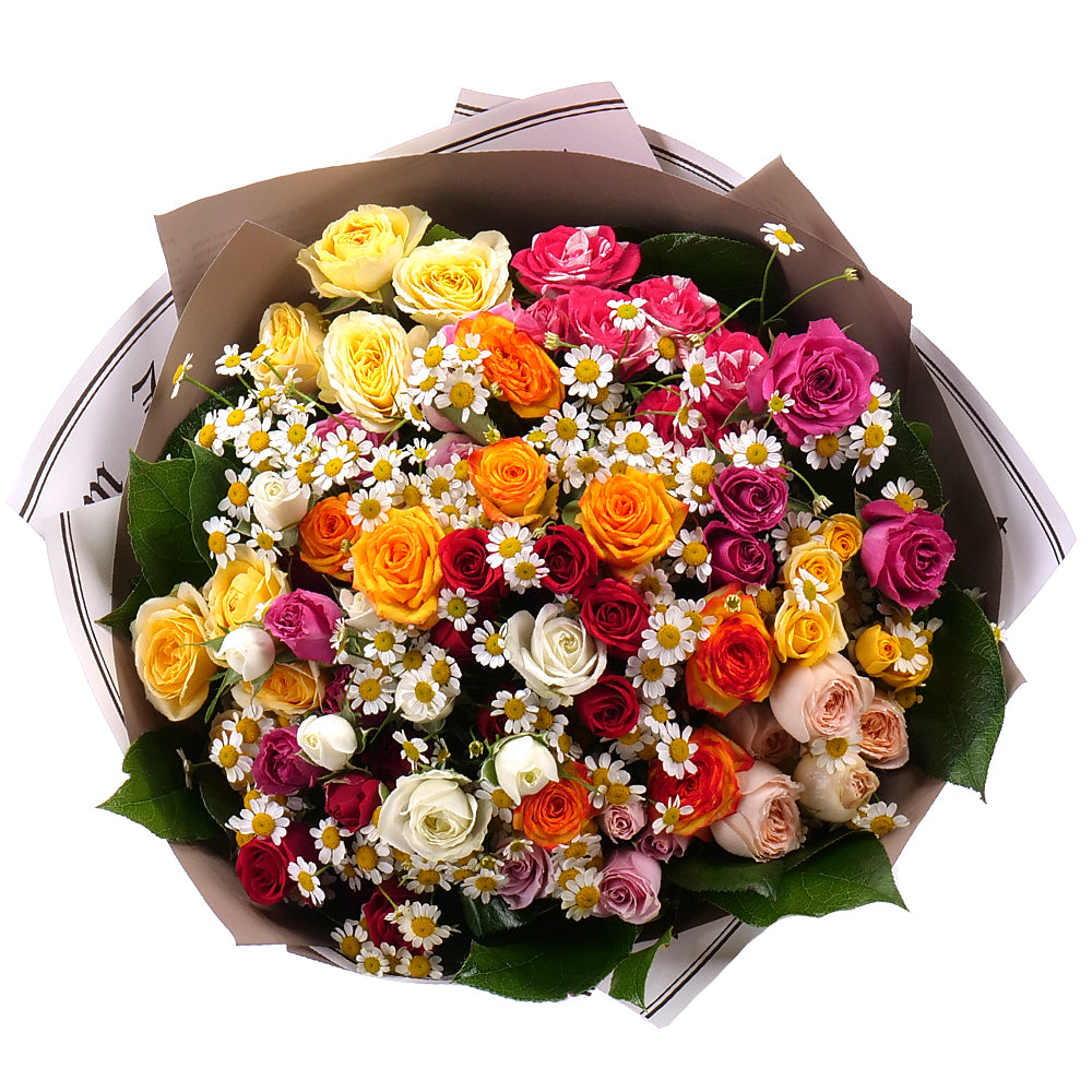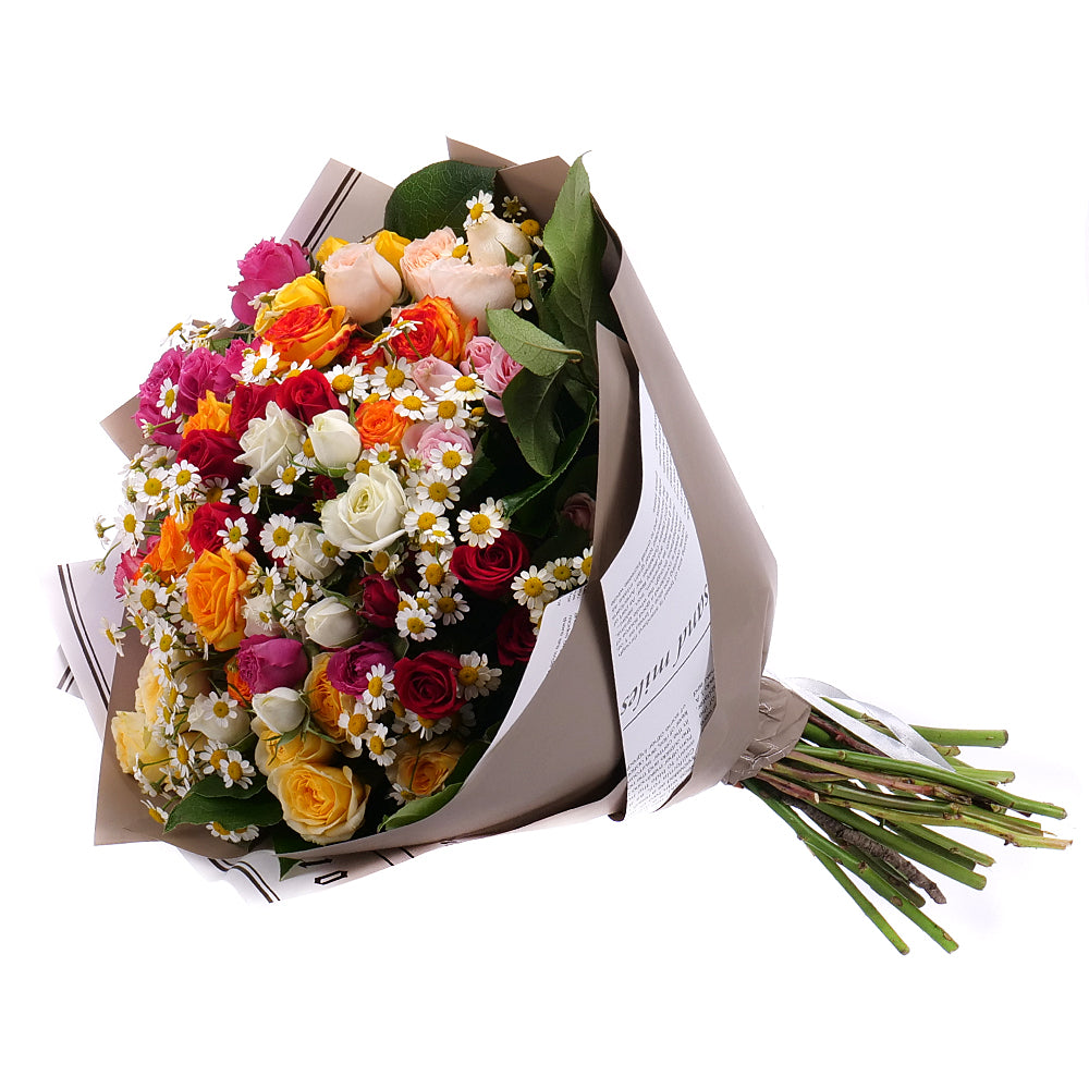 Pestrá kytice z barevných trsových růží v kombinaci s heřmánky a zelení. Kytice je doplněna dekoračním papírem a saténovou stuhou.