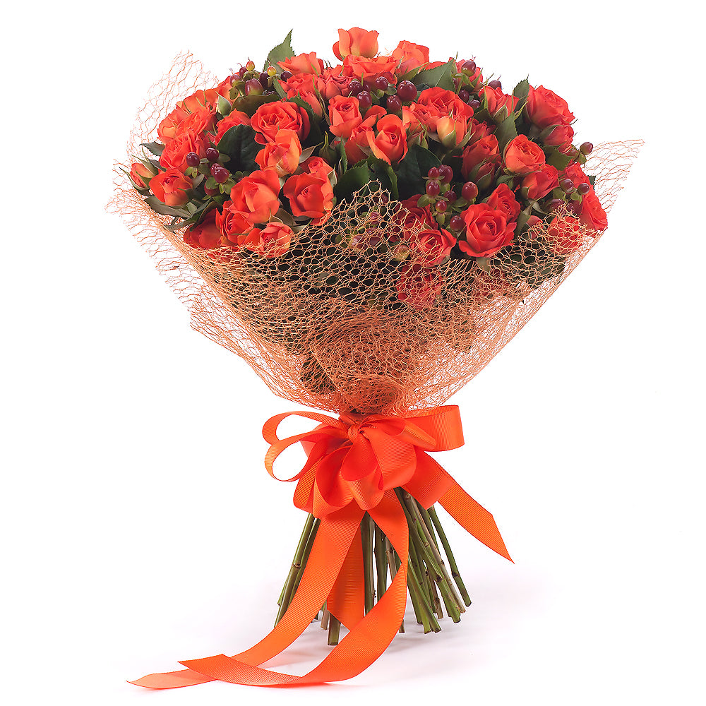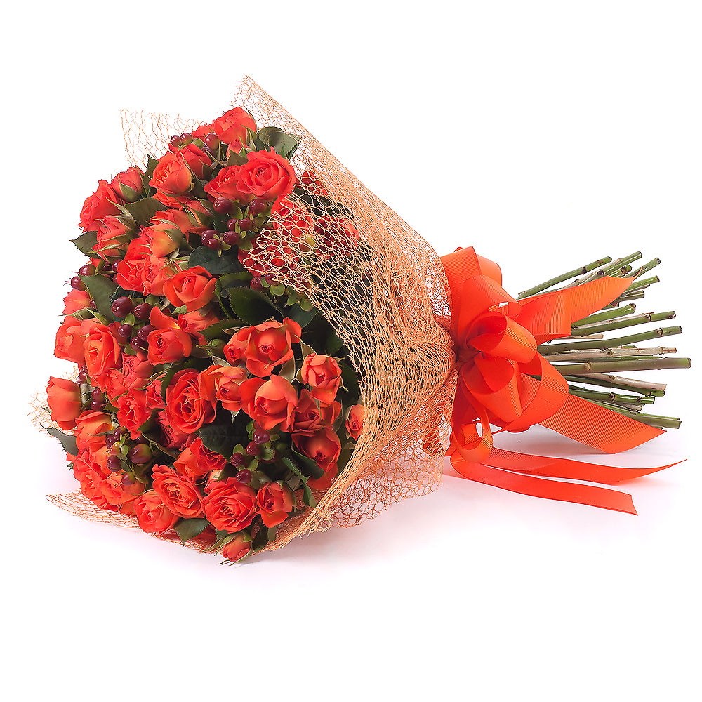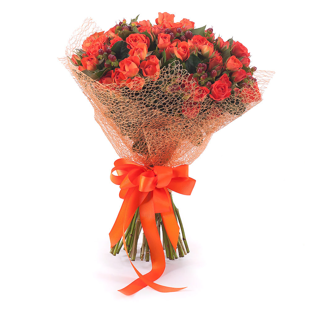 Kytice aranžovaná z trsových růží v oranžové barvě a doplněná ozdobnou stuhou.