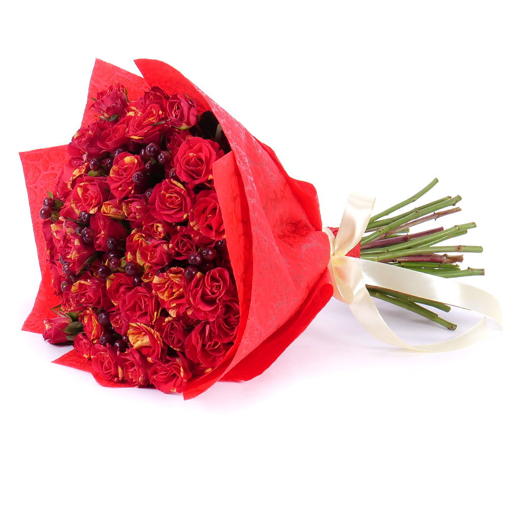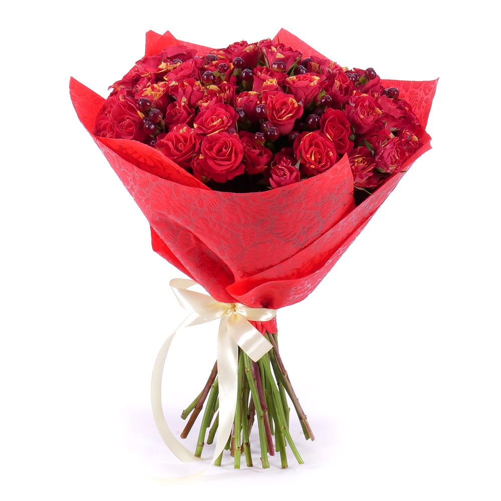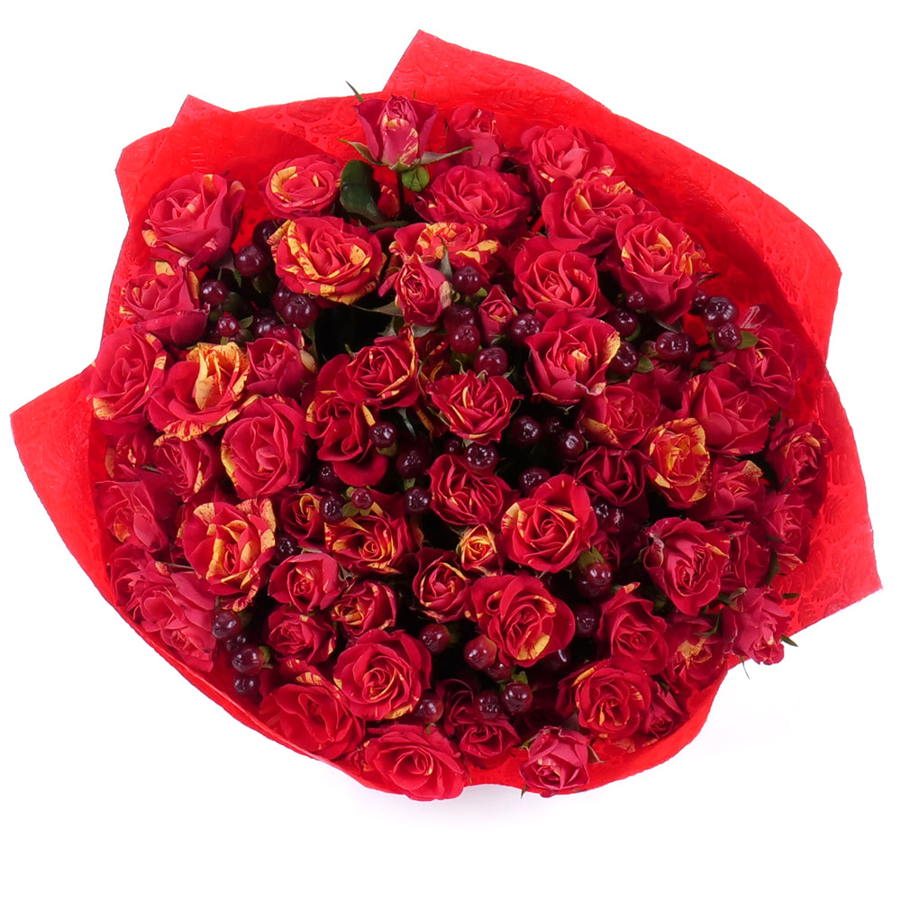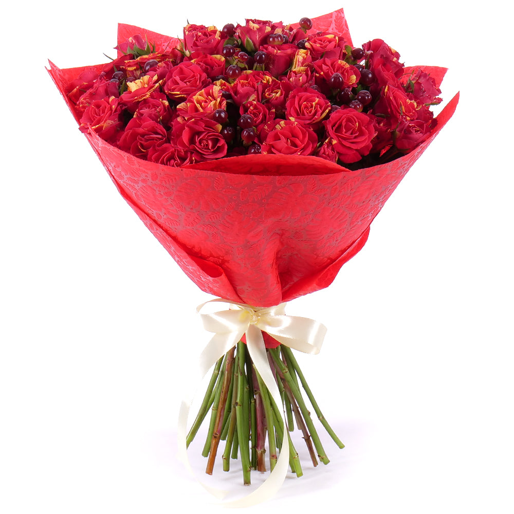 Kytica z trsových melírovaných oranžovo-červených ruží s hyperikom.SloženíRuža trsová Fire Flash - 19 ks Přečtěte si více