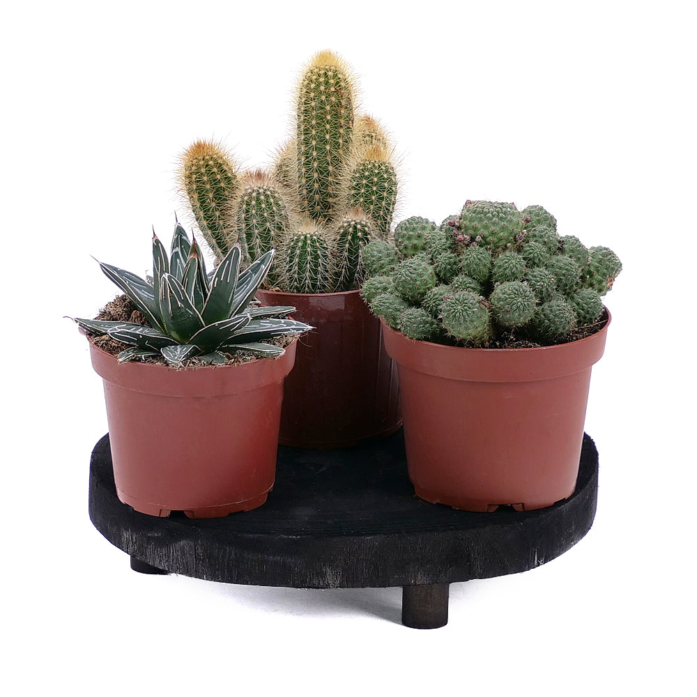 Směs kaktusů v plastových květináčích na dřevěném podstavci s nožičkami. Sbírka potěší každého milovníka kaktusů.